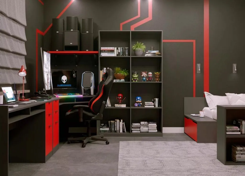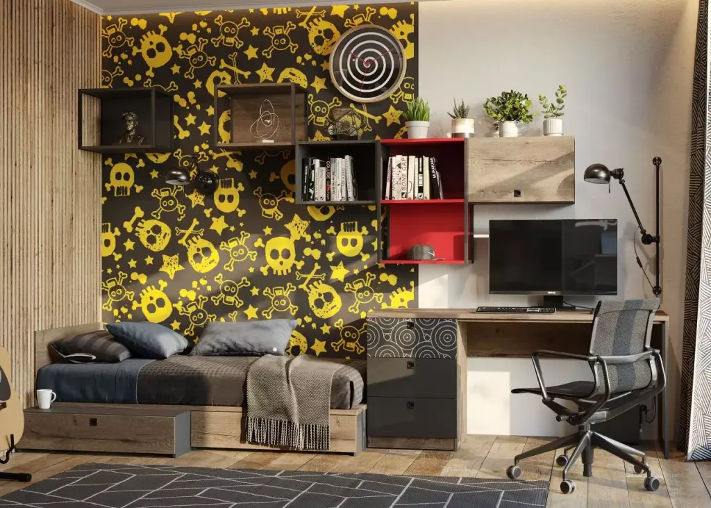 Отдельно среди современных стилей стоит упомянуть хай-тек. Это направление во многом граничит с футуризмом: здесь применяются новейшие материалы и технологии, используются решения для умного дома, электроника всегда последней модели. В качестве декоративных элементов широко применяется подсветка, а также неоновые надписи. При оформление стен в этом стиле в комнате подростка графические элементы могут повторяться также на потолке или полу, создавая единое пространство. Для детей, увлекающихся видеоиграми, актуальны будут также постеры с любимыми героями и коллекционные фигурки.