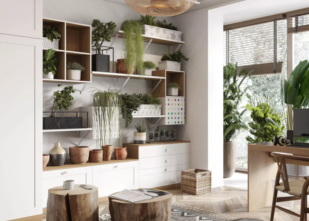 Предметы: живые растения, мебель из ротанга, легкие металлические столики необычной формы.