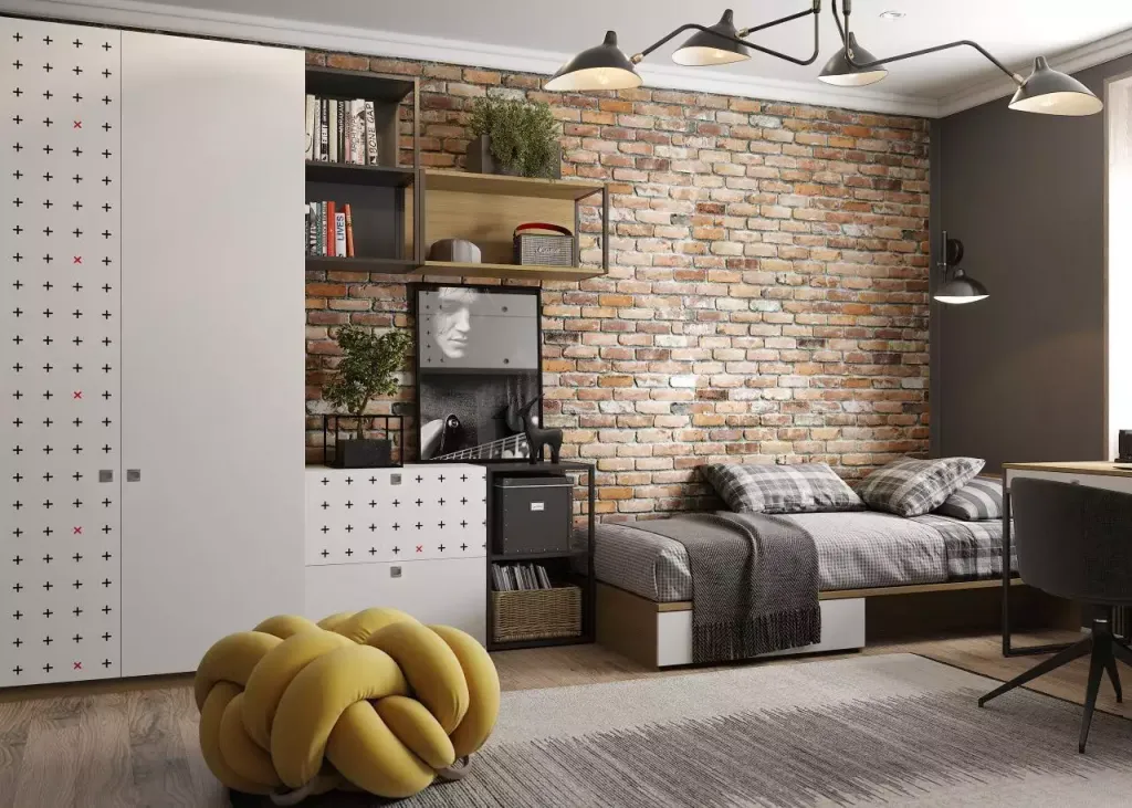 Лофт и индастриал неизменно популярны среди покупателей, так как оформить комнату подростка в современном стиле может быть проще, чем в традиционном: ассортимент товаров значительно больше. К тому же, материалы в данном случае более демократичны. Здесь часто используется пластик, ДСП и МДФ, металл. Стены нередко вовсе не имеют финишной отделки, открывая черновое покрытие: кирпич, бетон, панели. Также может применяется простая штукатурка без узора или рельефа. А вот идея обоев в комнате подростка этим направлениям совершенно чужда. Исключение можно сделать разве что для акцентной стены, но узор или графическое изображение должно быть эффектным. Картины в традиционном смысле в таких интерьерах можно встретить нечасто, зато широко распространены огромные постеры с городскими пейзажами.