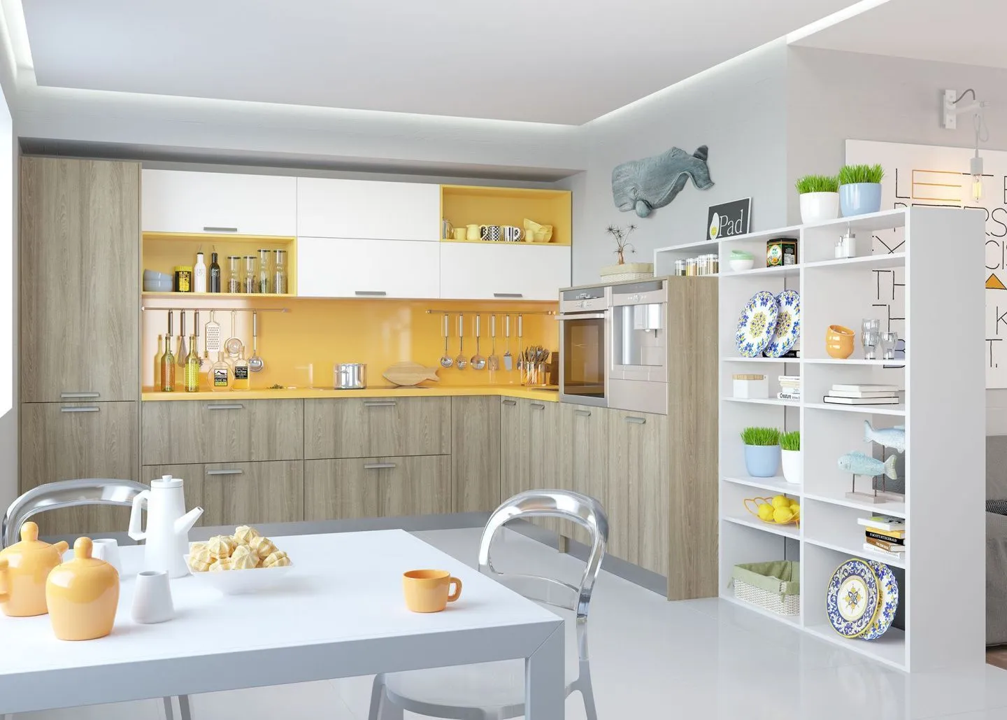 Обеденная зона для кухни может быть выделена различными перегородками. Они разграничат пространство, гармонично подчеркнув его строение. В качестве перегородок могут выступать предметы мебели, шкафы, стеллажи или специальные разграничители пространства из дерева или других любых материалов.