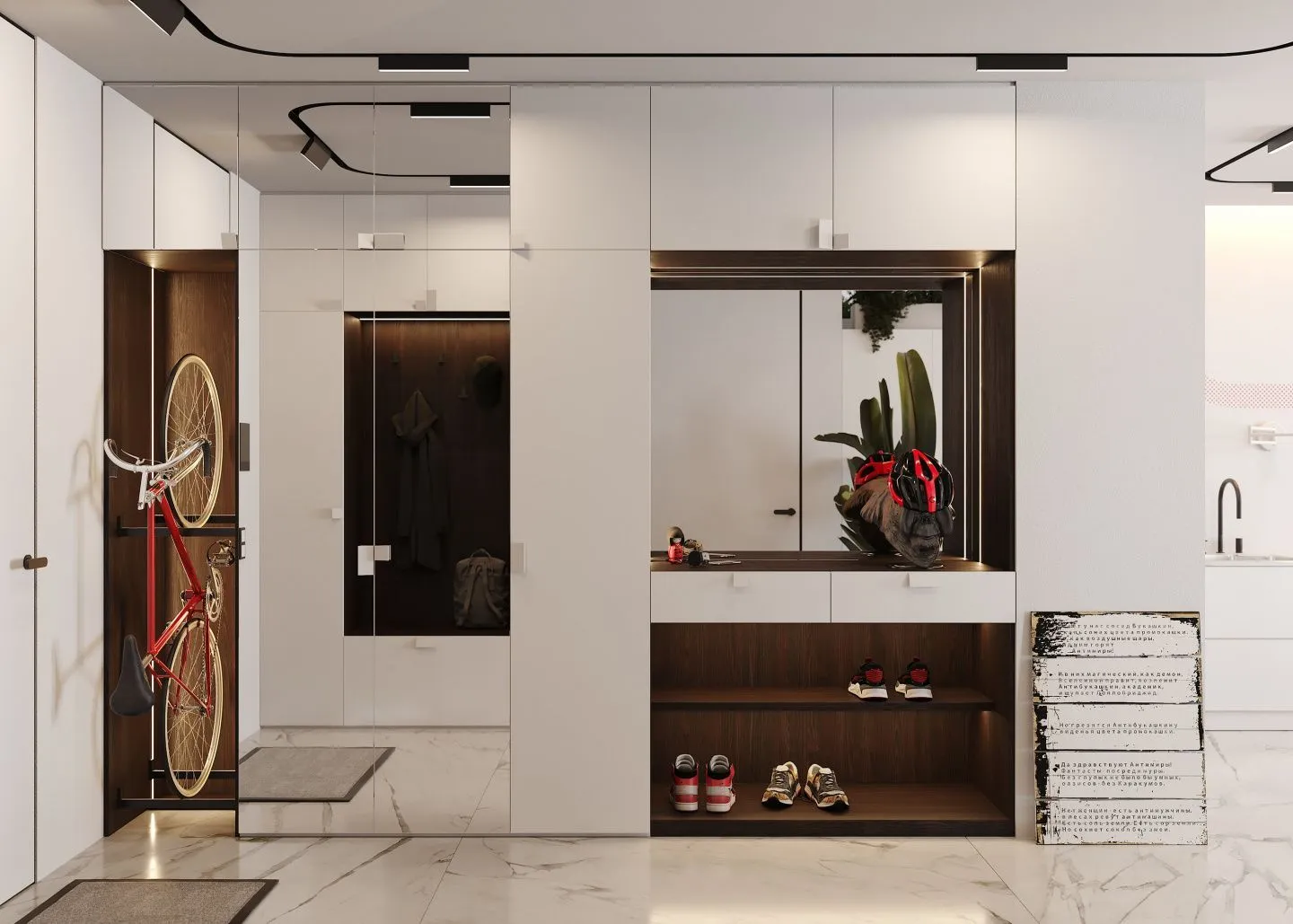 Минималистичная прихожая с зеркалом в современном стиле отличается функциональностью и практичностью. Как и лофт этот стиль тяготеет к лаконичным формам и рамам без декора, но в менее брутальном дизайне. Нередко отражающие поверхности используются вовсе без рамы в качестве элемента оформления стен.