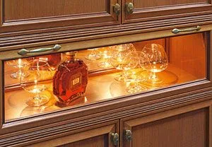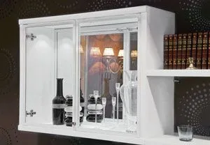 Известный дизайнерский приём – использование зеркал для визуального расширения пространства. В корпусной мебели для придания дополнительной глубины секциям, в которых будет демонстрироваться посуда из фарфора и стекла или сувениры, часто используют зеркальные задние стенки. Причём такое решение прекрасно зарекомендовало себя как в классических композициях, так и в модерне.