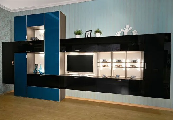 В оригинальных композициях в стиле модерн для гостиных, в разнообразных стеллажах, в гардеробных часто предполагается скрытая рассеянная подсветка.