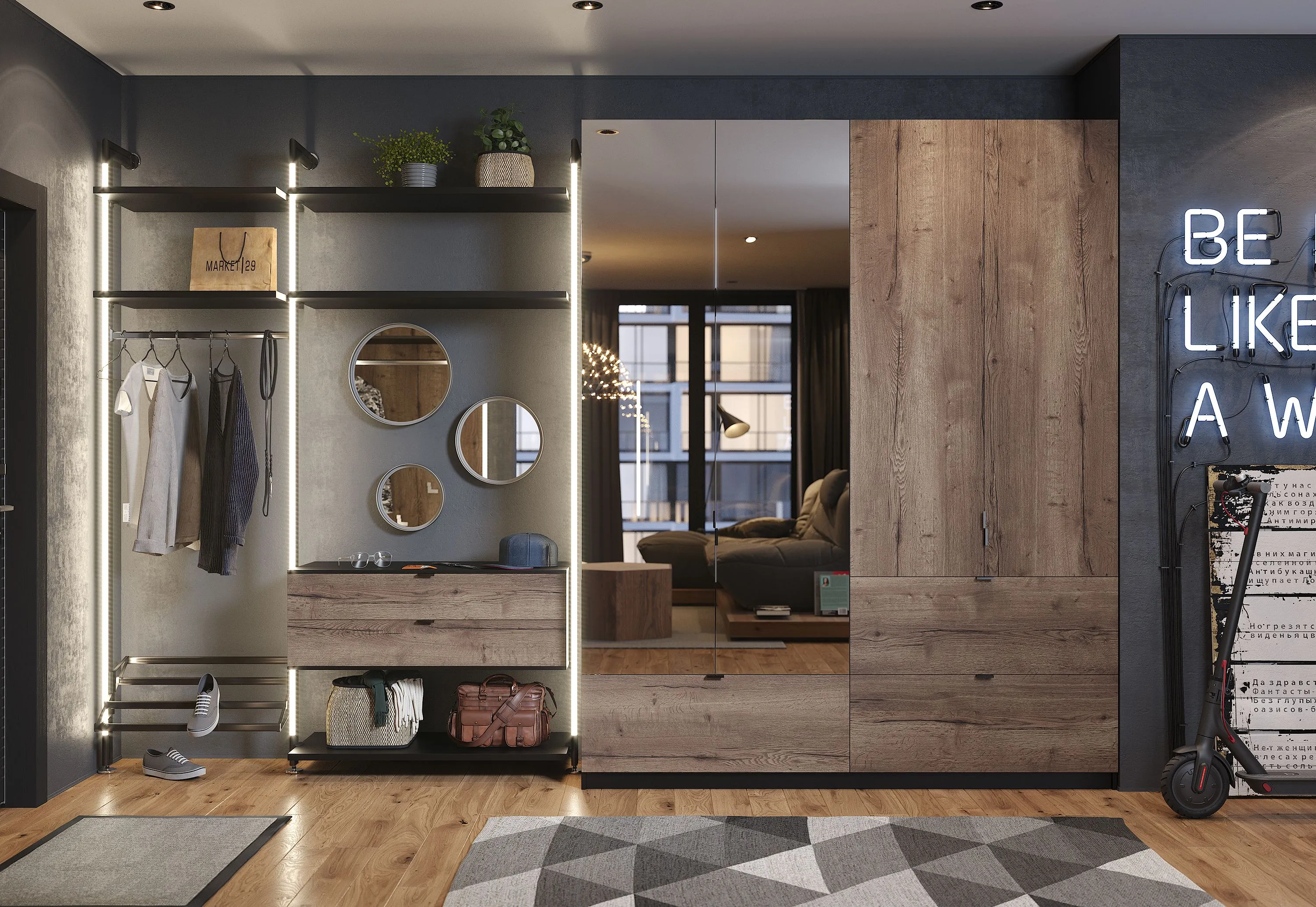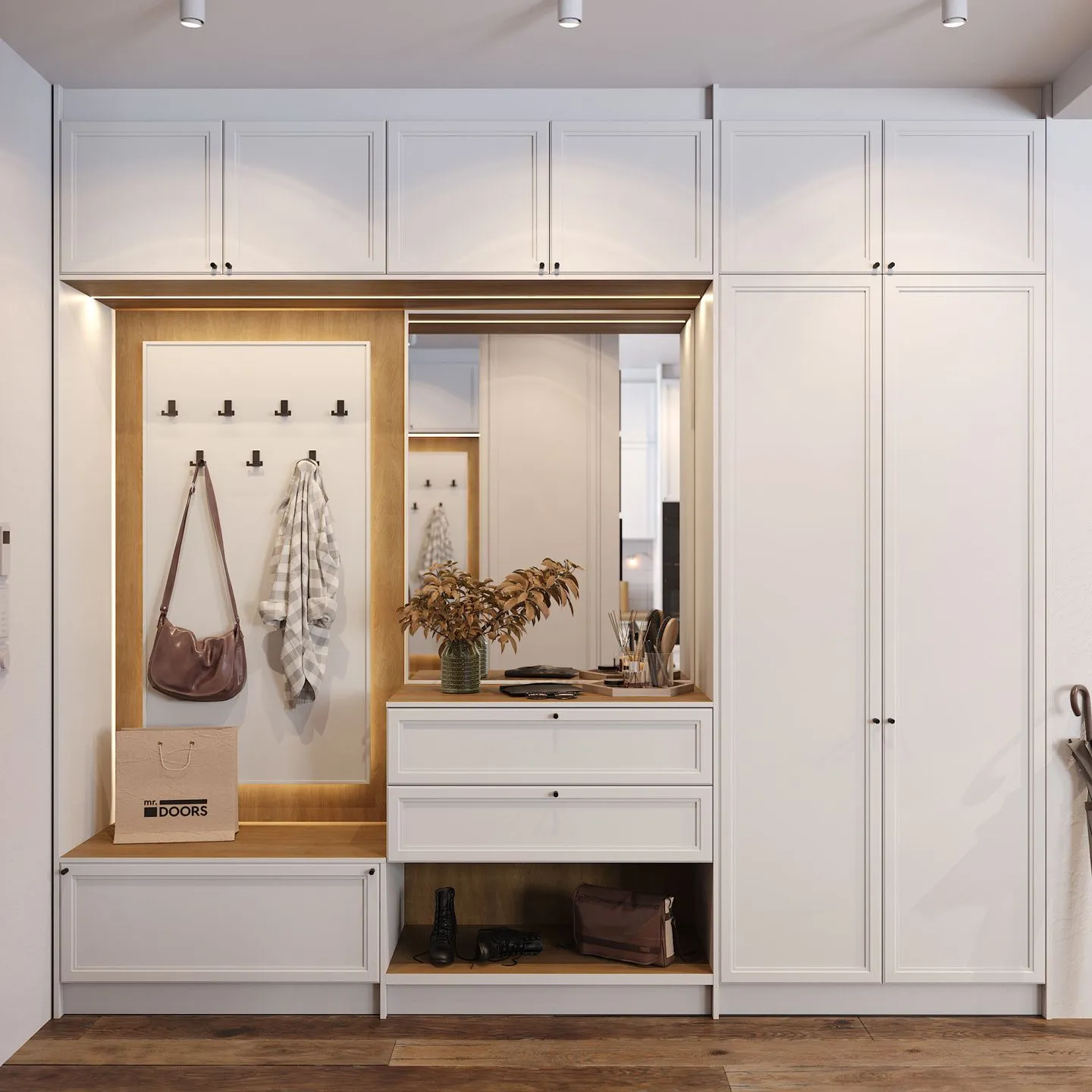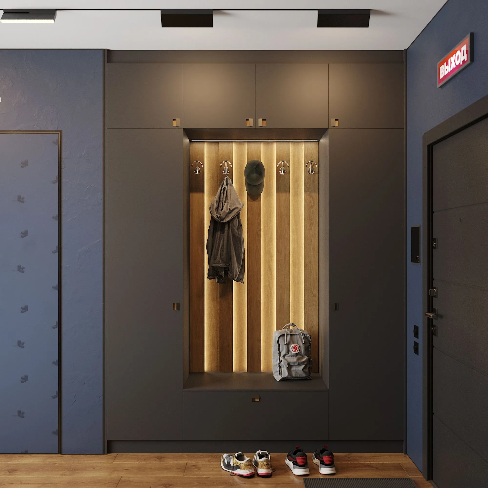 Почти всегда в прихожей располагается большой шкаф для верхней одежды и обуви. Встроенный или отдельно стоящий — не так важно. И здесь, безусловно, тоже нужна подсветка. Во-первых, с её помощью внутри будет проще найти нужную вещь: не придётся зажигать верхние лампы, собираясь на работу рано утром. Во-вторых, подсветка позволяет добавить уюта и красоты вашему коридору, превратить помещение в стильное и современное. В сочетании с полупрозрачными стеклянными фасадами подобное решение смотрится особенно впечатляюще.