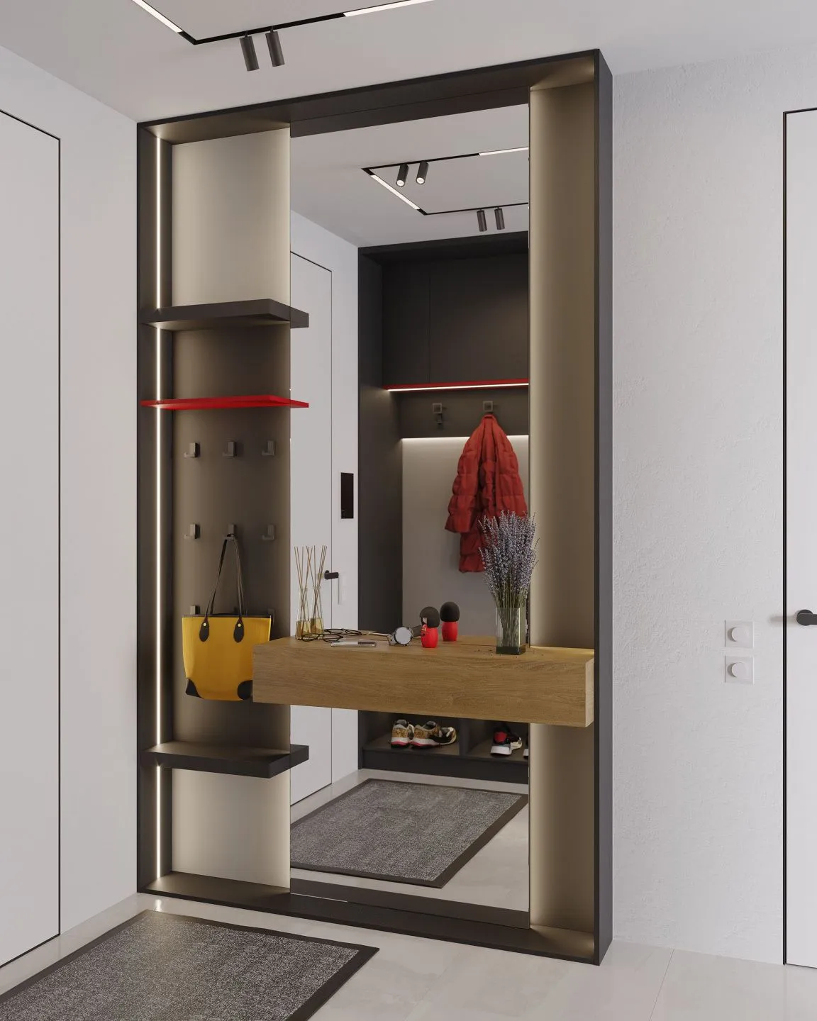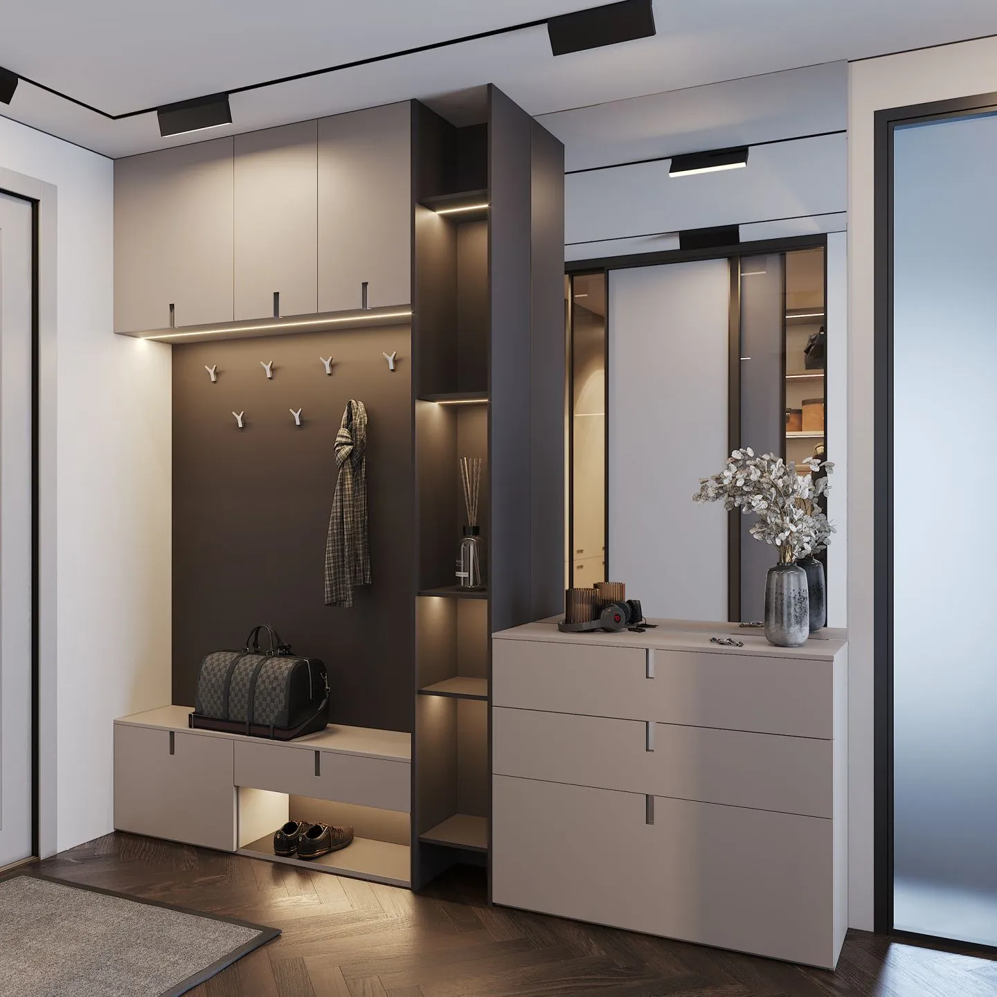 Хорошее современное решение — трековое освещение прихожей. Система монтируется по периметру всего коридора, а уровень интенсивности света вы выбираете самостоятельно. Главное — не забудьте просчитать количество ламп, чтобы не промахнуться! Это отличный вариант для современного стиля и лофта.