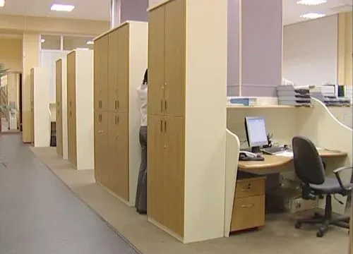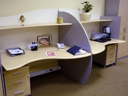 Наши дизайнеры стремились к тому, чтобы сделать эти интерьеры максимально удобными и эргономичными. Рабочие столы оборудованы множеством ящиков и подставок под все необходимые документы, технику и канцелярию. Рабочие места расположены таким образом, что сотрудники чувствуют себя как в отдельном кабинете и не мешают друг другу. Вместительные шкафы помогают упорядочить документы и хозяйственные принадлежности. Мягкое освещение приближено к естественному, что делает нахождение в этих помещениях более благоприятным и повышает работоспособность сотрудников.