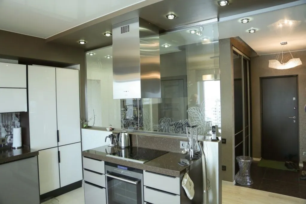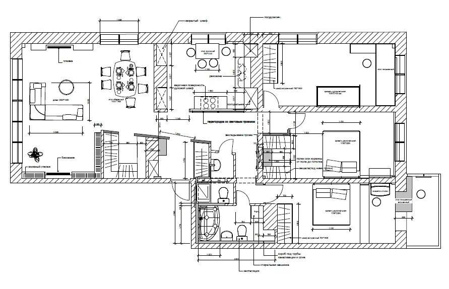 Хозяева выразили пожелание объединить в одно пространство гостиную и столовую, а зону кухни перенести, объединив и одновременно отделив ее от общего жилого пространства, что решено было в дальнейшем с помощью стеклянной перегородки, так же перенос основного и создание дополнительного сан.узла. с душевой кабиной.