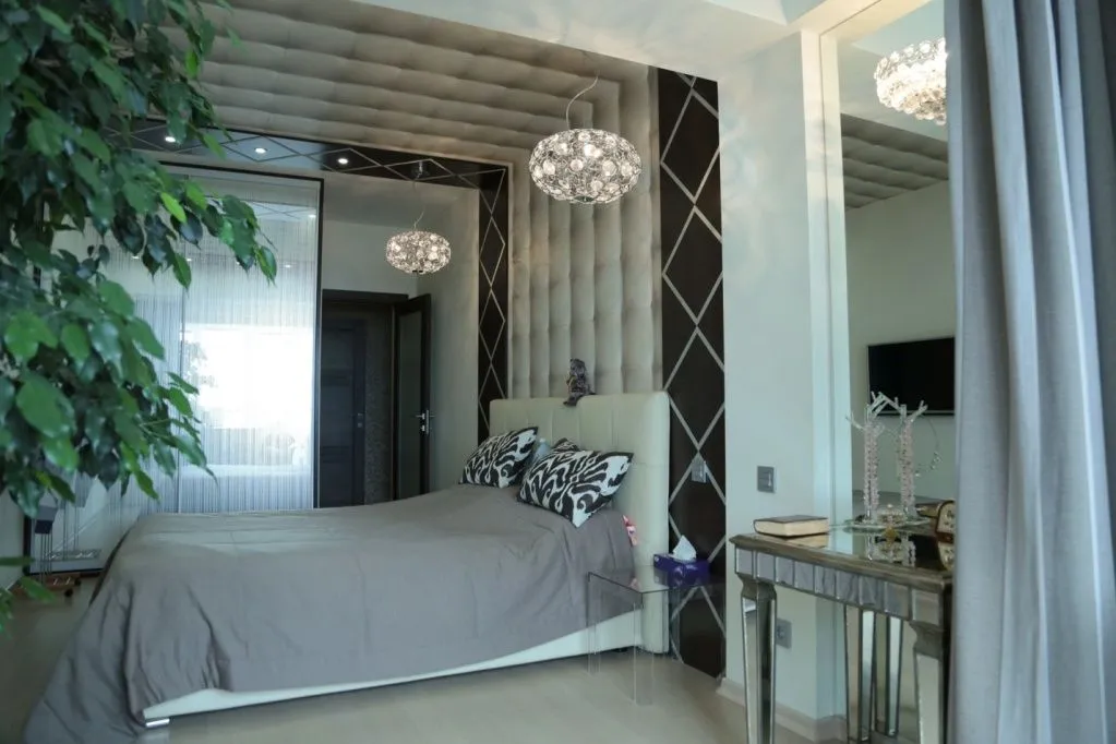Встроенные шкаф-купе с использованием декоративного зеркала «Рейн» в спальне, выигрышно увеличивает пространство, изящно украшая белыми нитями рисунка.