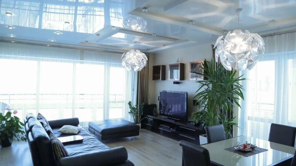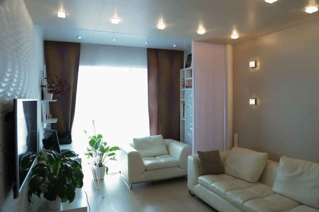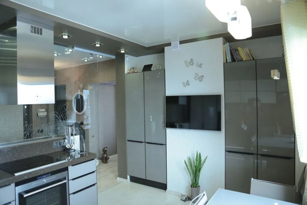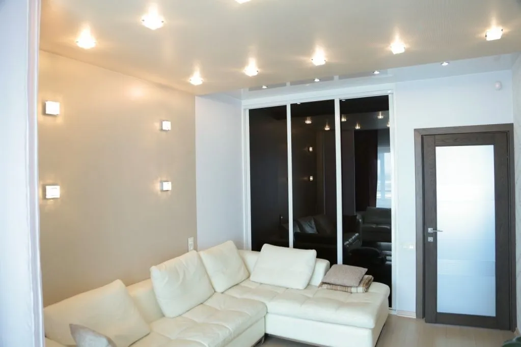 Светло-серые стенки в гостиную>>>Встроенный шкафы-купе с использованием декоративного черного стекла в белом профиле. И как украшение интерьера - декоративные вставки из панелей отделанных пленкой «Рейв».