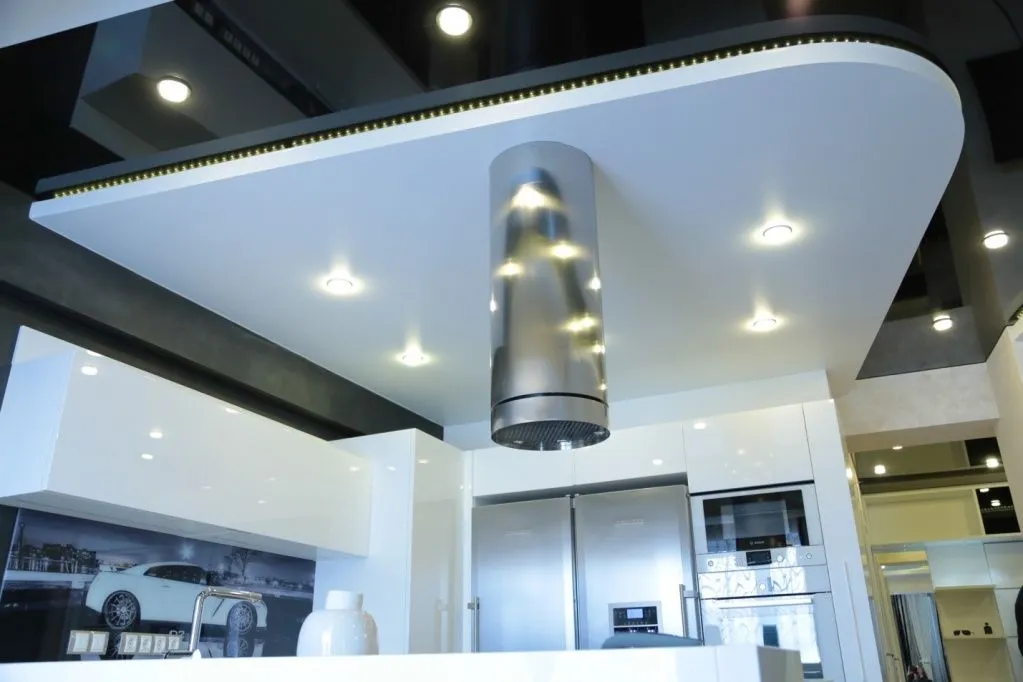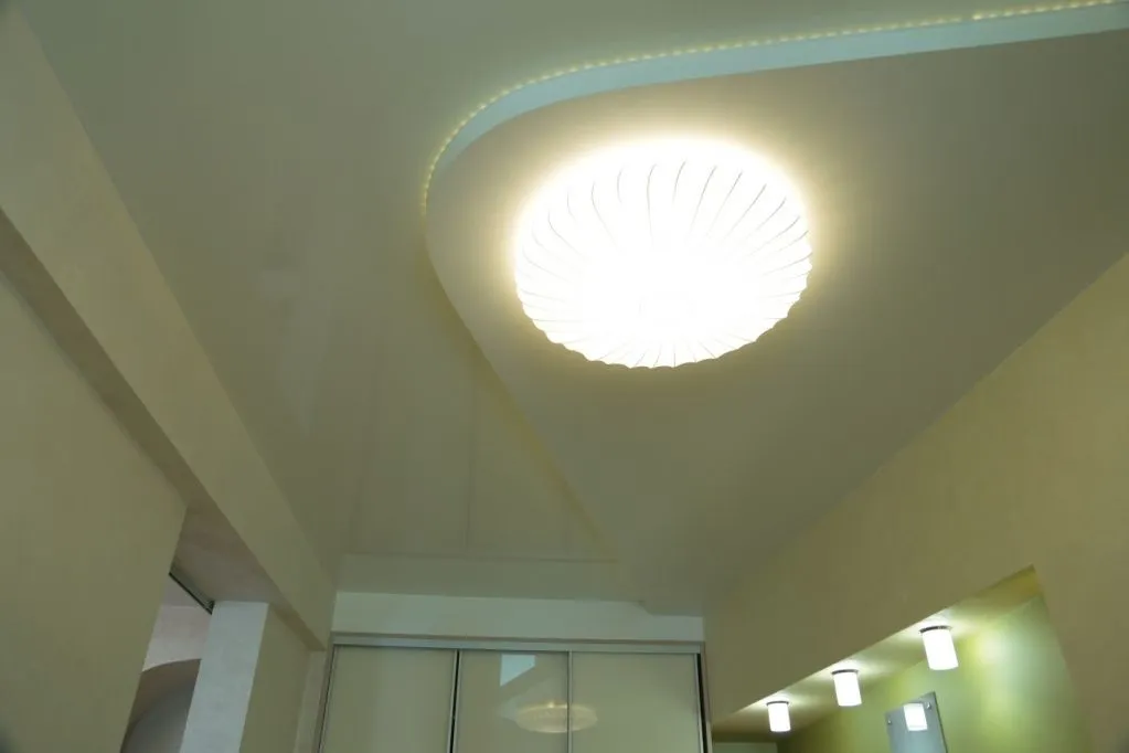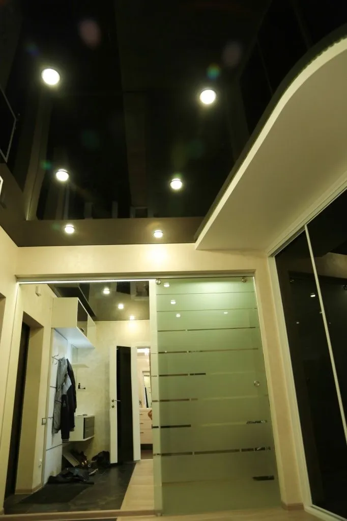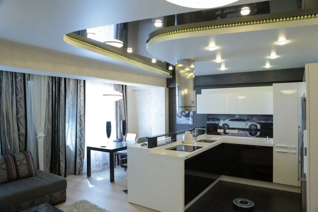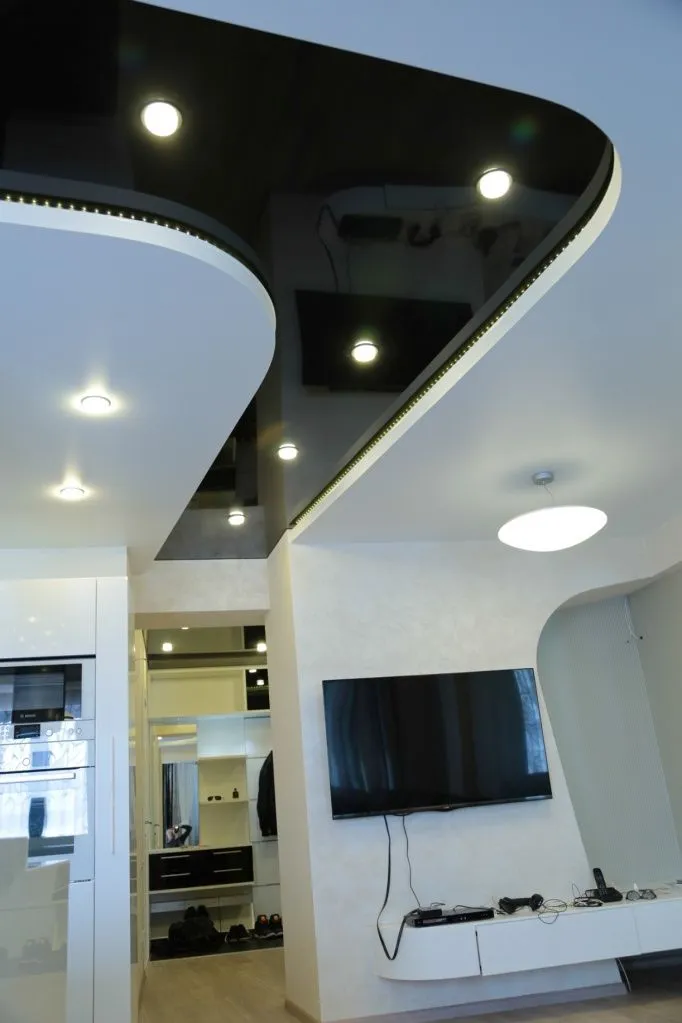 Основной концепцией послужила идея объединения пространства прихожей, гостиной и кухонной зоны. Основным объединяющим элементом выступил потолок, плавно объединяя разные пространства и указывая направление движения. Плавные линии и сдержанность цвета, уравновешивают друг друга.