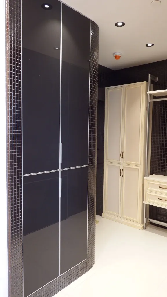 Классическая композиция изготовлена в декоре «Декапе Жемчуг». Так же использованы элементы серии модерн (алюминиевые стойки для открытой части прихожей и фасады в тонкой раме со вставкой стекло «Нуар»).