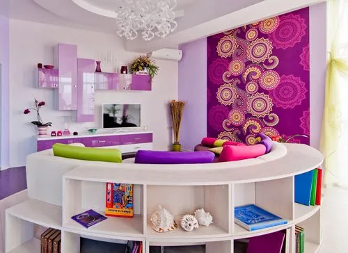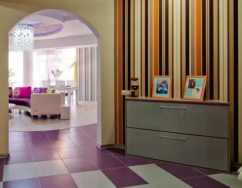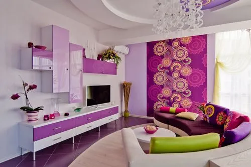 Главным акцентом гостиной стало декоративное панно, которое и определило всю гамму оттенков сиреневого цвета - от фуксии до лилового. В процессе работы количество базового цвета стало несколько навязчивым, и было принято решение разбавить его контрастным зеленым, который сделал гамму изысканных сиреневых более энергичной и дружелюбной.