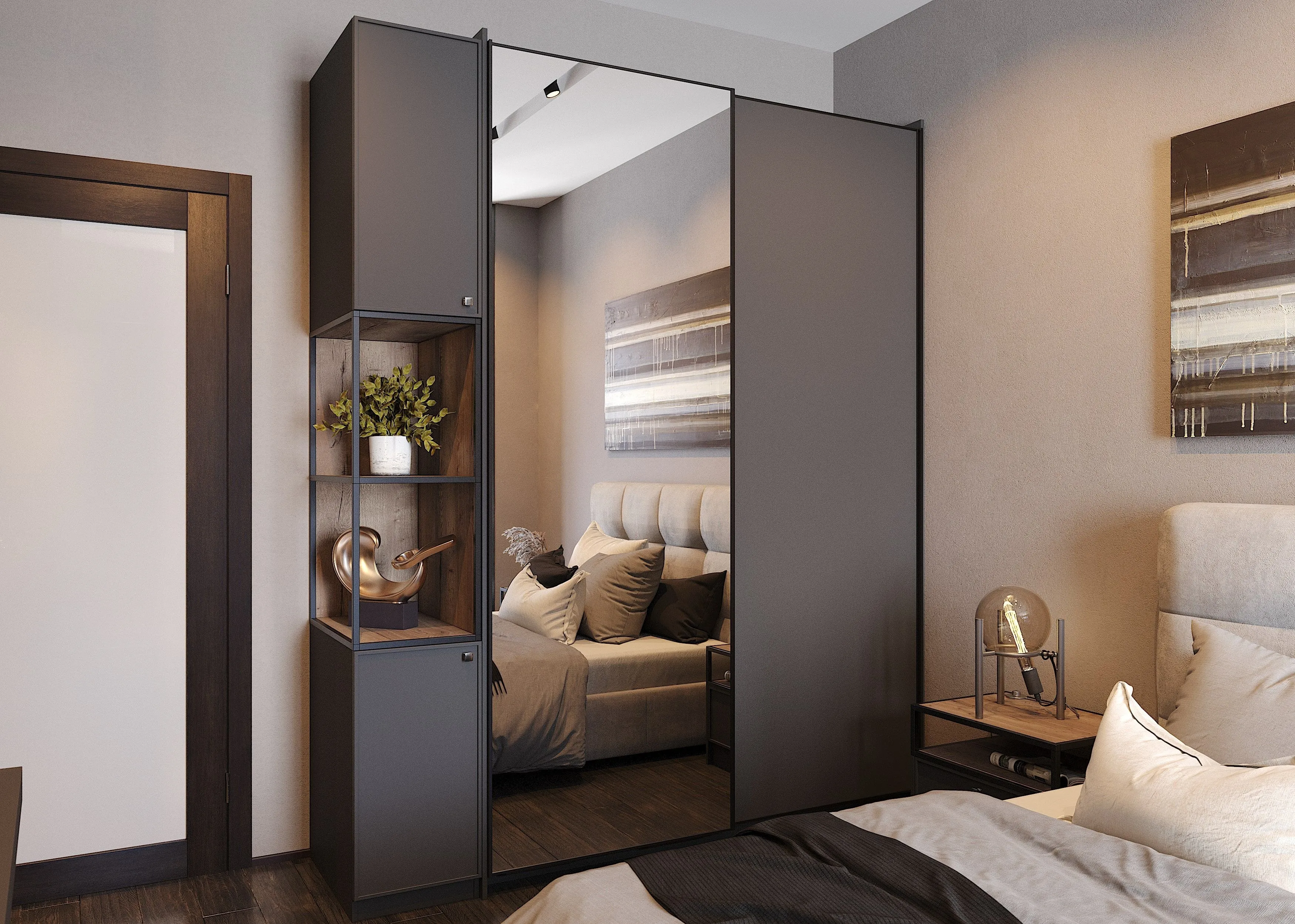 Шкафы-купе серые ЛДСП>>>Двери-купе могут устанавливаться двумя способами: или вдоль стены, или внутри стены. Естественно, второй вариант сопряжен с масштабными строительными работами, что ведет к неизбежному удорожанию всей конструкции.