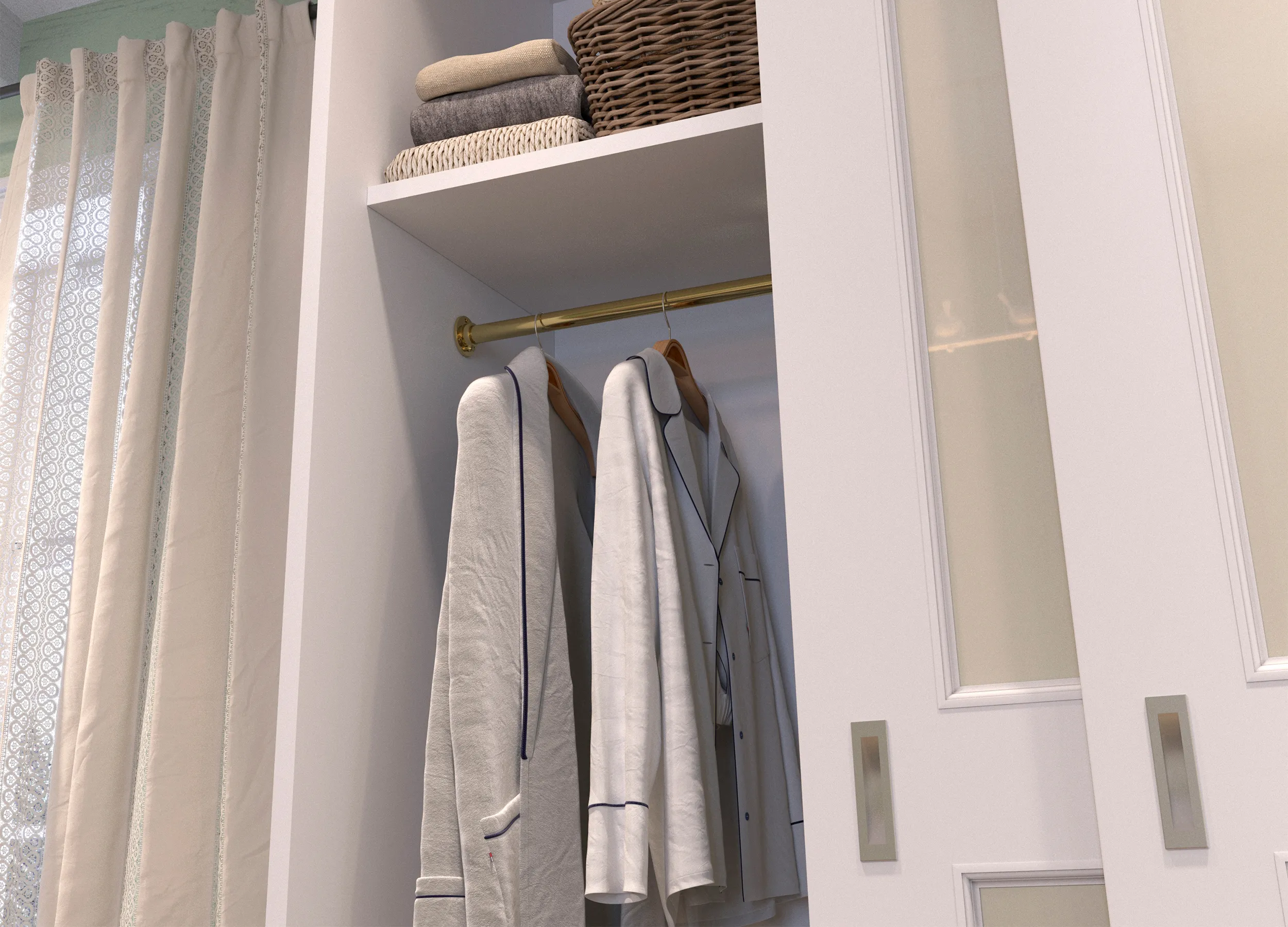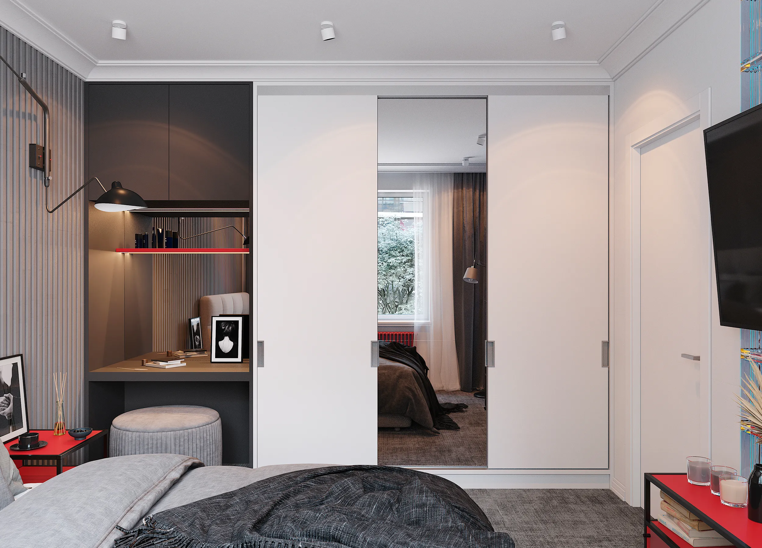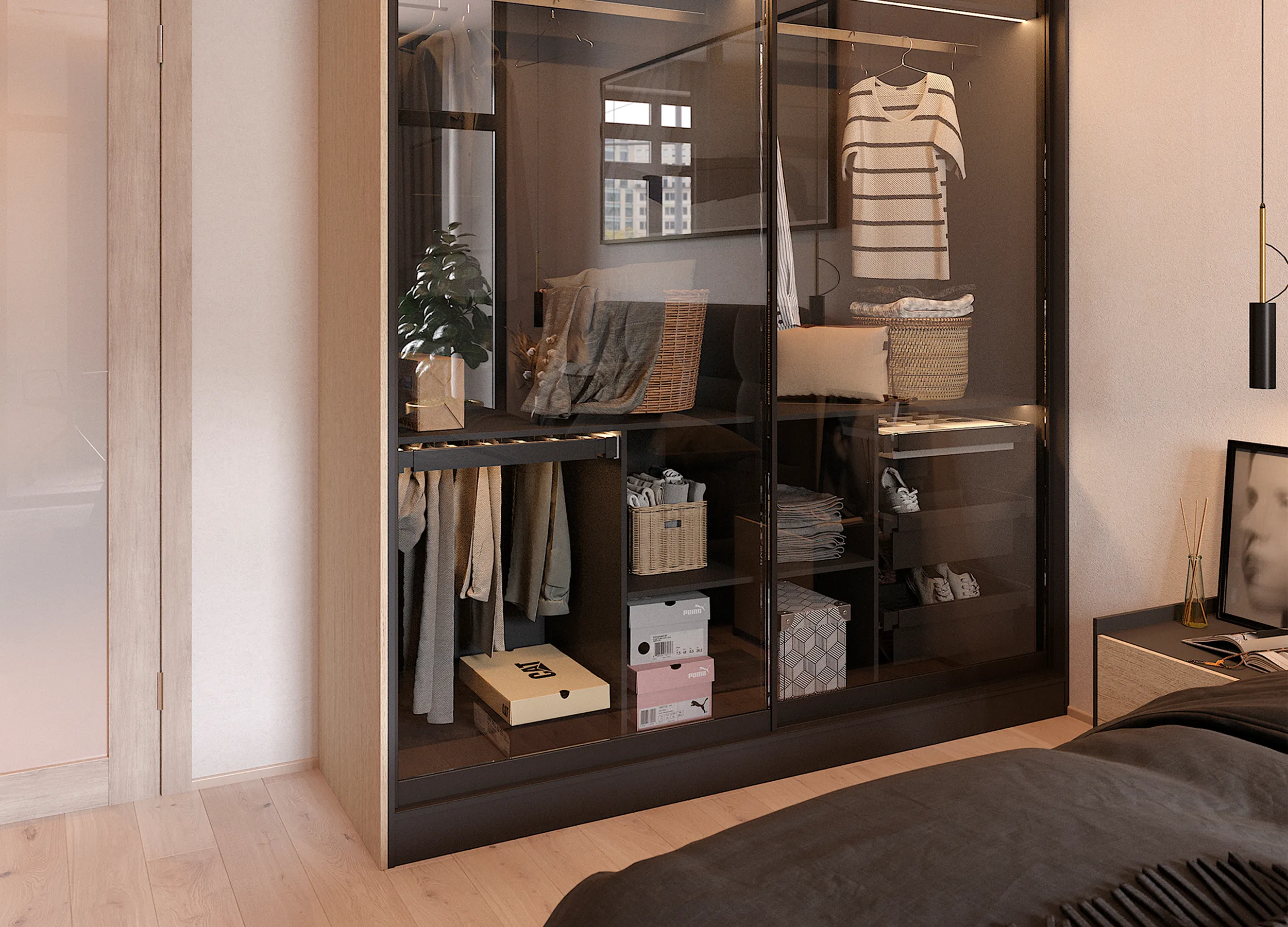 Очень выгодным с точки зрения планировки пространства решением будет установить в малогабаритной спальне высокий, до самого потолка, купе. Чтобы визуально увеличить спальню, стоит присмотреться к моделям с зеркальными дверями. Внимательно стоит подойти к размещению наполнения — ведь помимо одежды и постельного белья, внутри будут храниться обувь, аксессуары и мелкие вещи.
