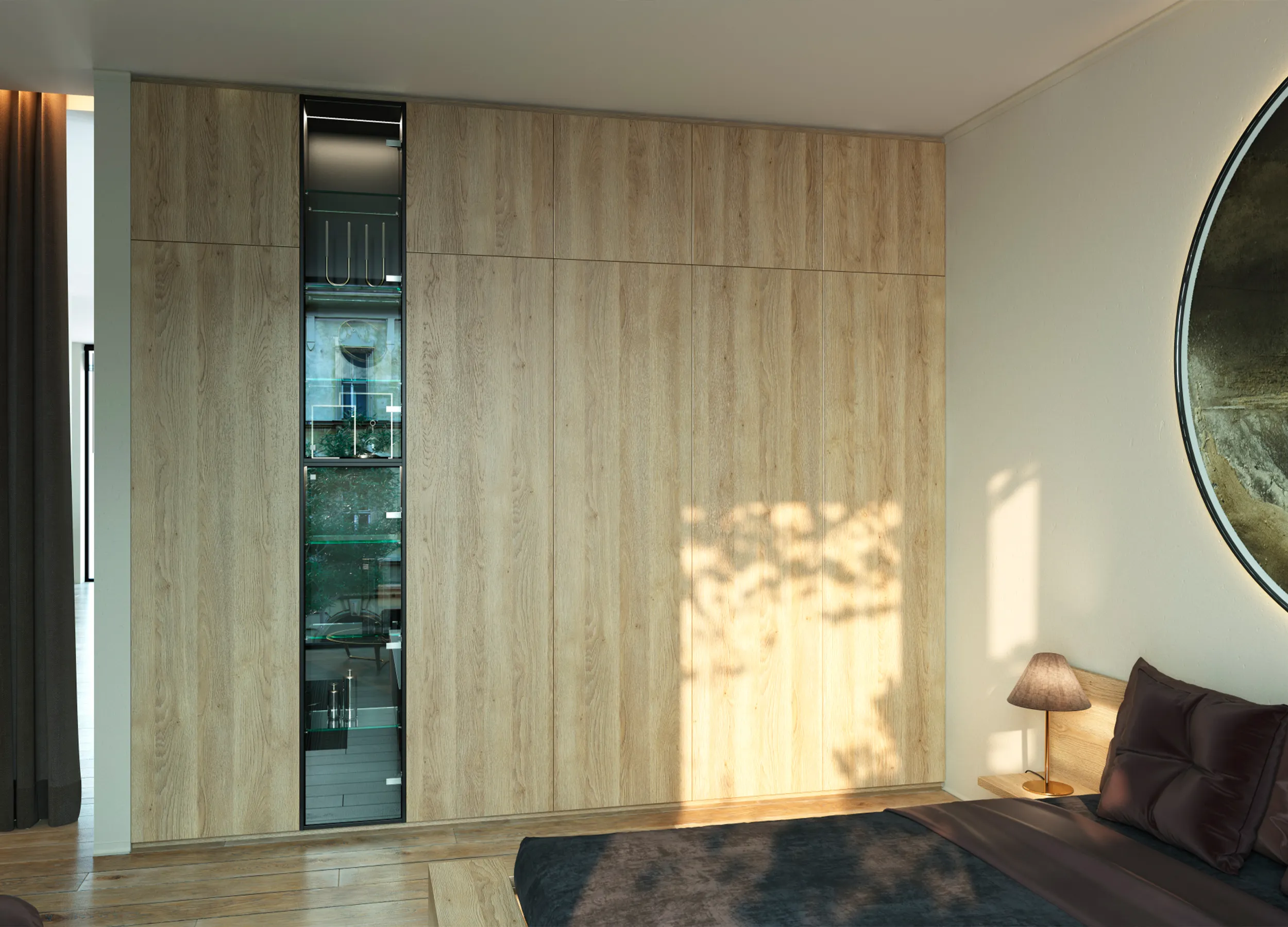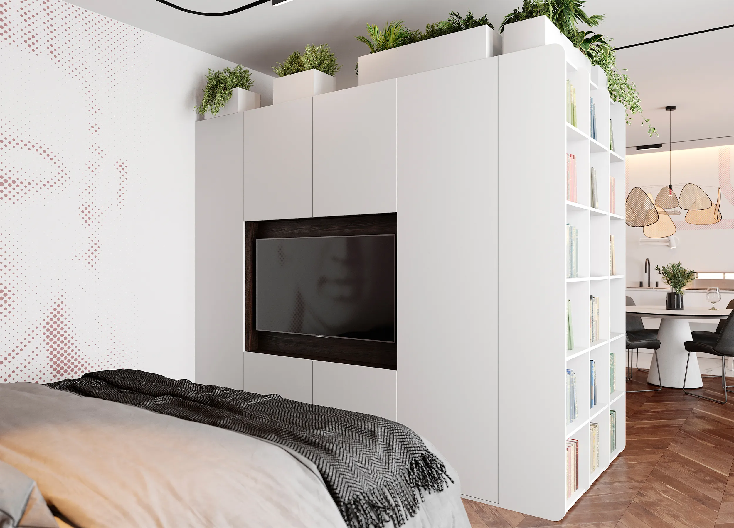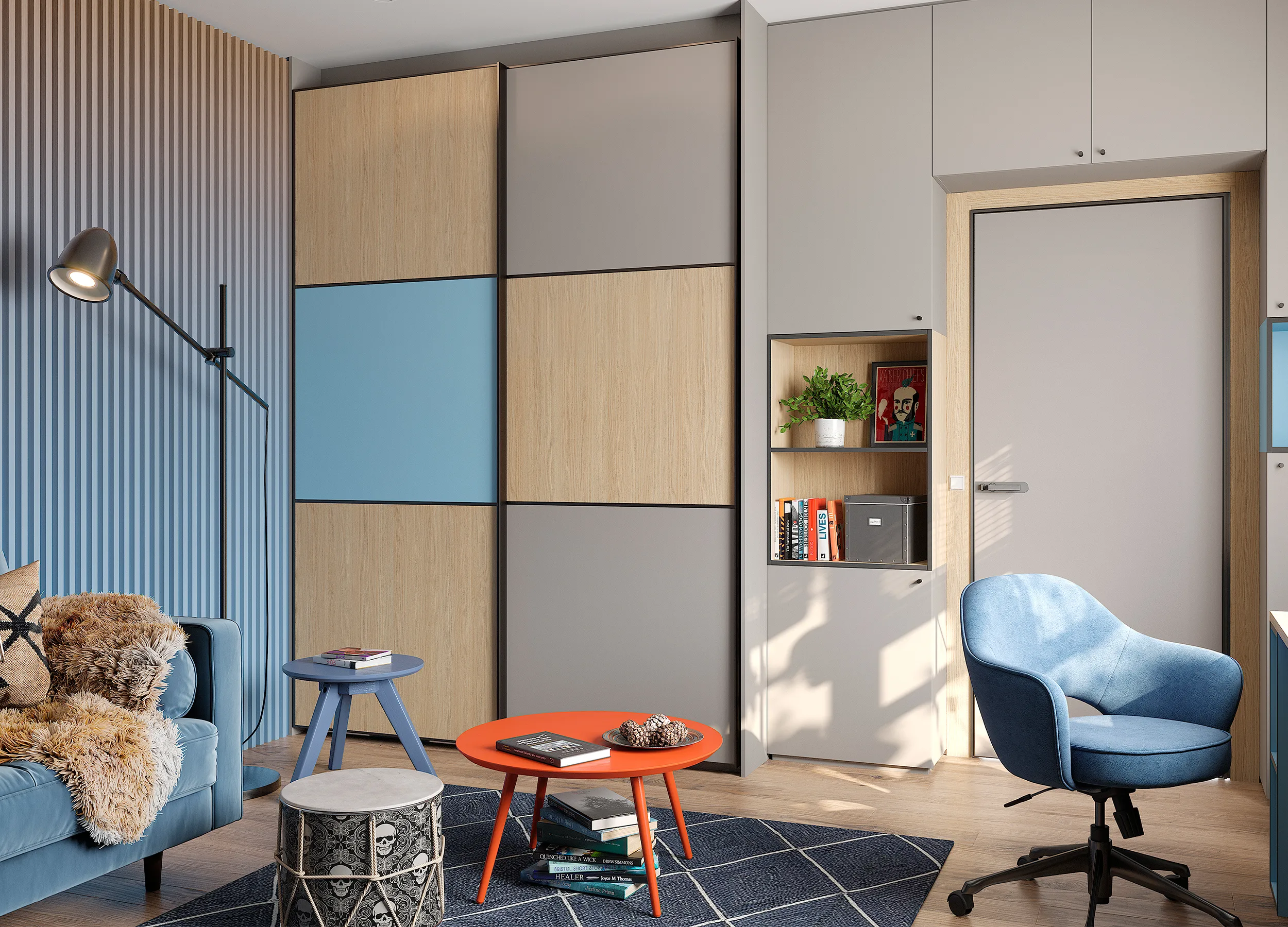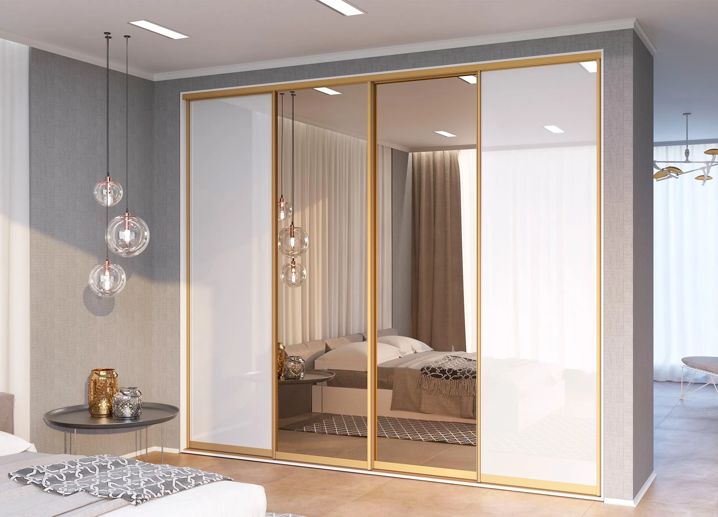 Очень выгодным с точки зрения планировки пространства решением будет установить в малогабаритной спальне высокий, до самого потолка, купе. Чтобы визуально увеличить спальню, стоит присмотреться к моделям с зеркальными дверями. Внимательно стоит подойти к размещению наполнения — ведь помимо одежды и постельного белья, внутри будут храниться обувь, аксессуары и мелкие вещи.