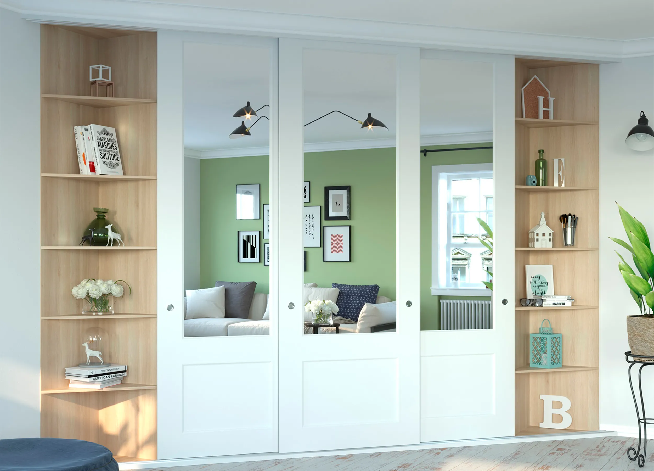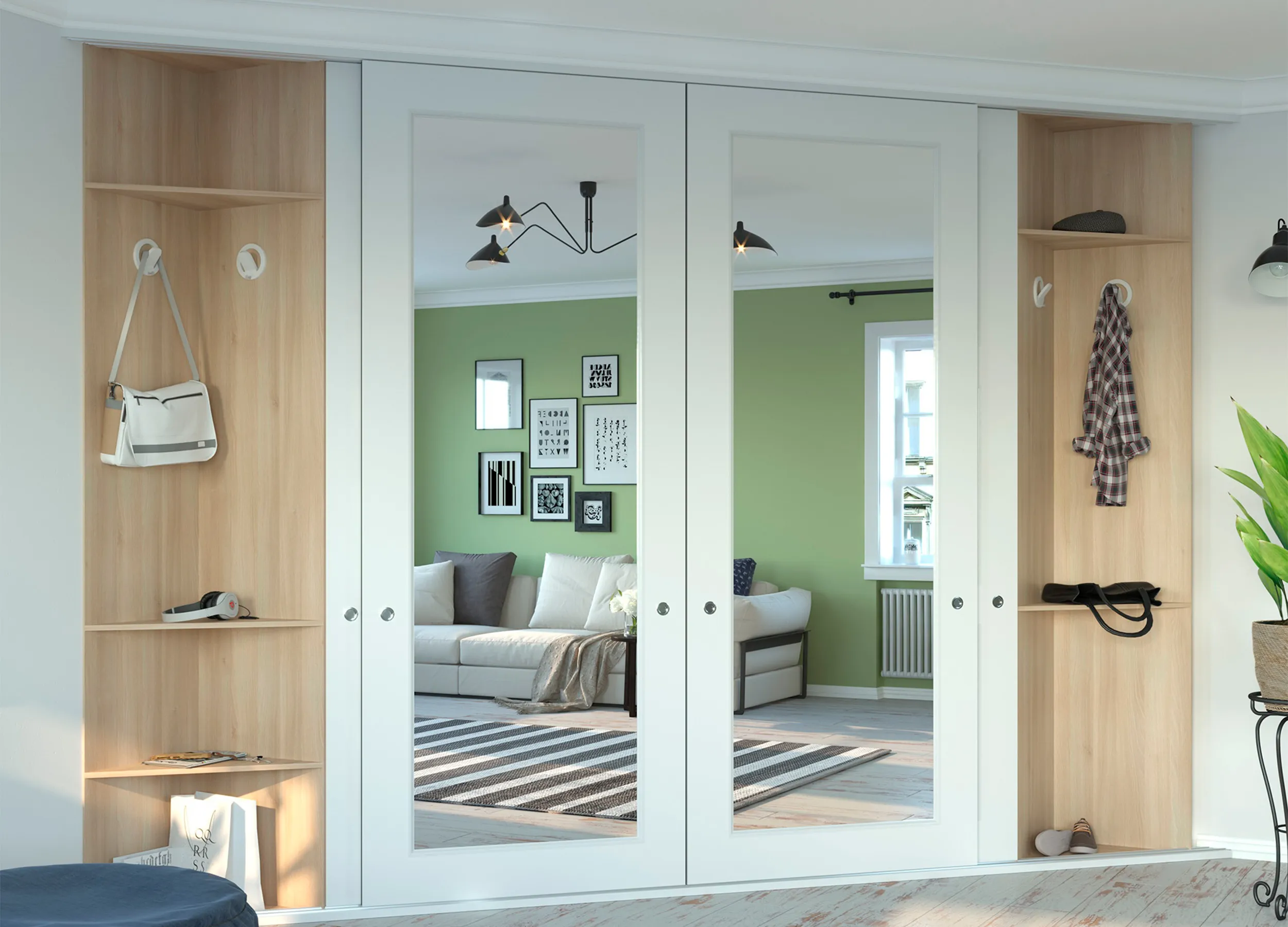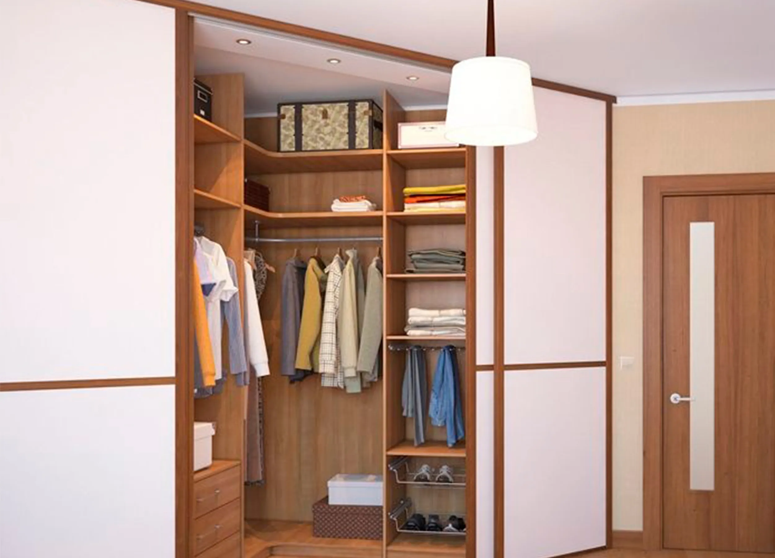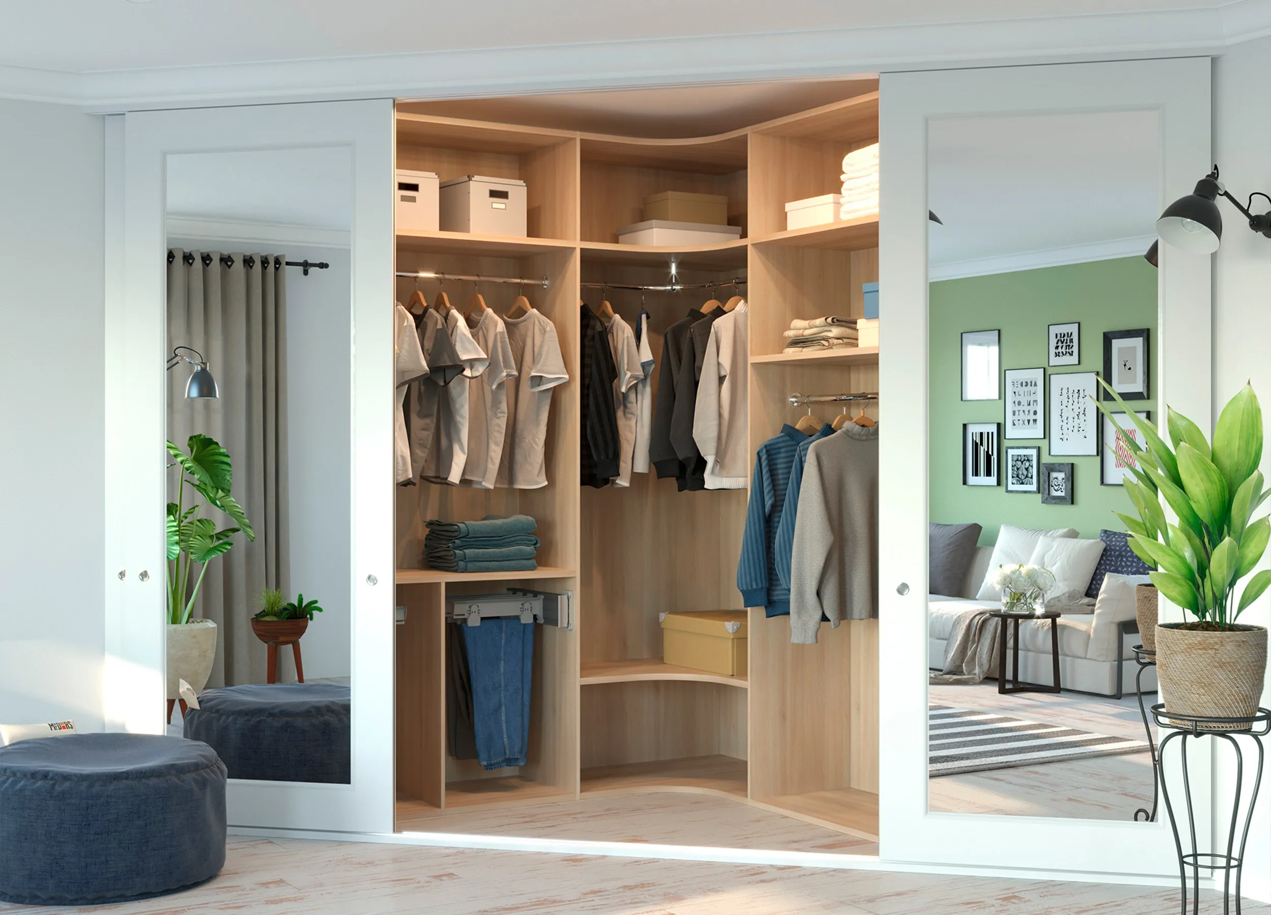 Встроенные угловые модели часто используют, чтобы скрыть какие-то недостатки в планировке: они отлично справятся с неровностями стен и пола, а также придадут нестандартной по форме комнате более гармоничный вид. Также можно отказаться в данной модели от дверей, оставив открытые полки, и тем самым увеличить визуально размеры помещения. То же самое можно сделать, приобретя модель с зеркальными дверьми.