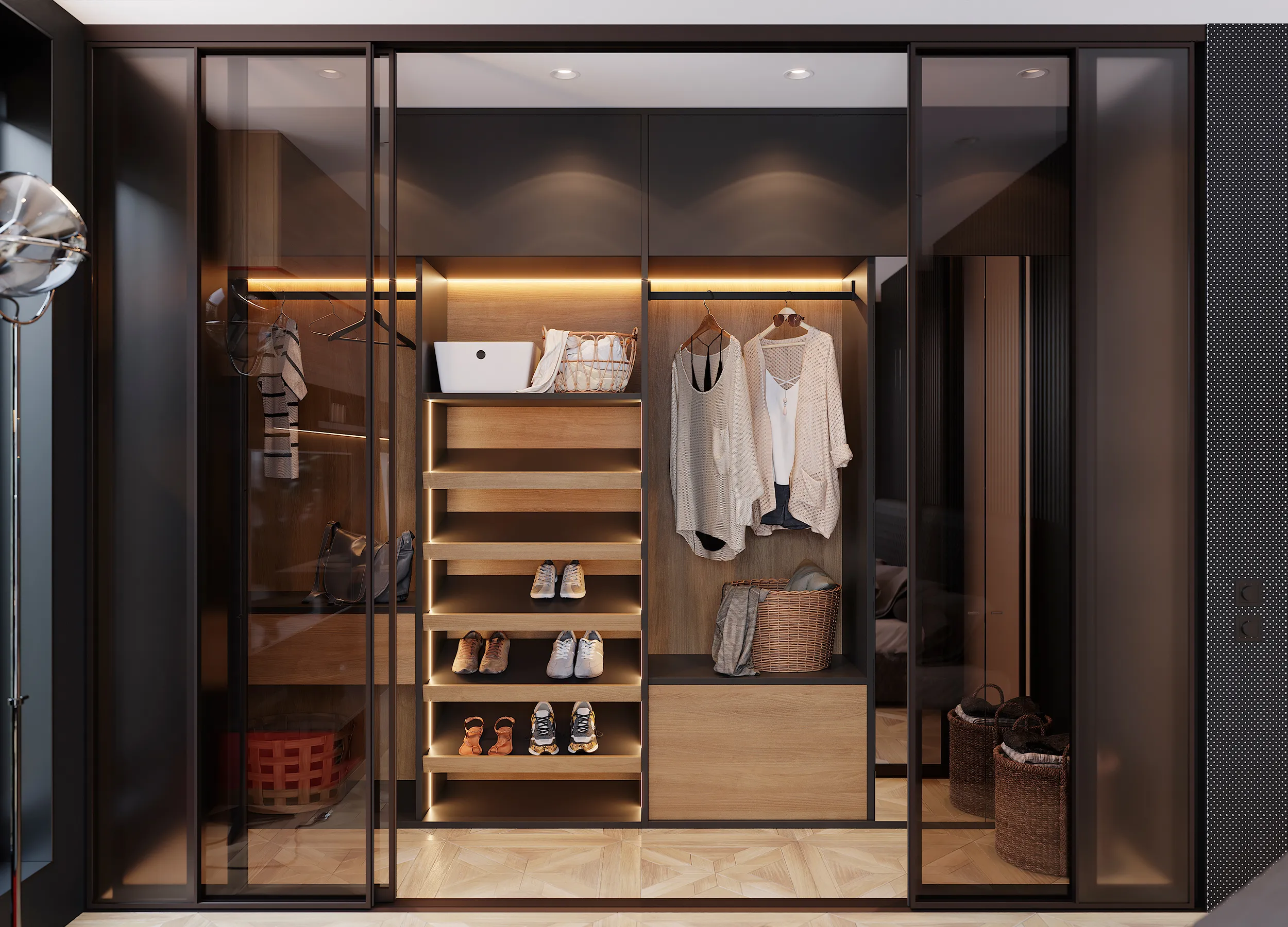 В последнее время становится популярным Г-образная угловая конфигурация. Эта конструкция напоминает форму буквы «Г» и, по сути, состоит из двух, стыкующихся на торцах, шкафов. Подобная модель станет хорошим вариантом для хранения многочисленных вещей и подойдет для обладателей большого гардероба.
