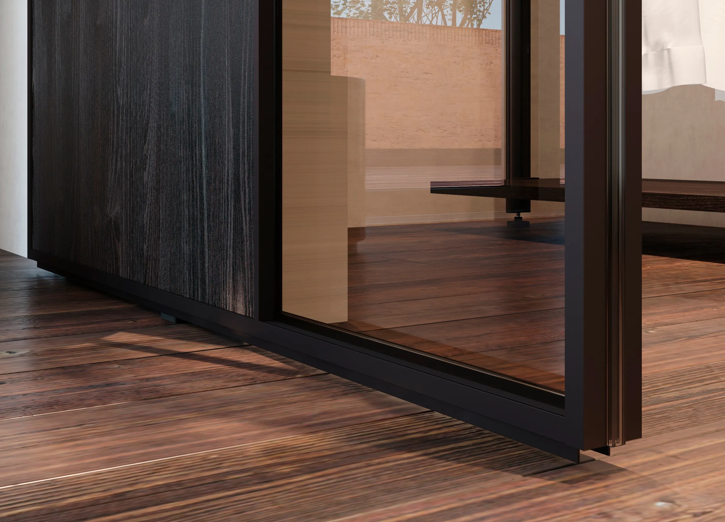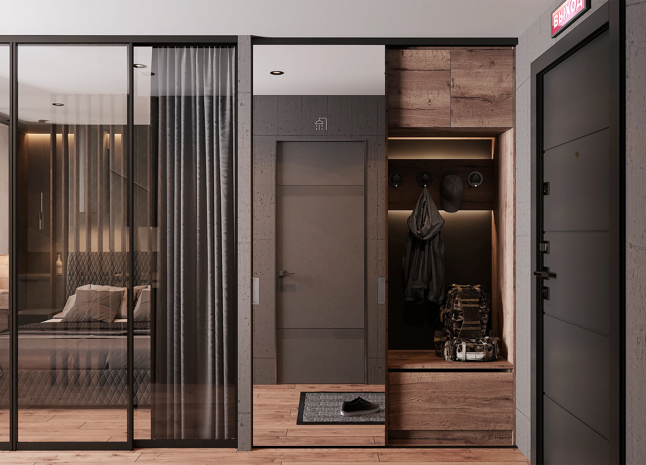 Классический вариант таких дверей – это идеальное дополнение к стилю модерн. Эта модель будет выглядеть очень современно за счет стеклянных дверей и металлических элементов декора.