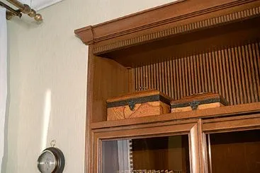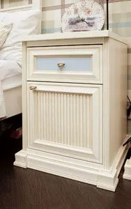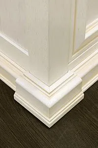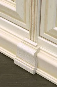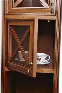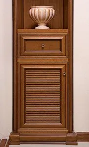 Стыки, где вертикальные панели сопрягаются с цоколем или карнизом, украшены традиционными для классической мебели «замками», которые изготавливаются из массива дерева, фрезеруются, лакируются и покрываются патиной.