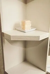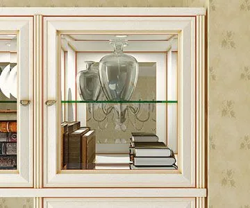 В качестве открытых полок применяются ламинированные панели толщиной 25 мм или прозрачное стекло 6 мм. В серии «Классика» предусмотрена возможность встроить в открытые полки из ламинированной плиты точечные светильники «Министар».