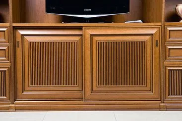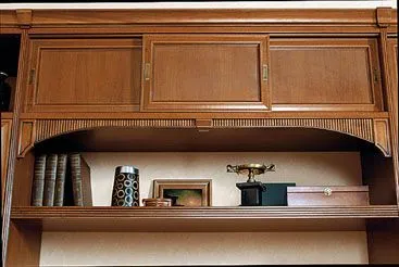 Задние стенки используются вкладные. Задней стенкой может служить как ламинированная панель толщиной 8 мм, так и рама из МДФ в шпоне (со вставкой из зеркала или декоративного стекла), а также декоративные панели «Буазери».