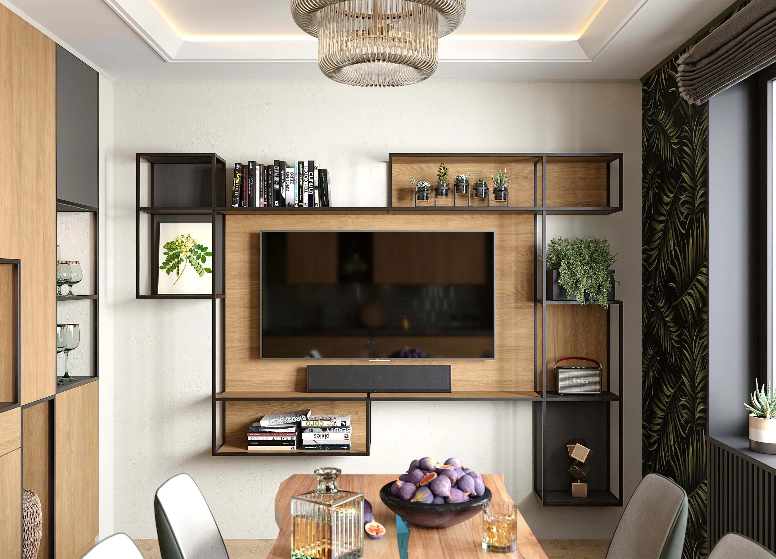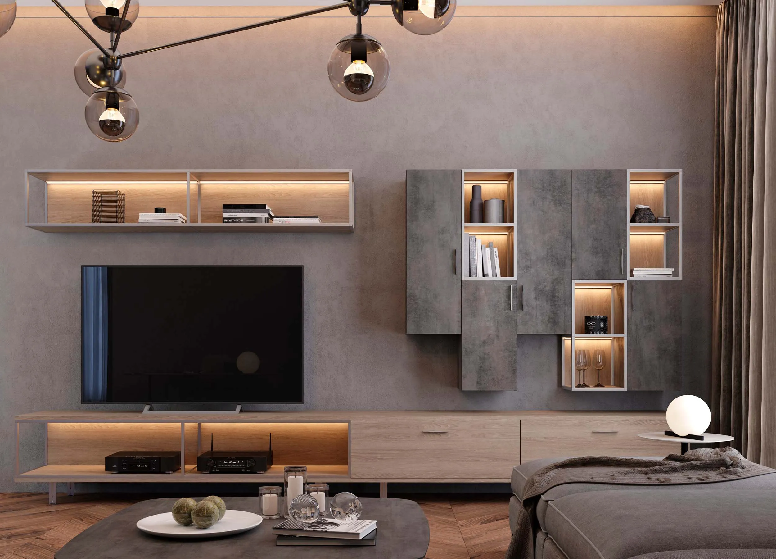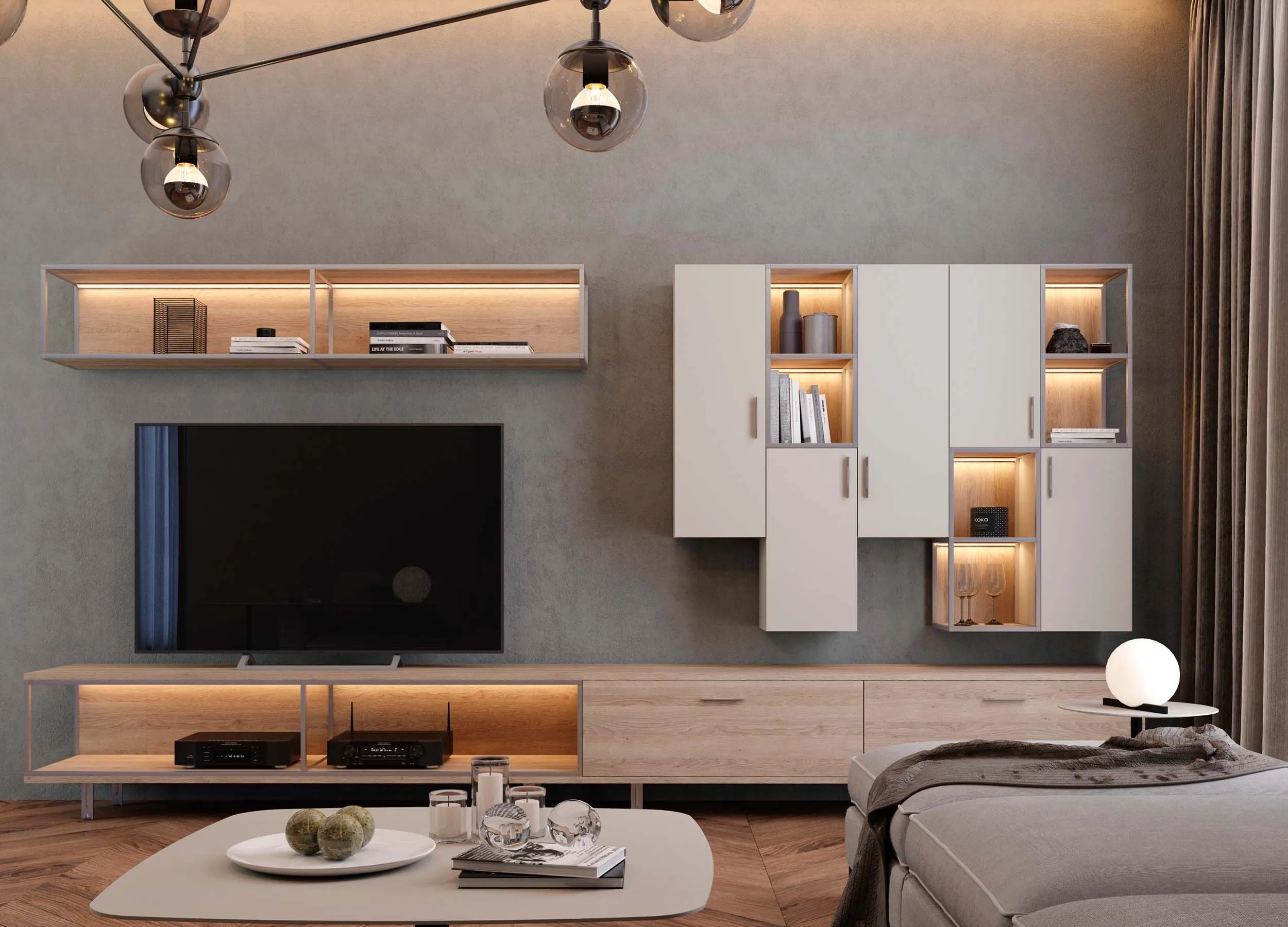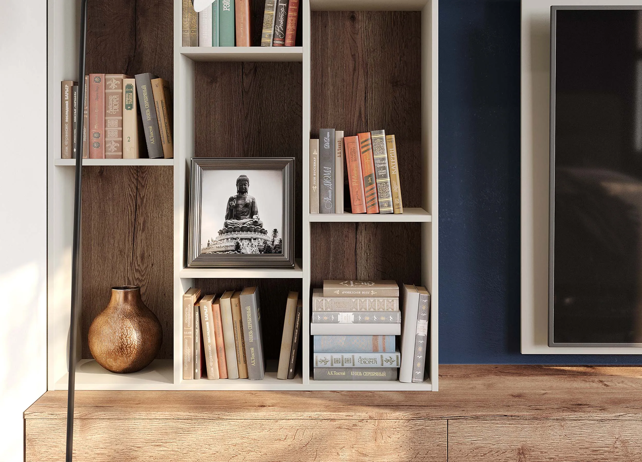 Такие композиции обычно включают в себя открытые полки, выдвижные ящики, витрины или подвесные пеналы. Консоли обеспечивают визуальную легкость, при этом отлично подходят для предметов декора или книг. Также они открывают свободу в размещении отдельных элементов, позволяют создавать индивидуальный, стильный дизайн.