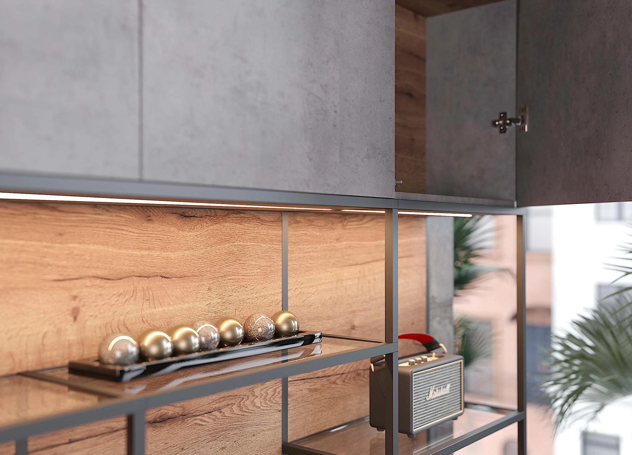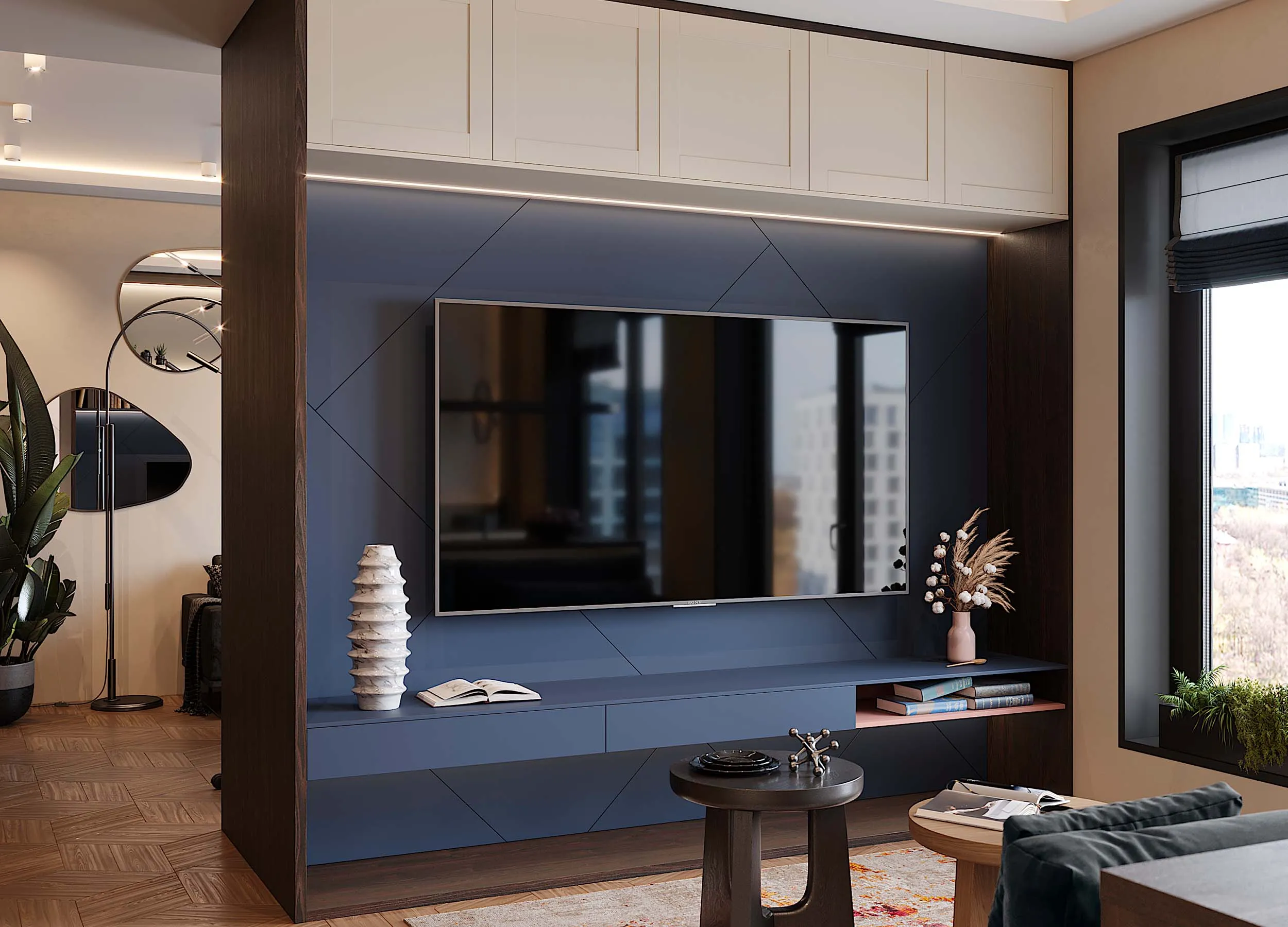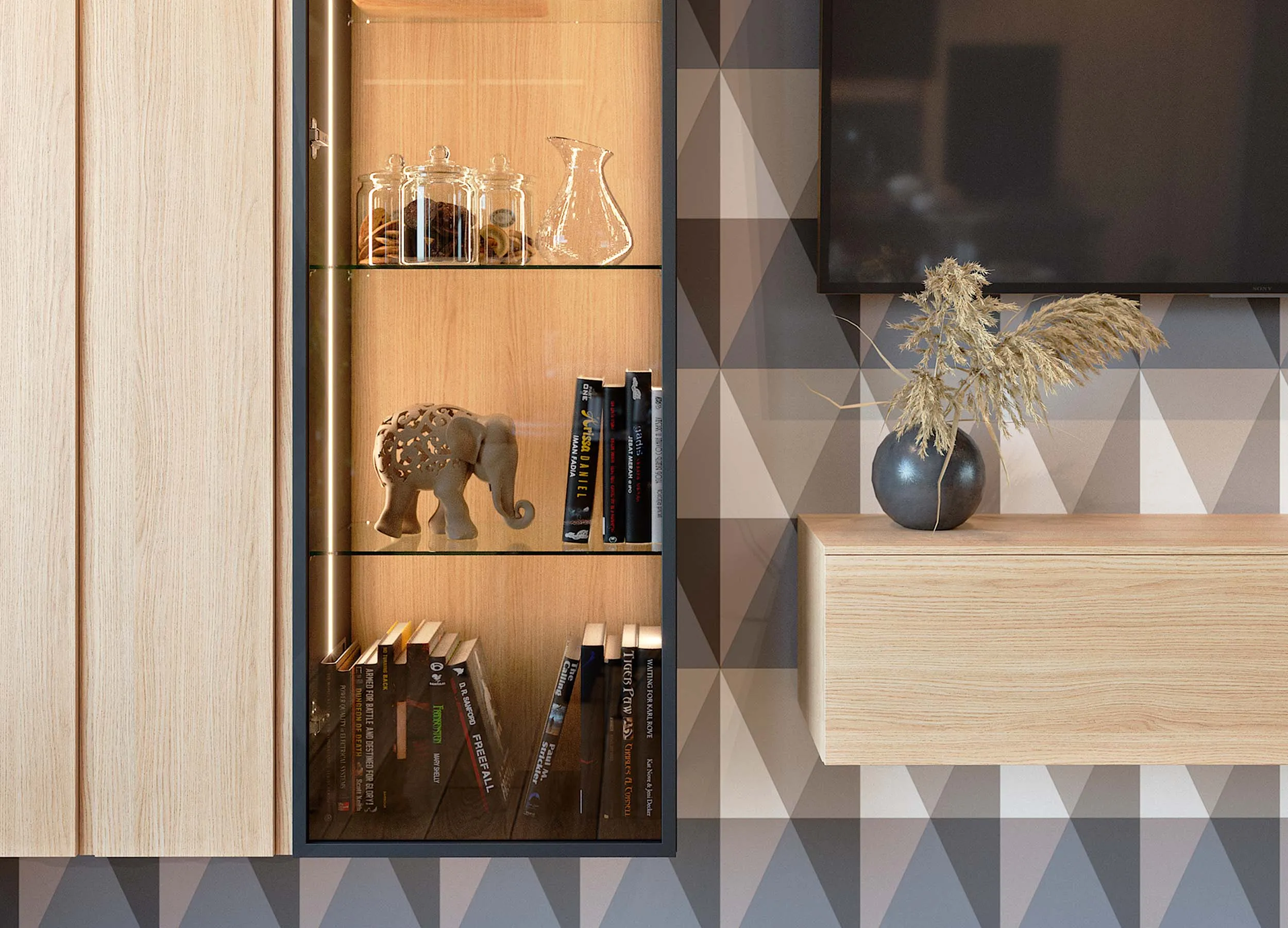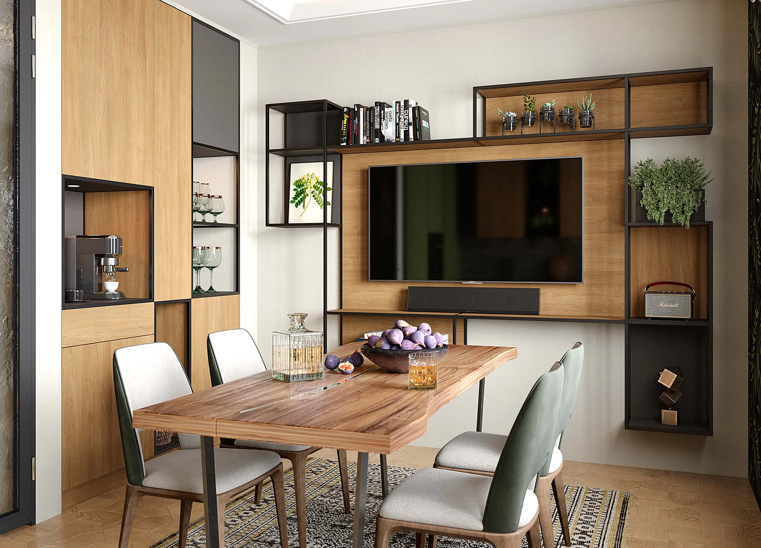Такие композиции обычно включают в себя открытые полки, выдвижные ящики, витрины или подвесные пеналы. Консоли обеспечивают визуальную легкость, при этом отлично подходят для предметов декора или книг. Также они открывают свободу в размещении отдельных элементов, позволяют создавать индивидуальный, стильный дизайн.