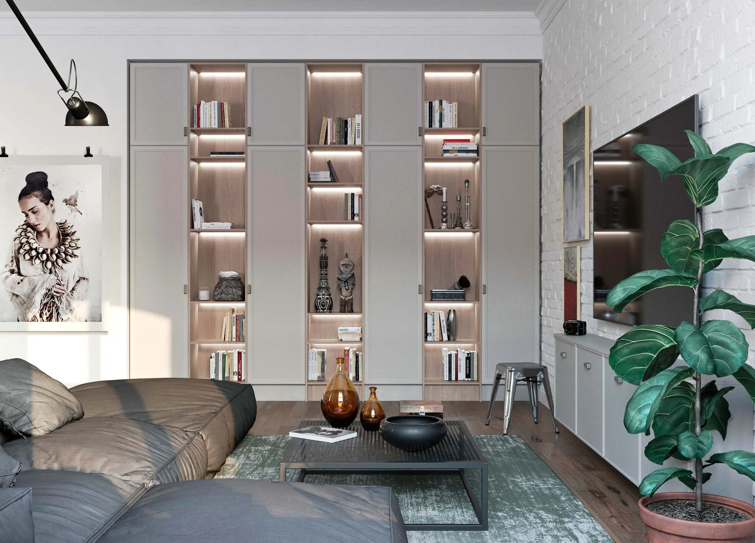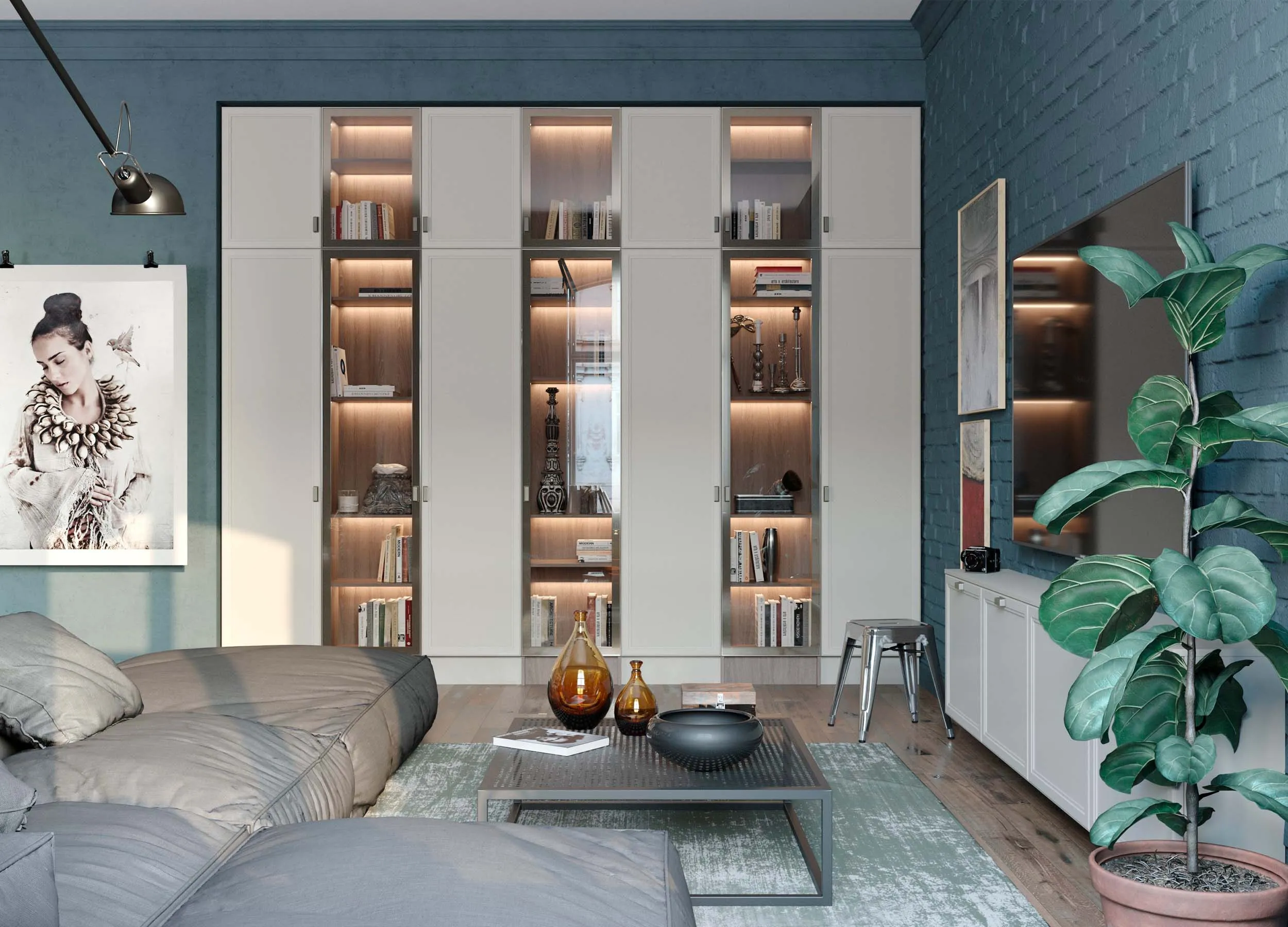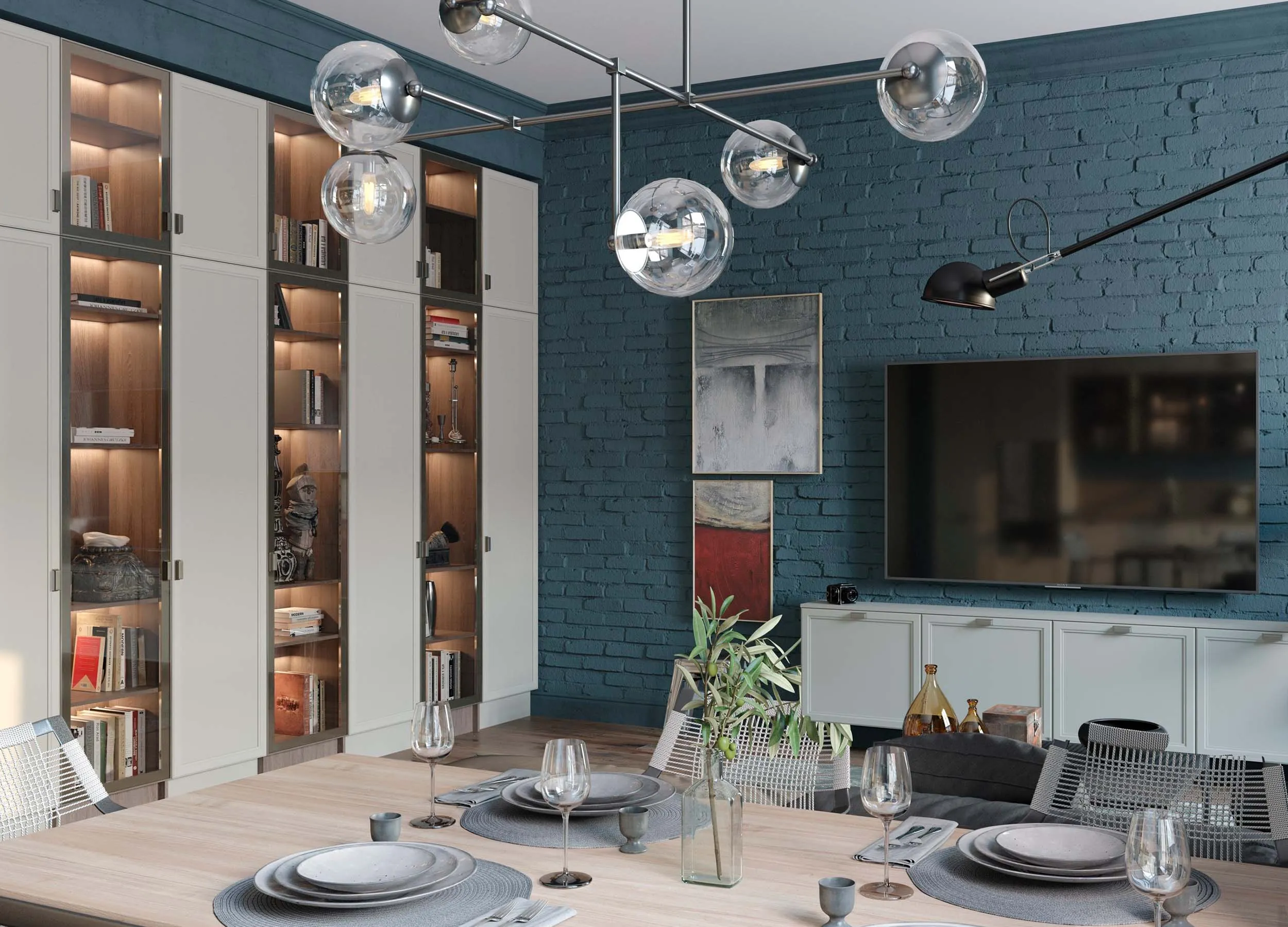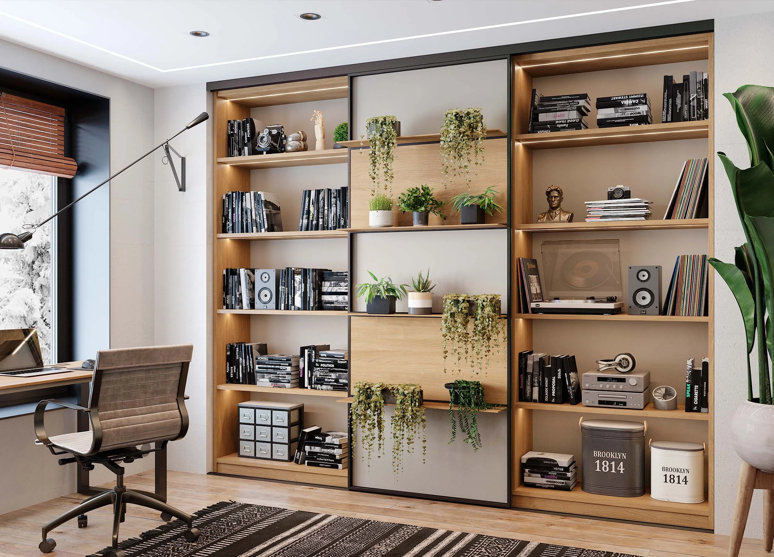 Такие композиции обычно включают в себя открытые полки, выдвижные ящики, витрины или подвесные пеналы. Консоли обеспечивают визуальную легкость, при этом отлично подходят для предметов декора или книг. Также они открывают свободу в размещении отдельных элементов, позволяют создавать индивидуальный, стильный дизайн.