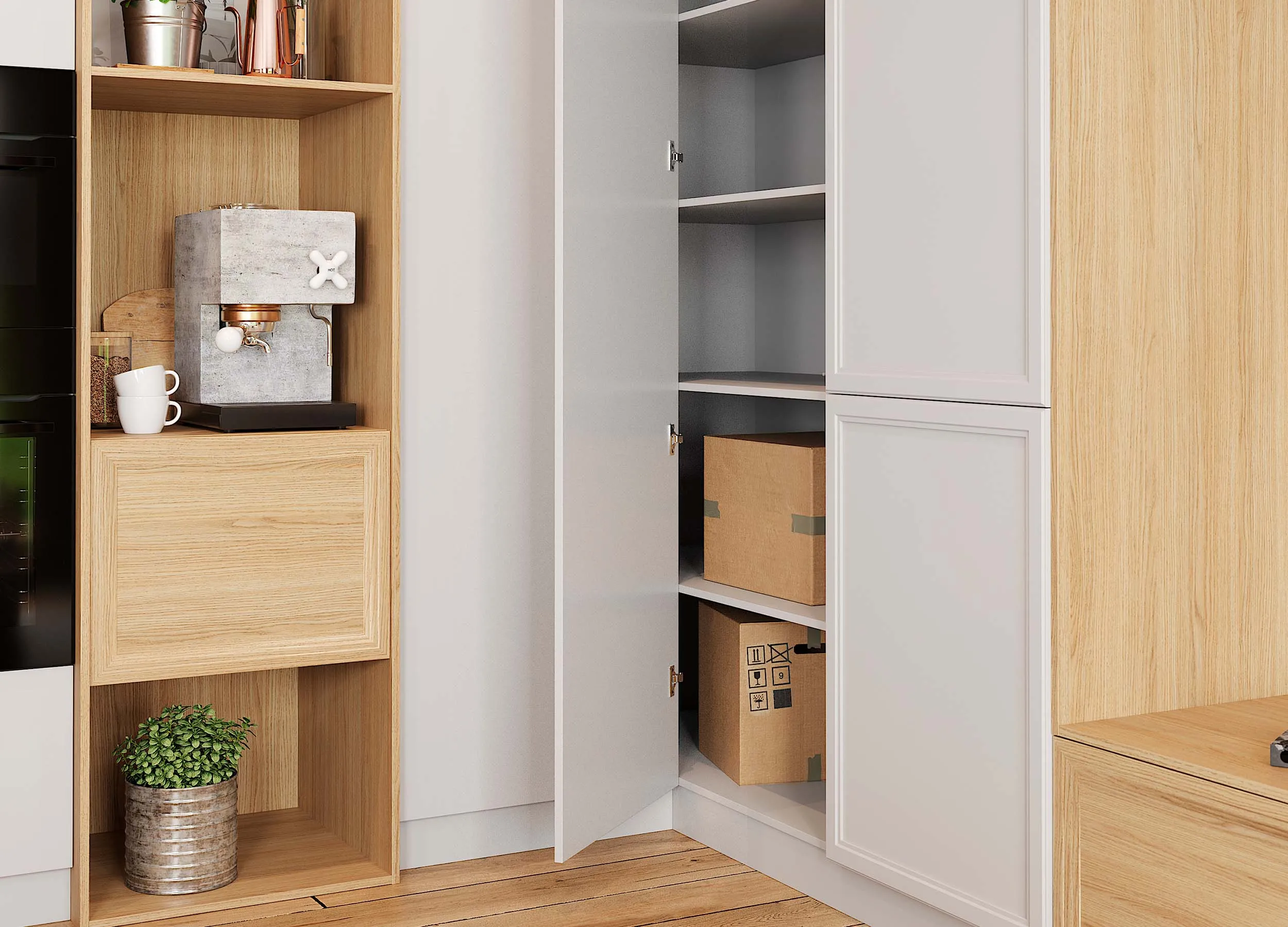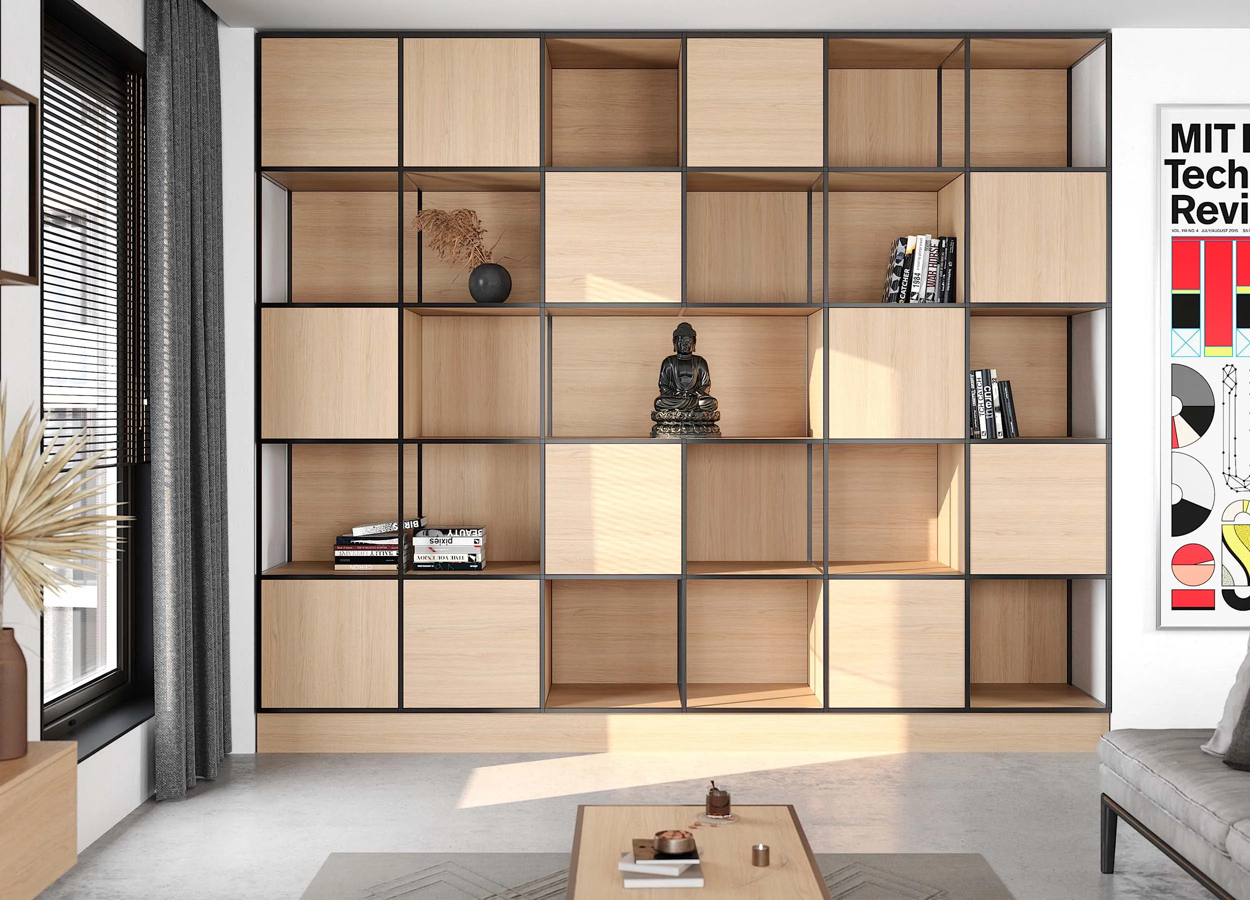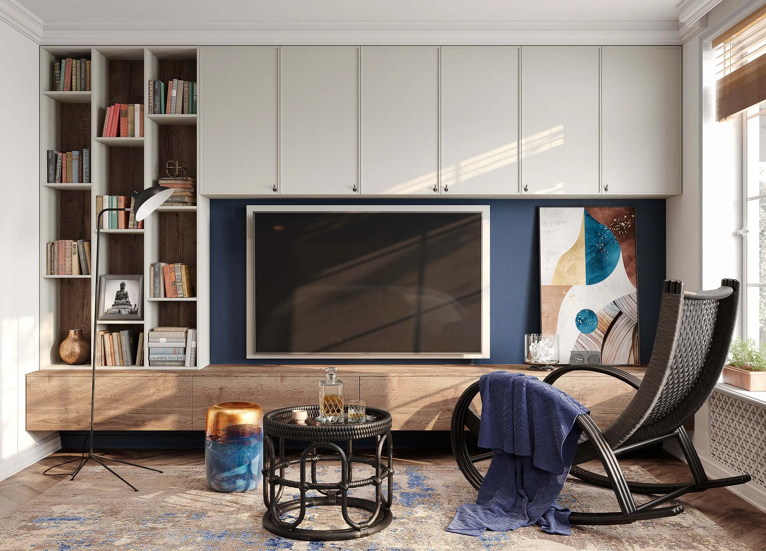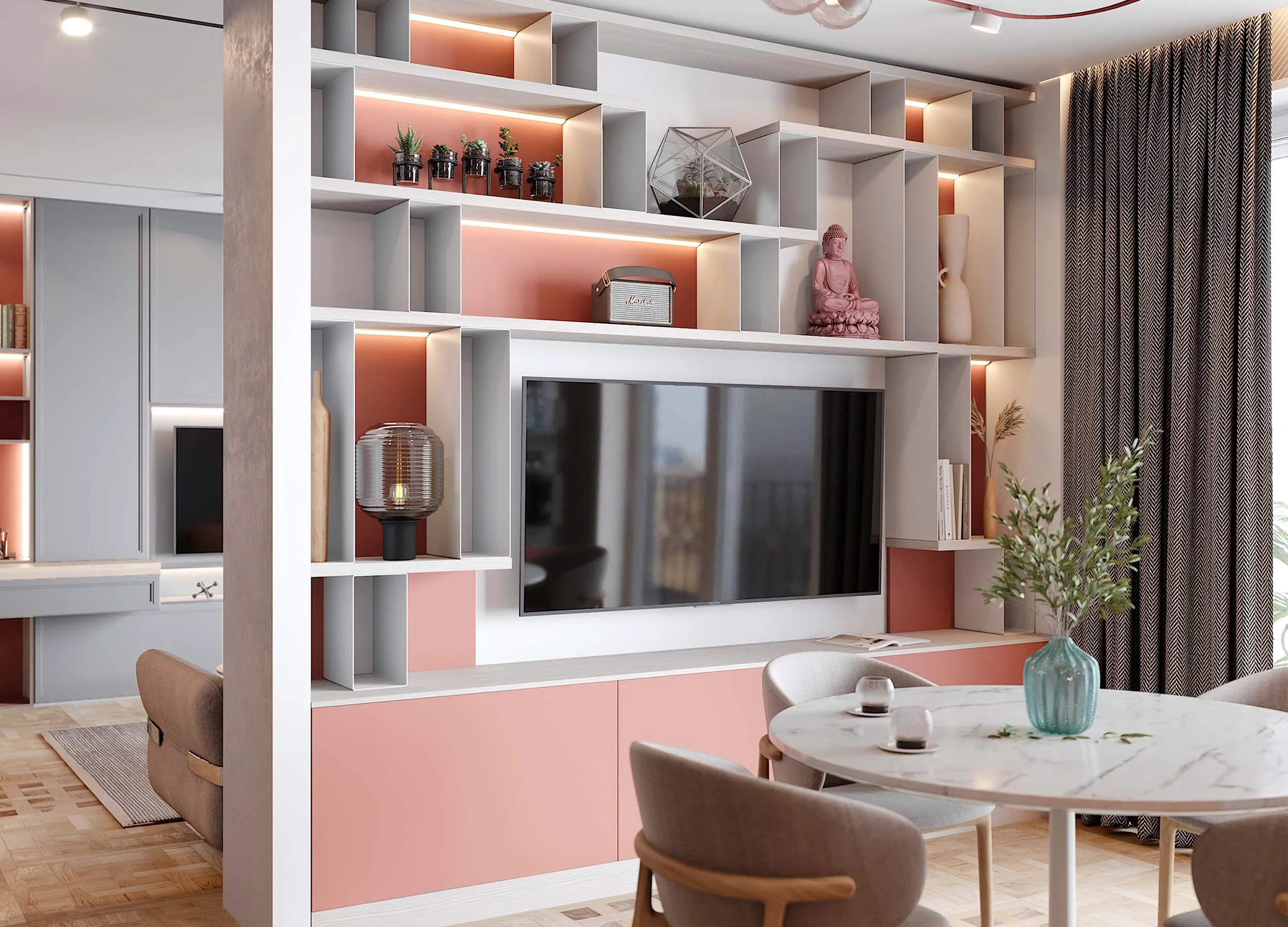 Такие композиции обычно включают в себя открытые полки, выдвижные ящики, витрины или подвесные пеналы. Консоли обеспечивают визуальную легкость, при этом отлично подходят для предметов декора или книг. Также они открывают свободу в размещении отдельных элементов, позволяют создавать индивидуальный, стильный дизайн.