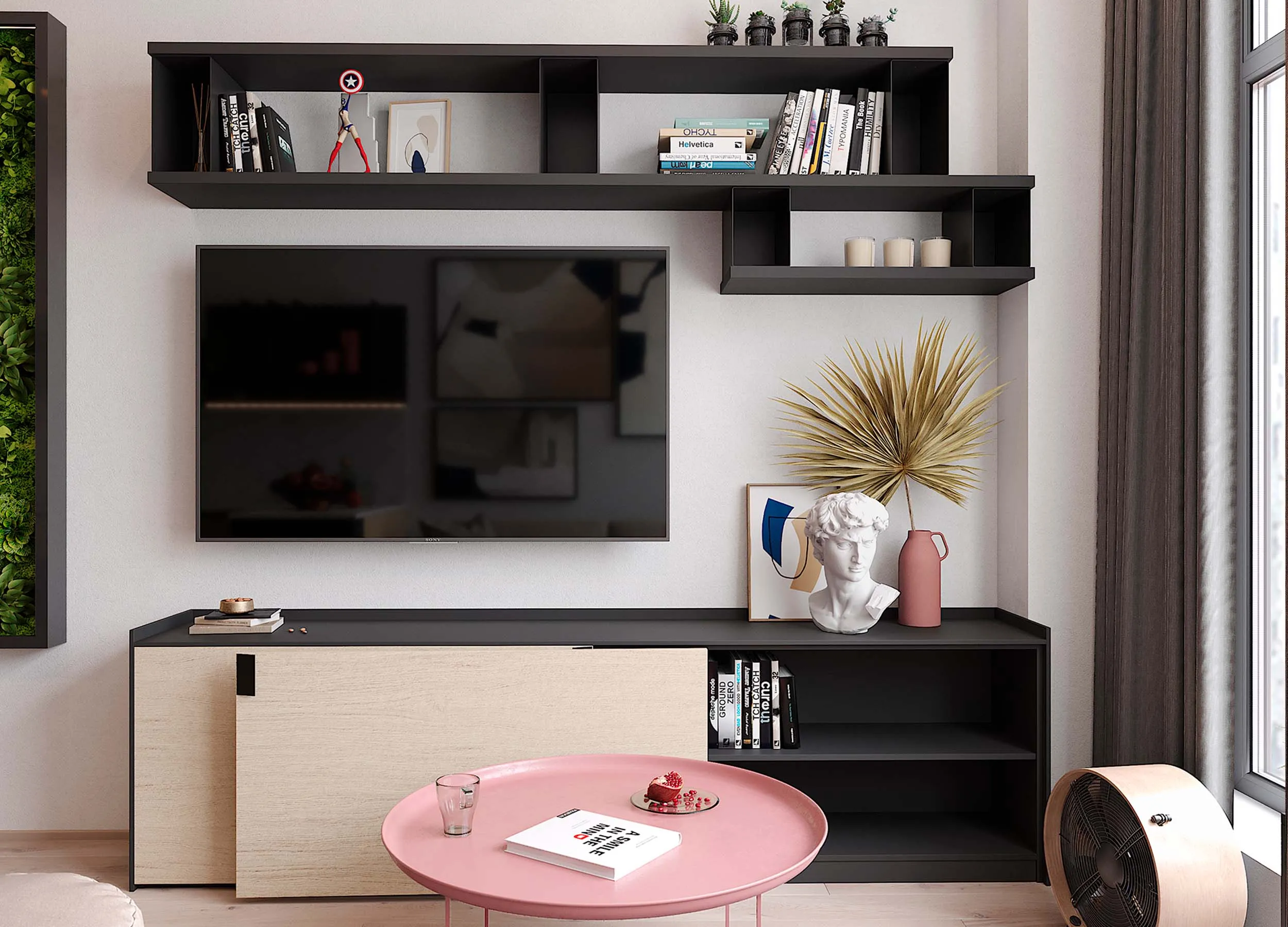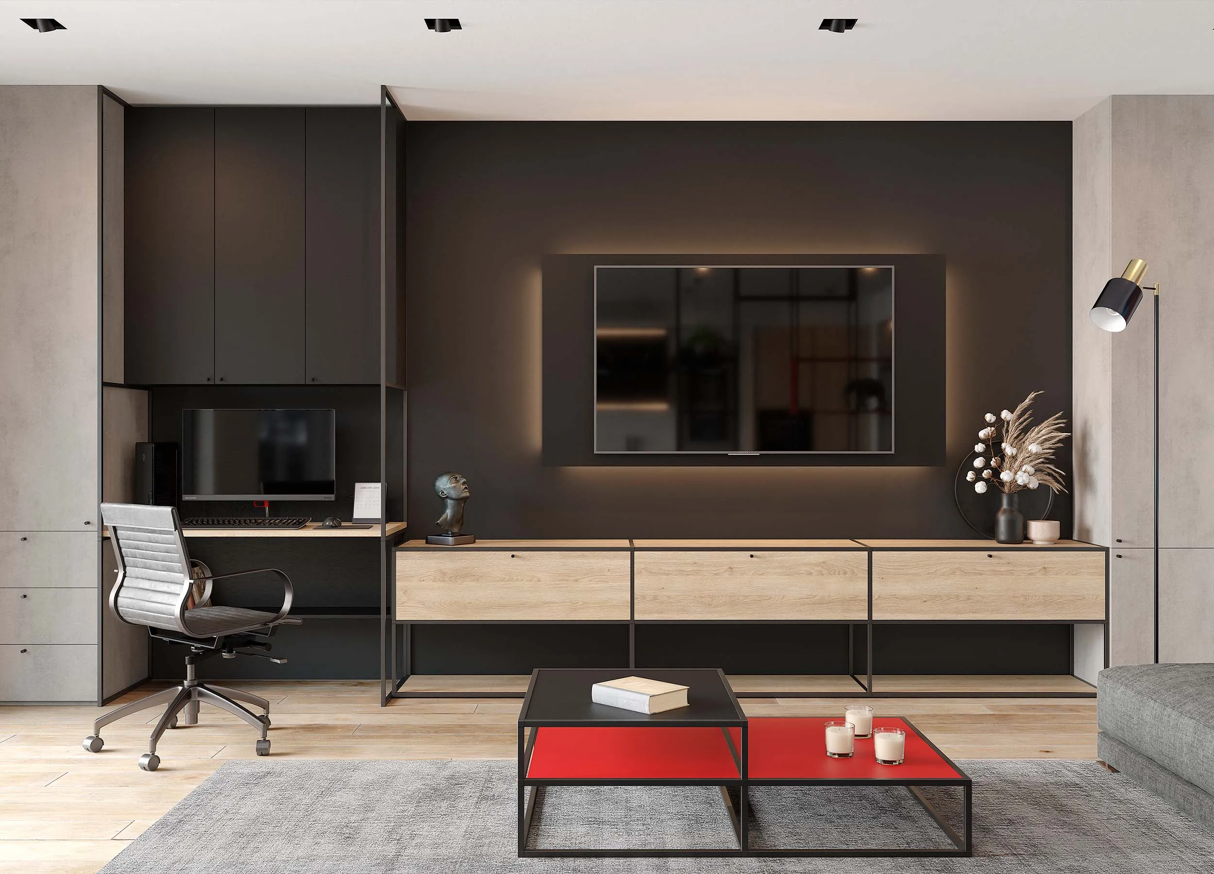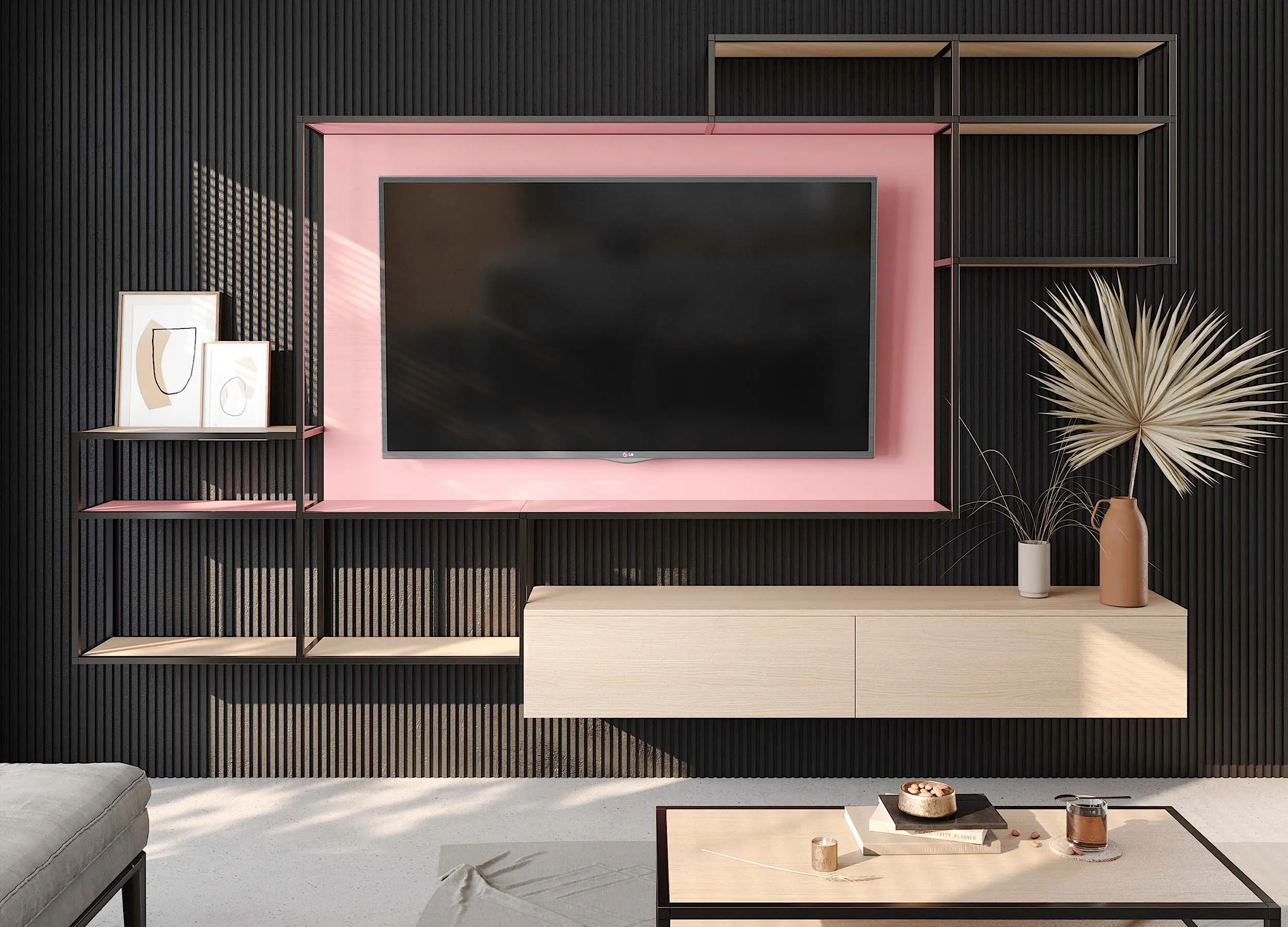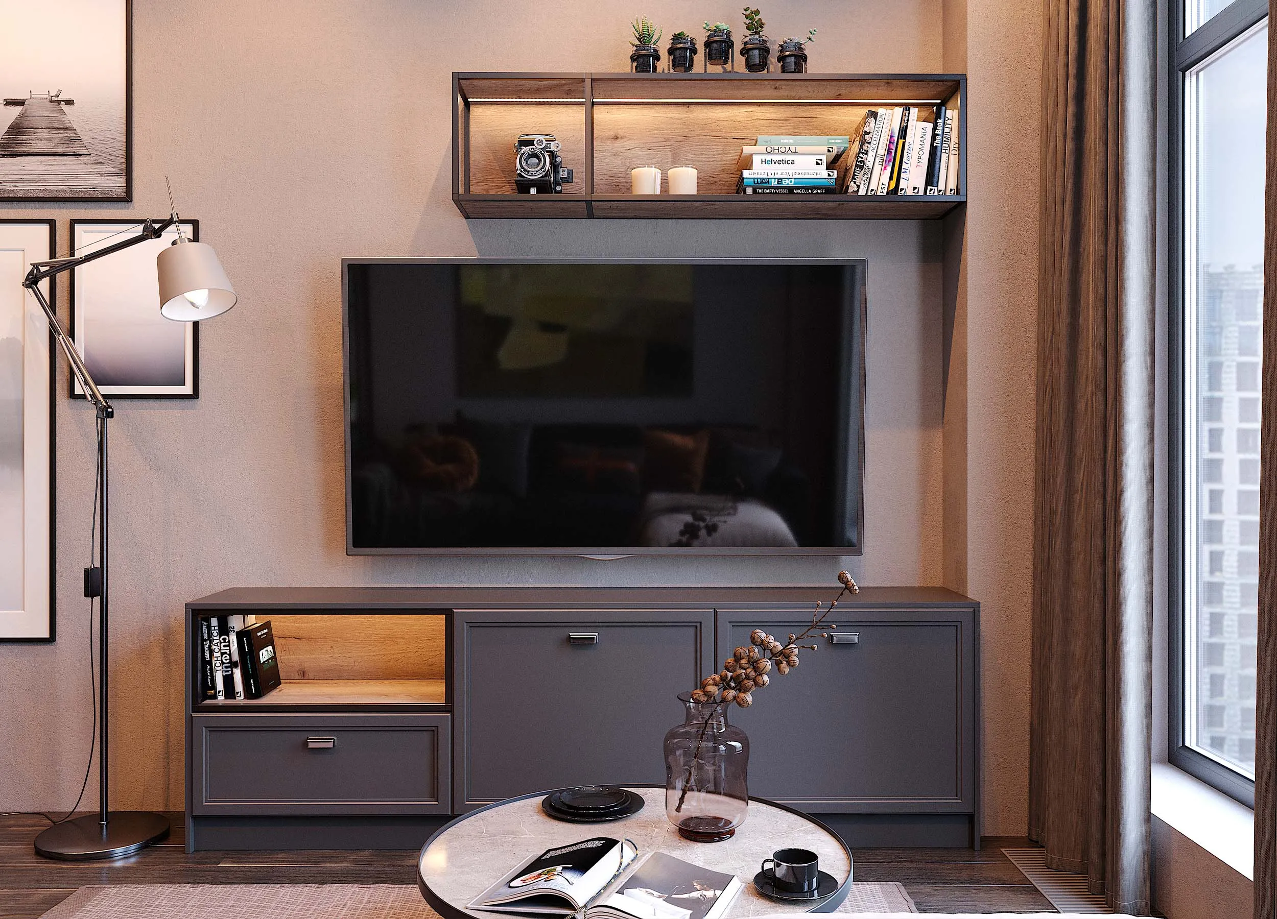 Если письменный стол не нужен, столешницу можно использовать в качестве удобного напольного элемента, выполняющего роль полки. При этом остальное пространство отдается для подвесного размещения телевизора с большой диагональю.