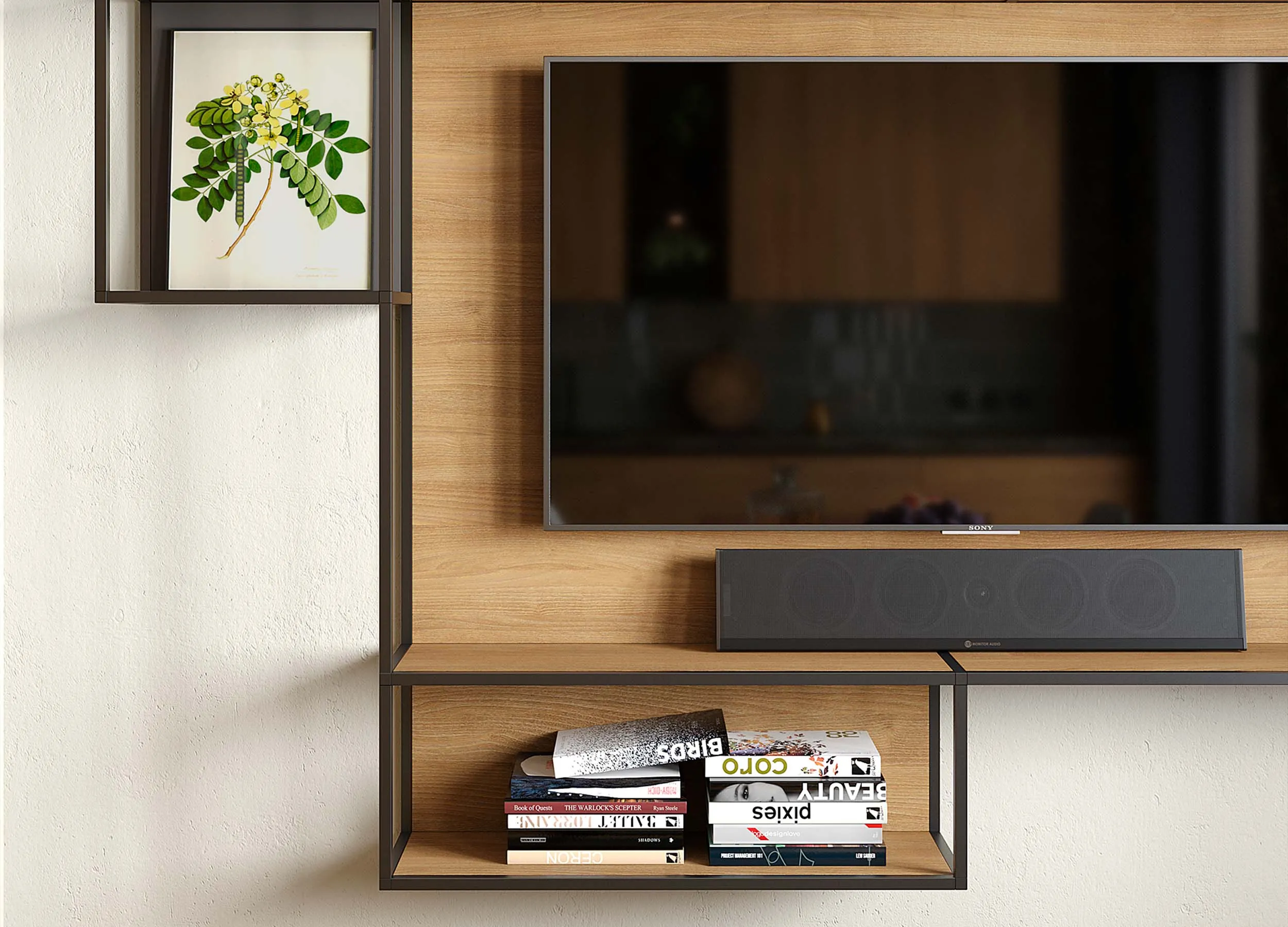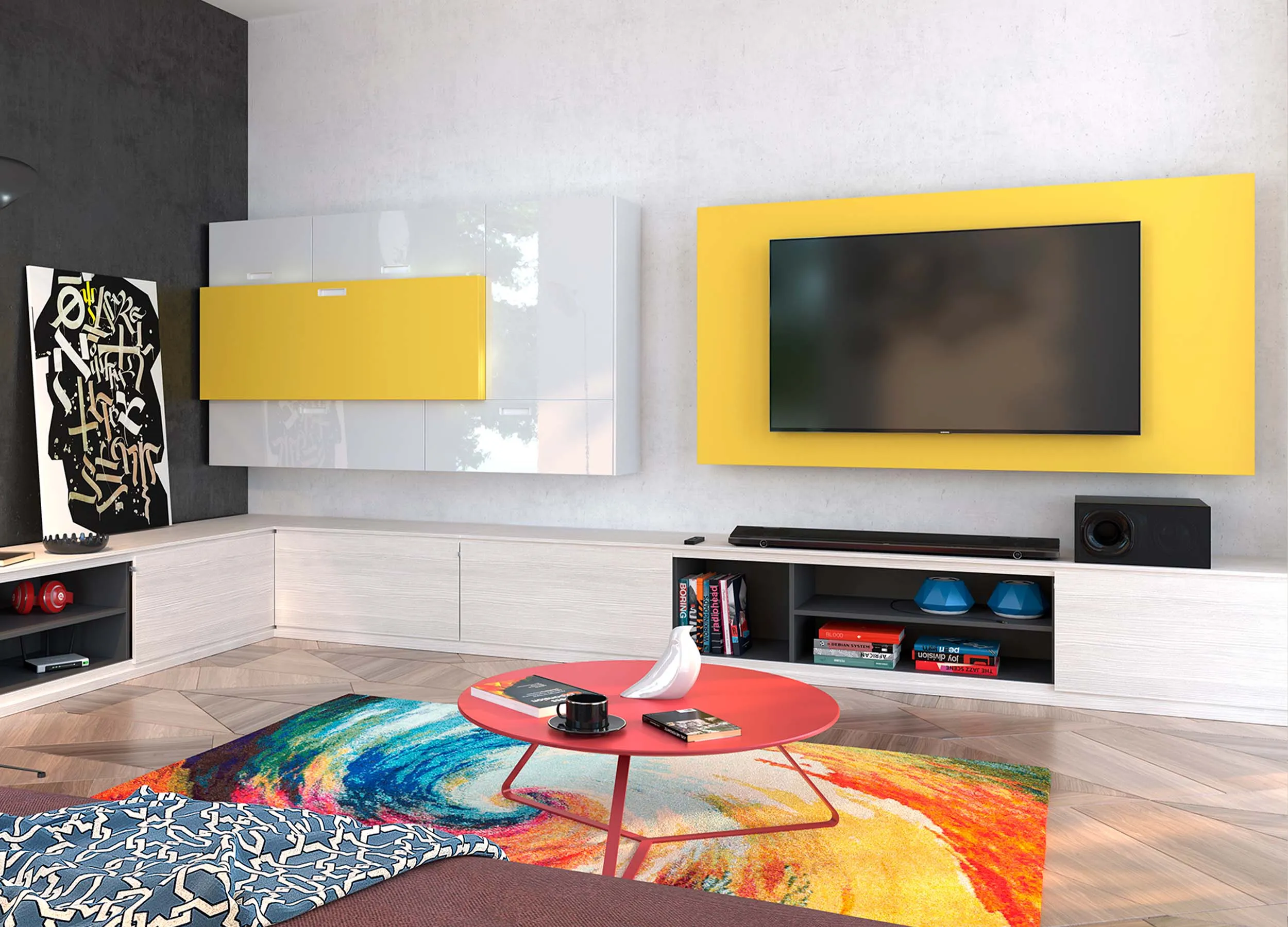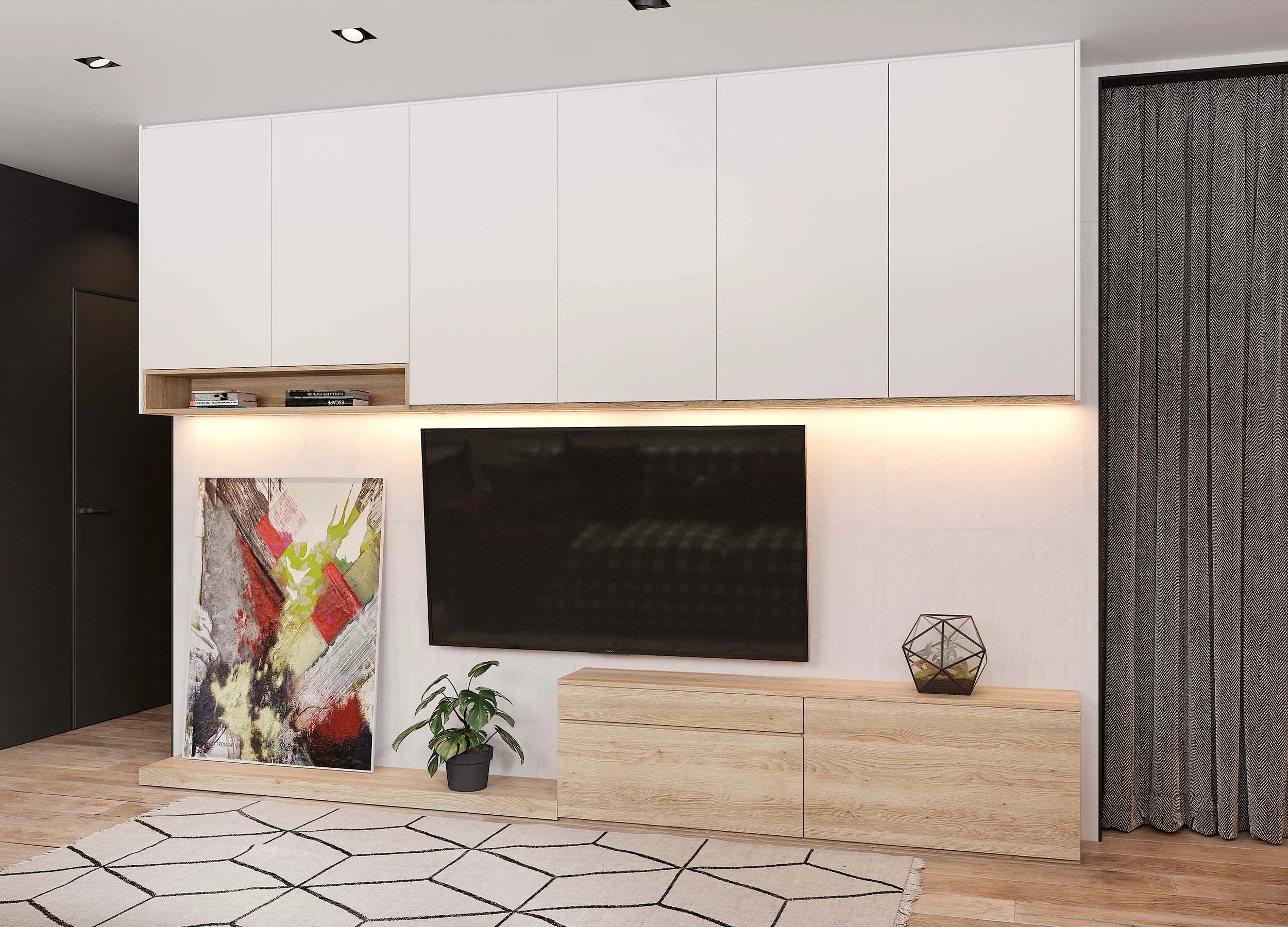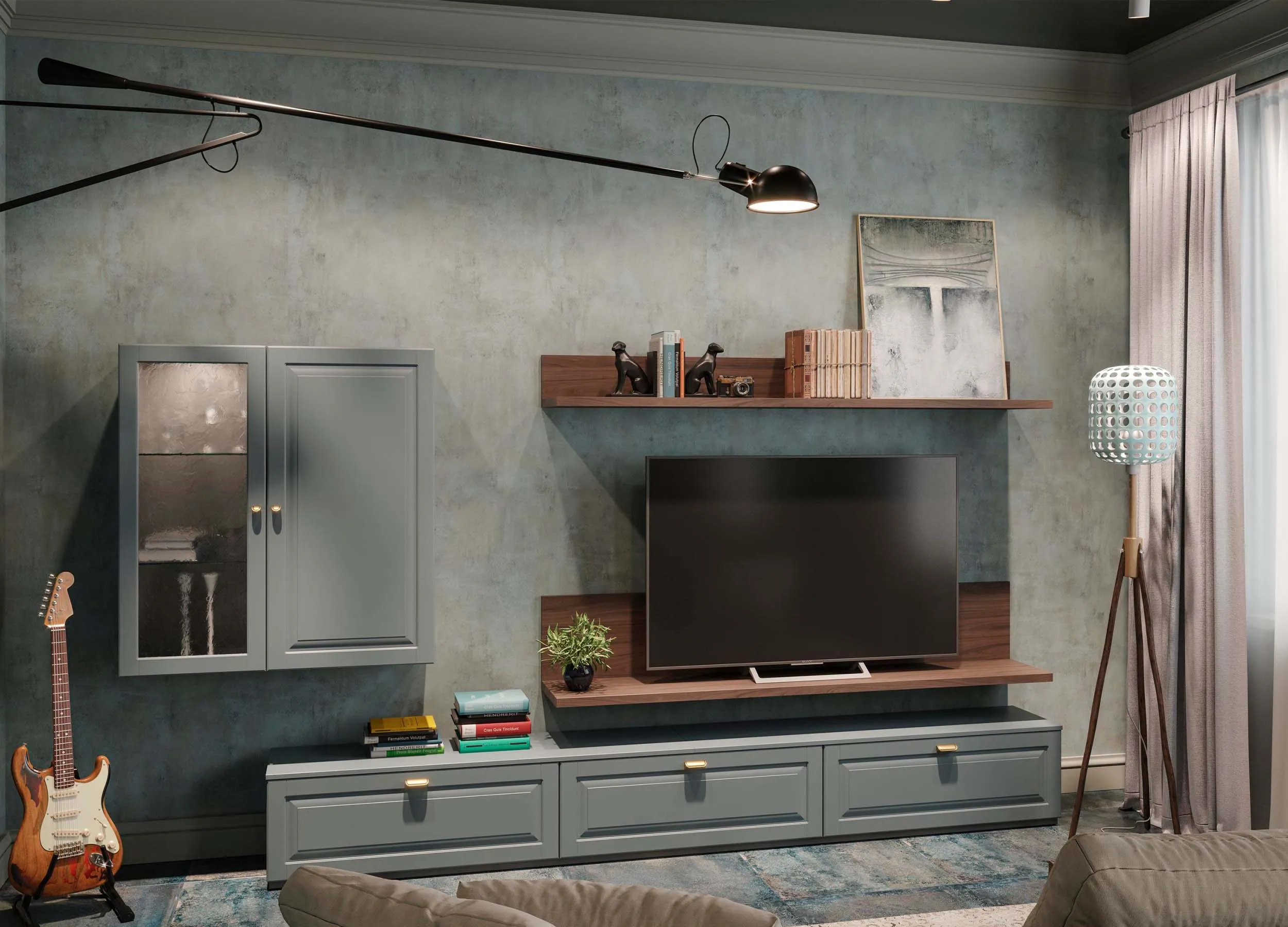 Если письменный стол не нужен, столешницу можно использовать в качестве удобного напольного элемента, выполняющего роль полки. При этом остальное пространство отдается для подвесного размещения телевизора с большой диагональю.