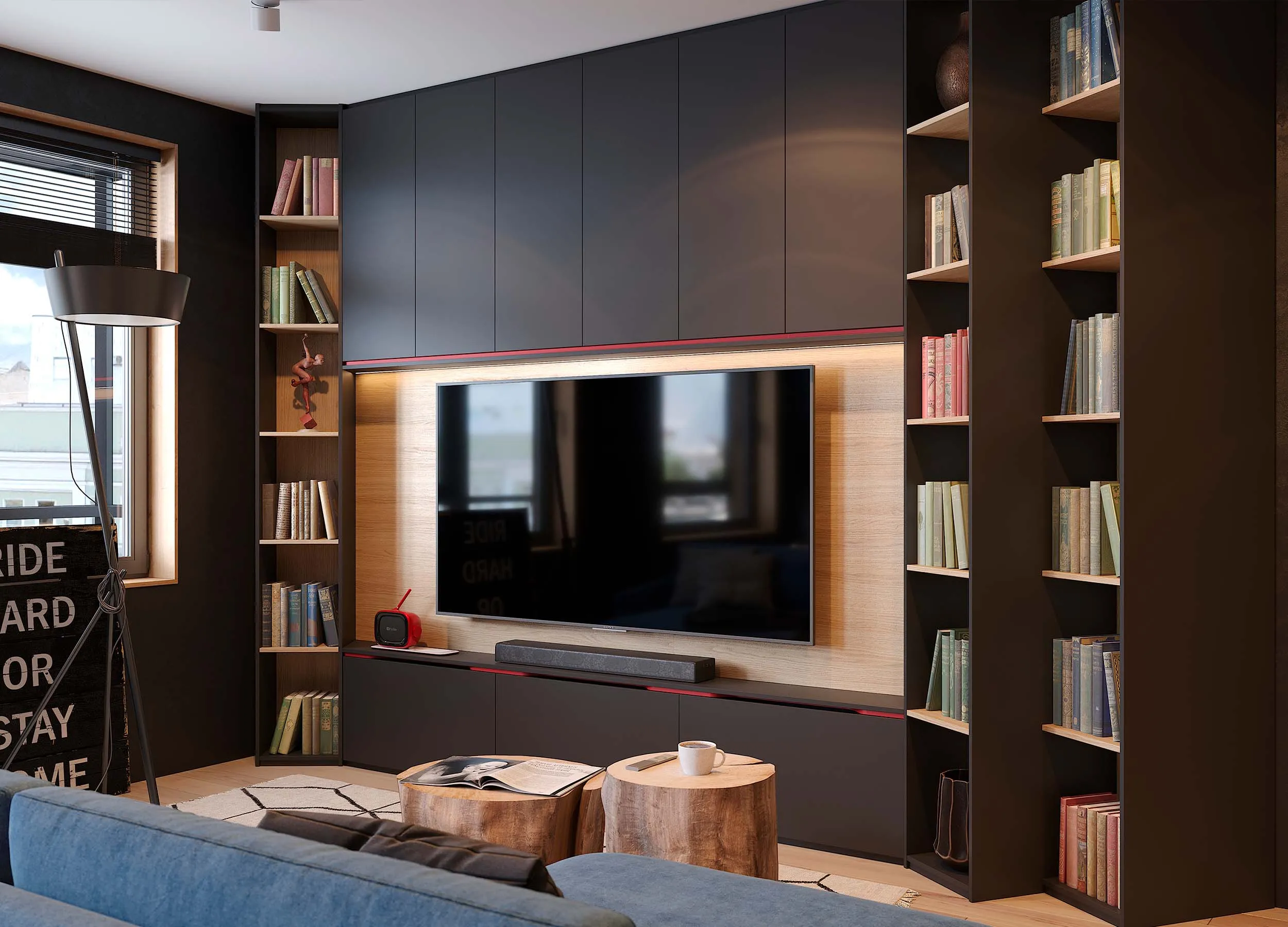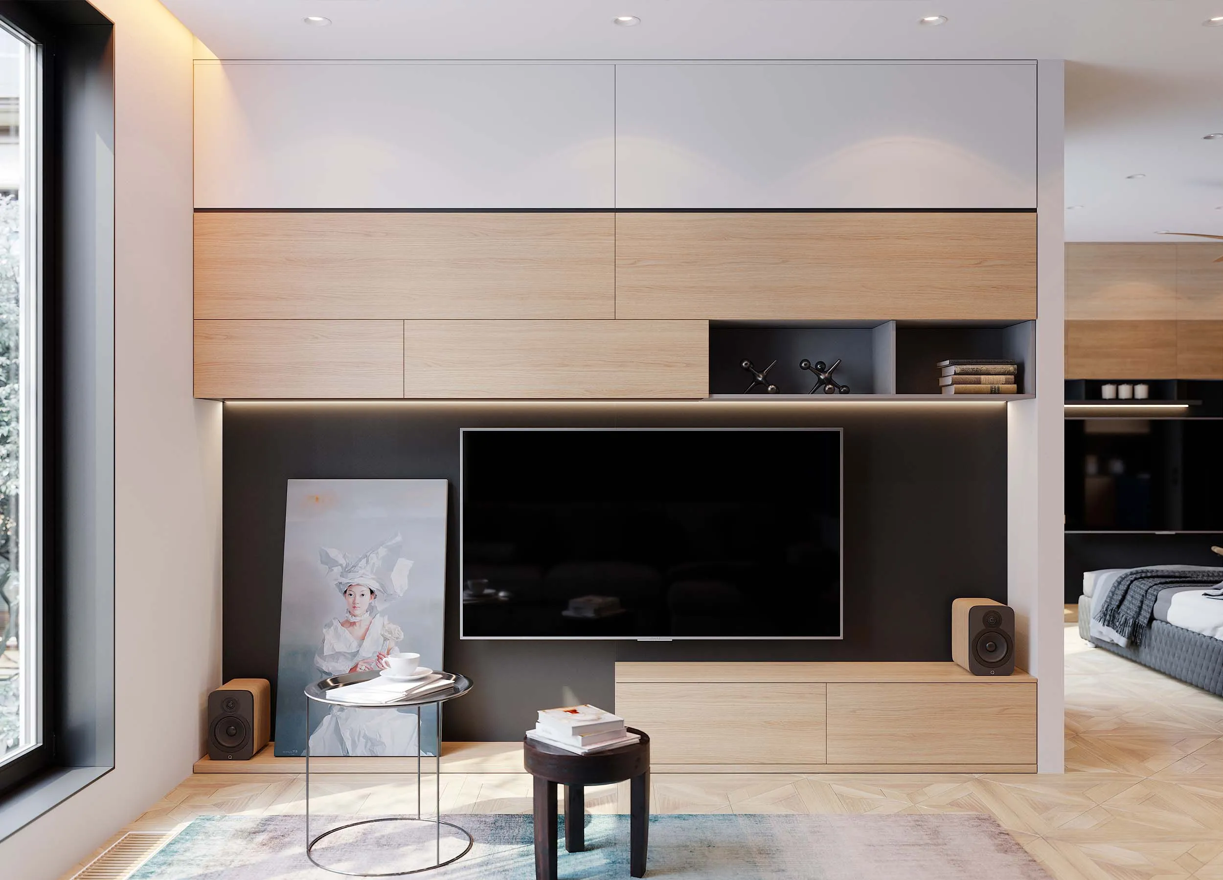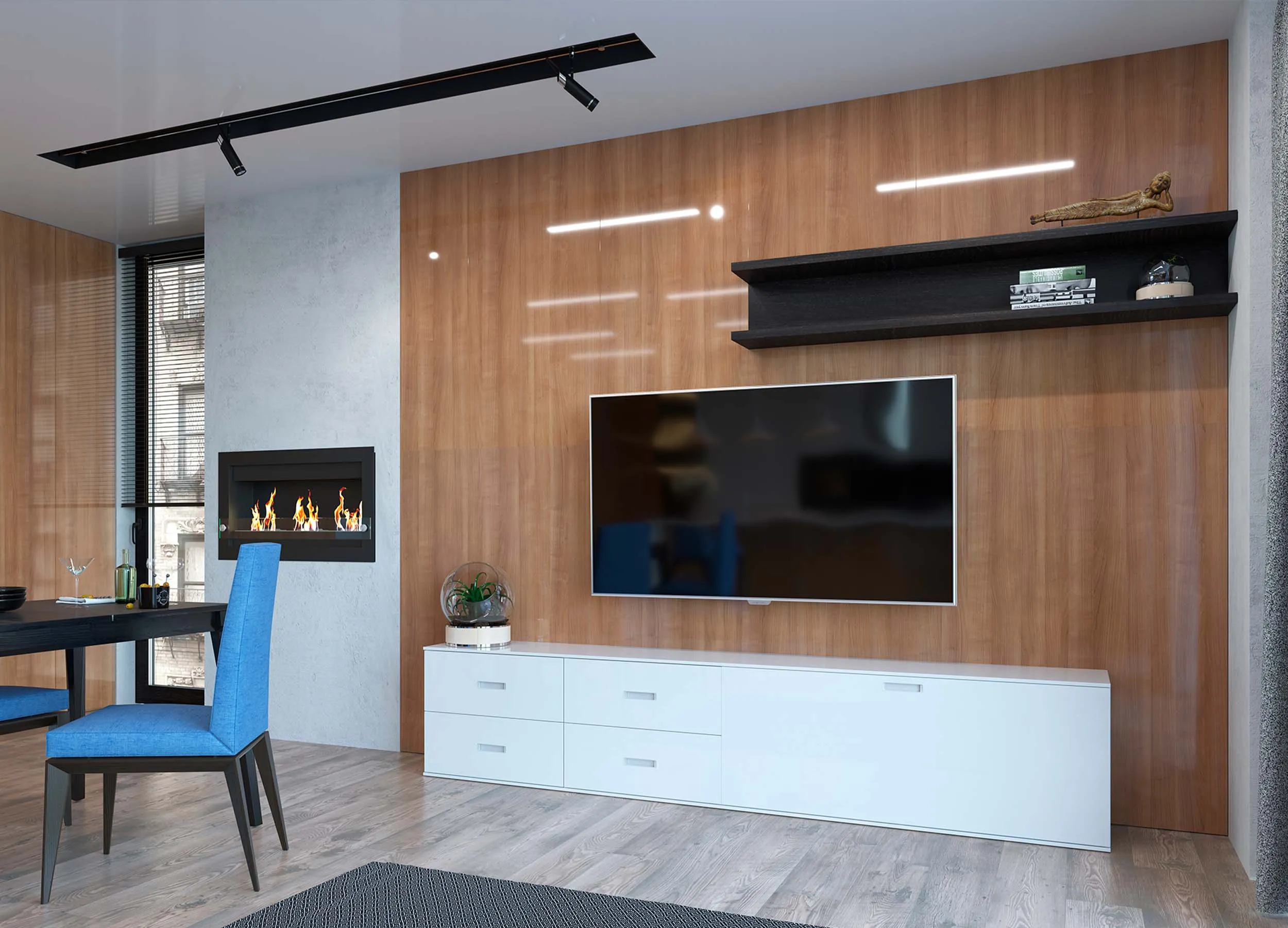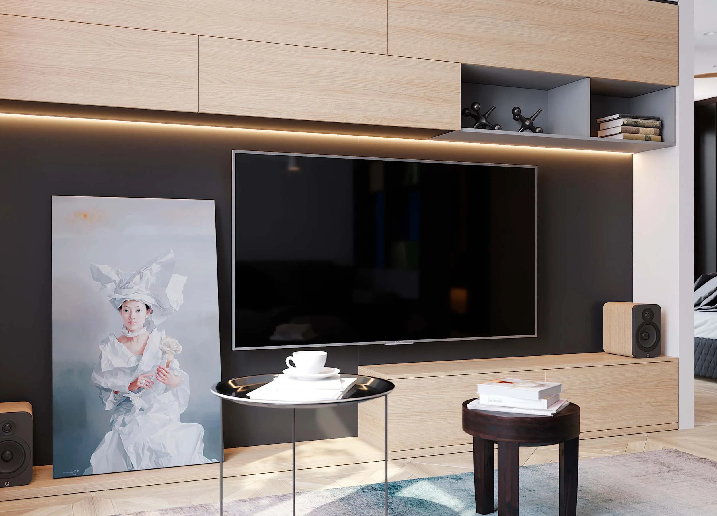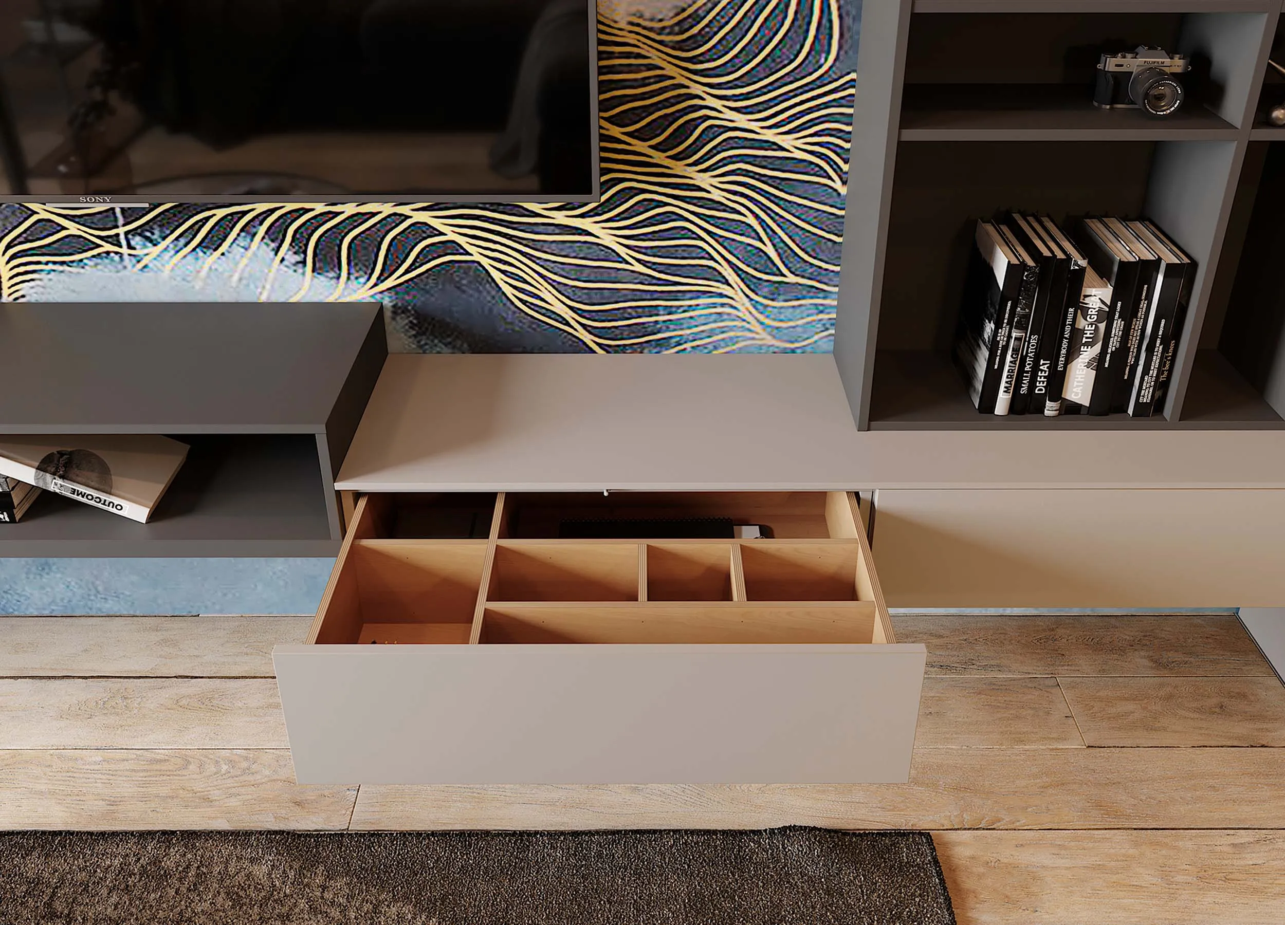 Если письменный стол не нужен, столешницу можно использовать в качестве удобного напольного элемента, выполняющего роль полки. При этом остальное пространство отдается для подвесного размещения телевизора с большой диагональю.