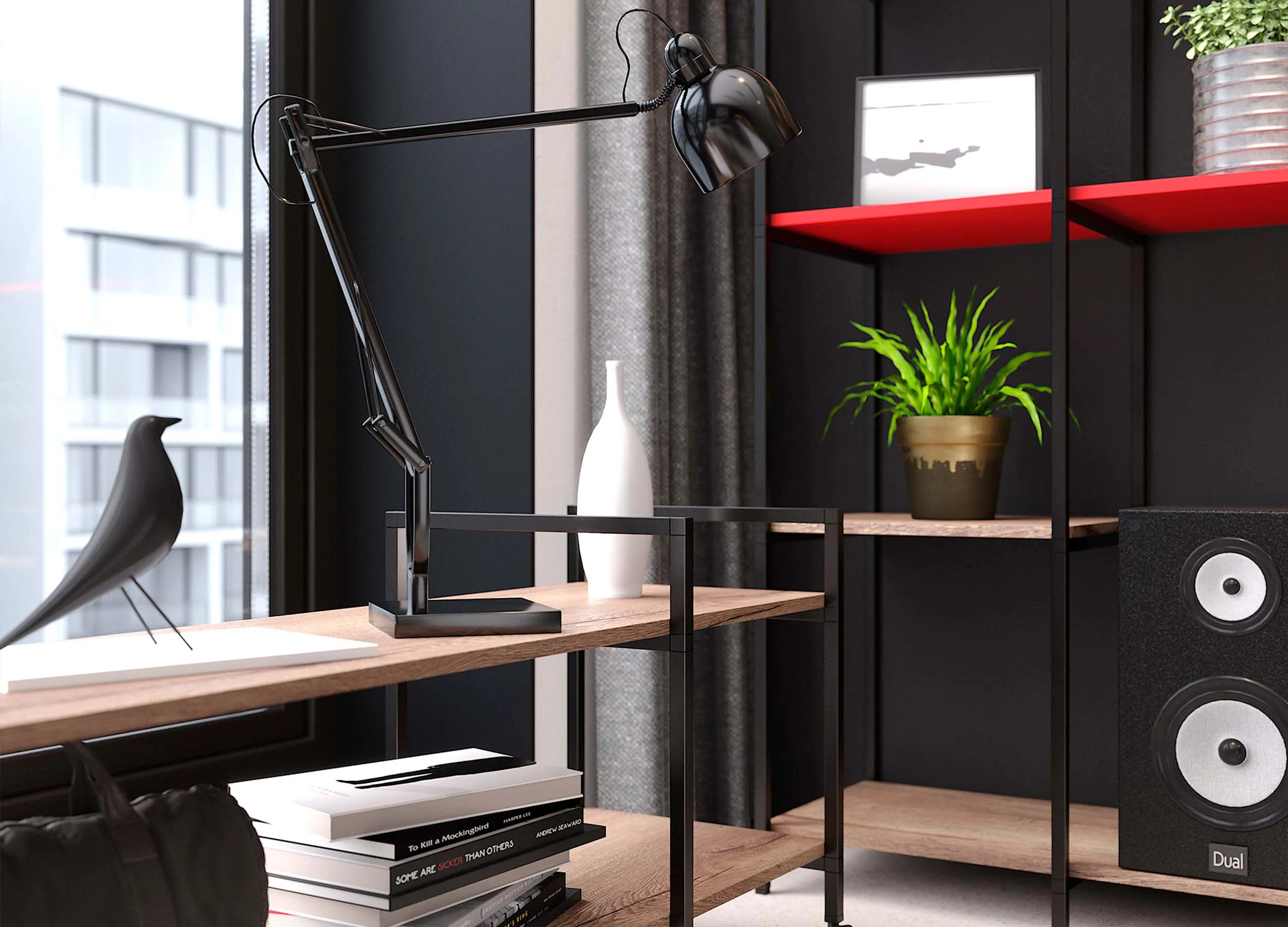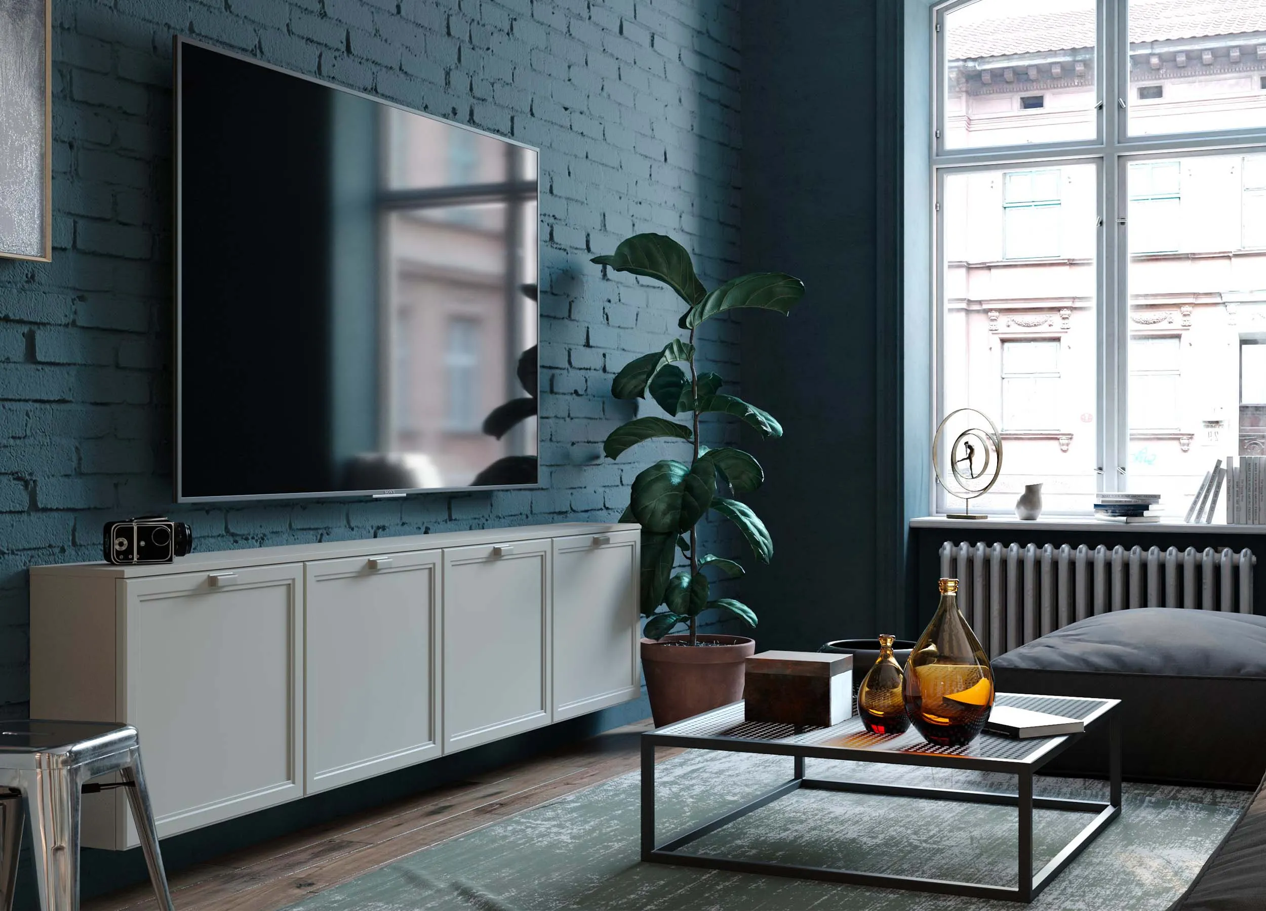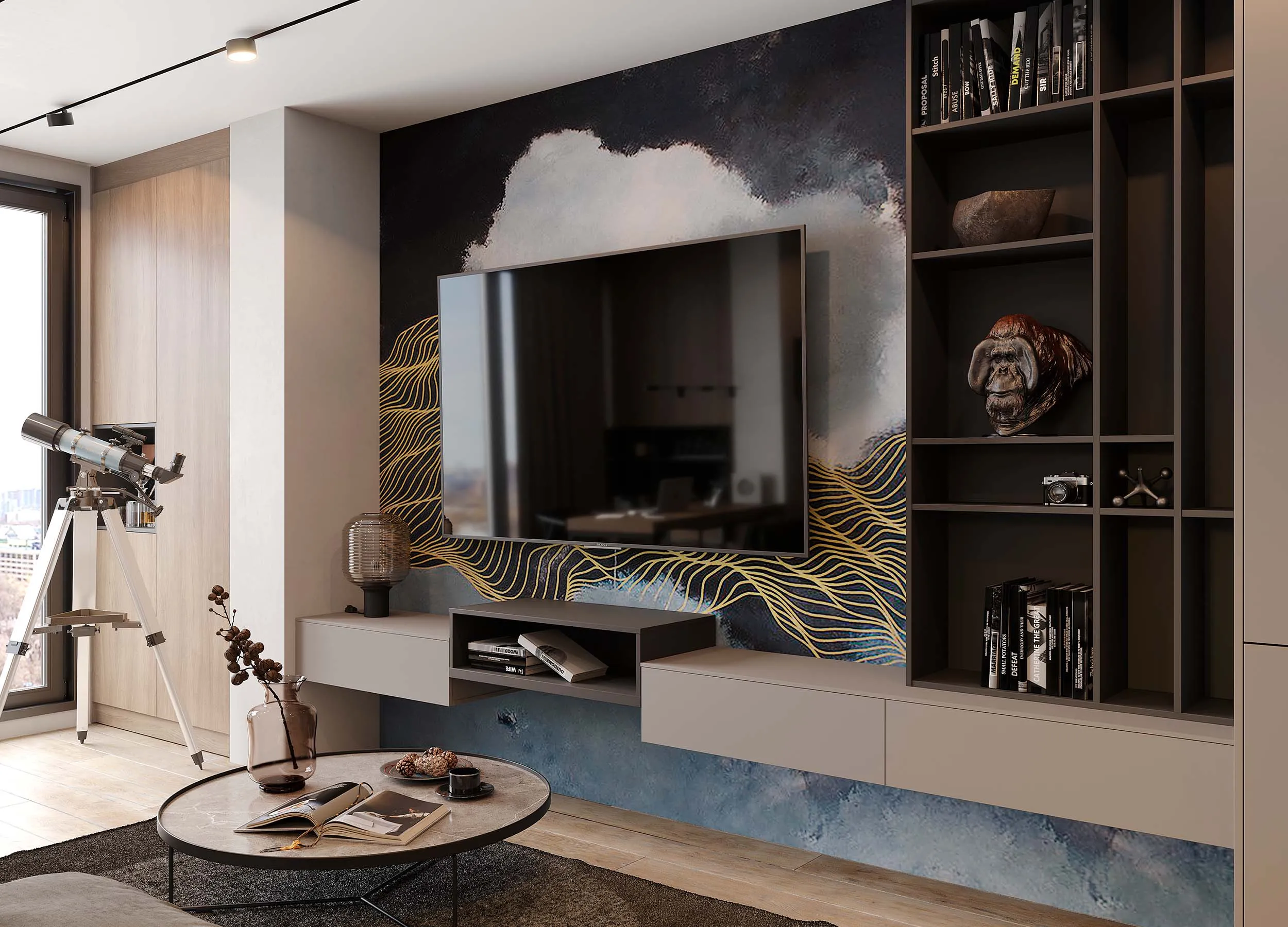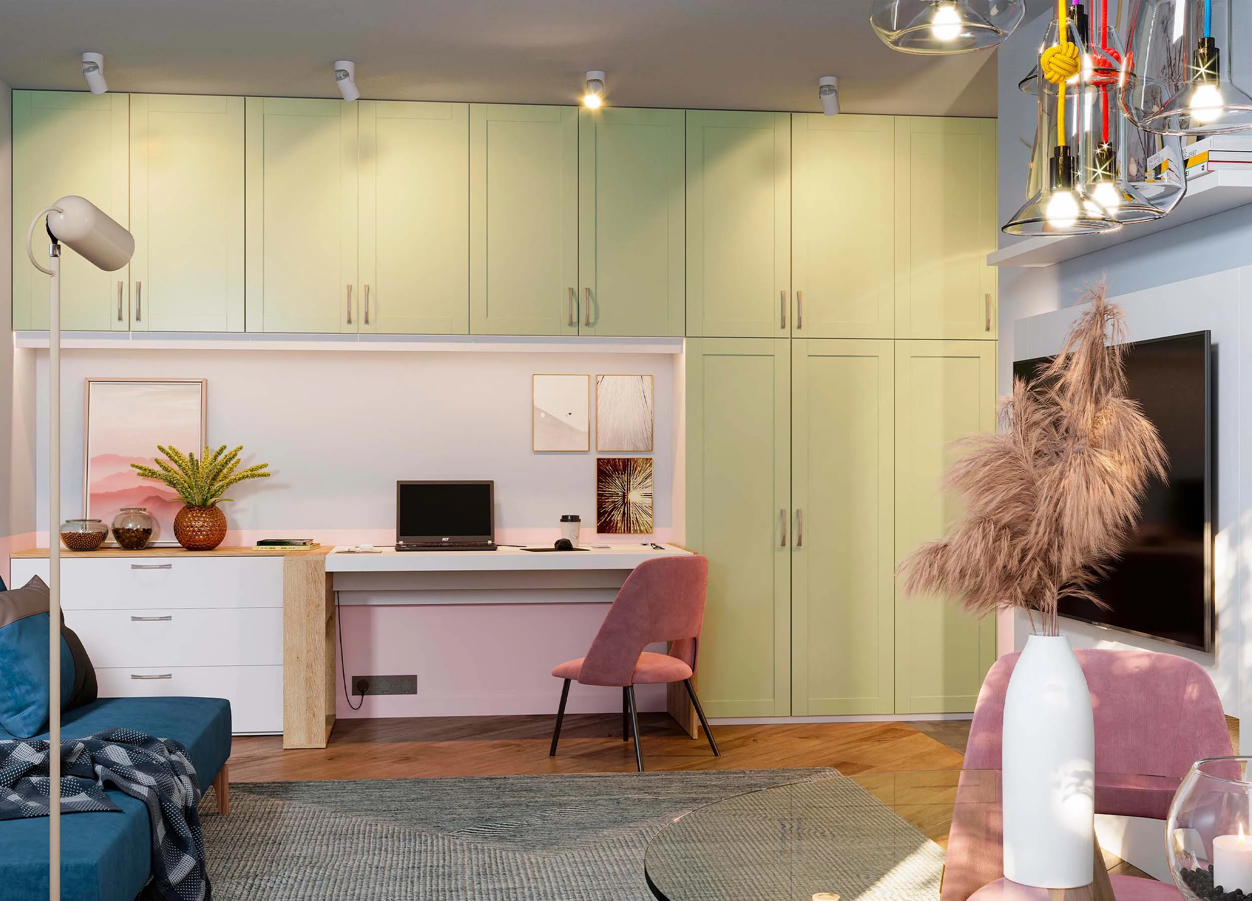 Если письменный стол не нужен, столешницу можно использовать в качестве удобного напольного элемента, выполняющего роль полки. При этом остальное пространство отдается для подвесного размещения телевизора с большой диагональю.