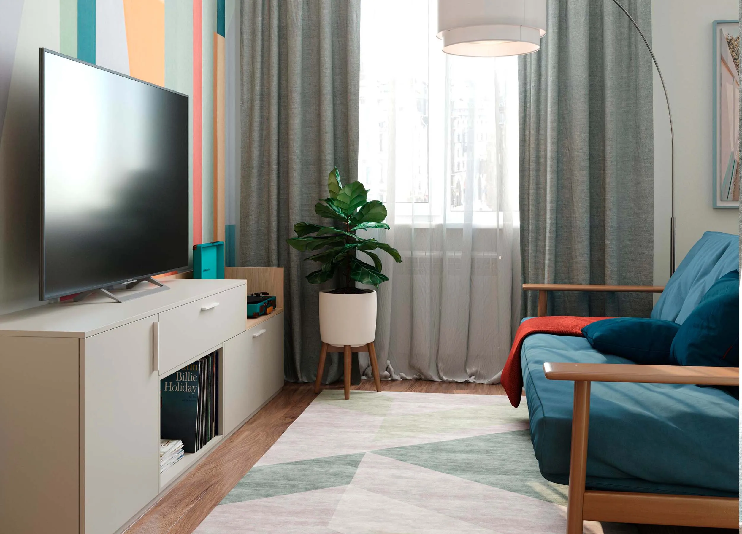 - маскировка неправильной, сложной конфигурации гостиной;
