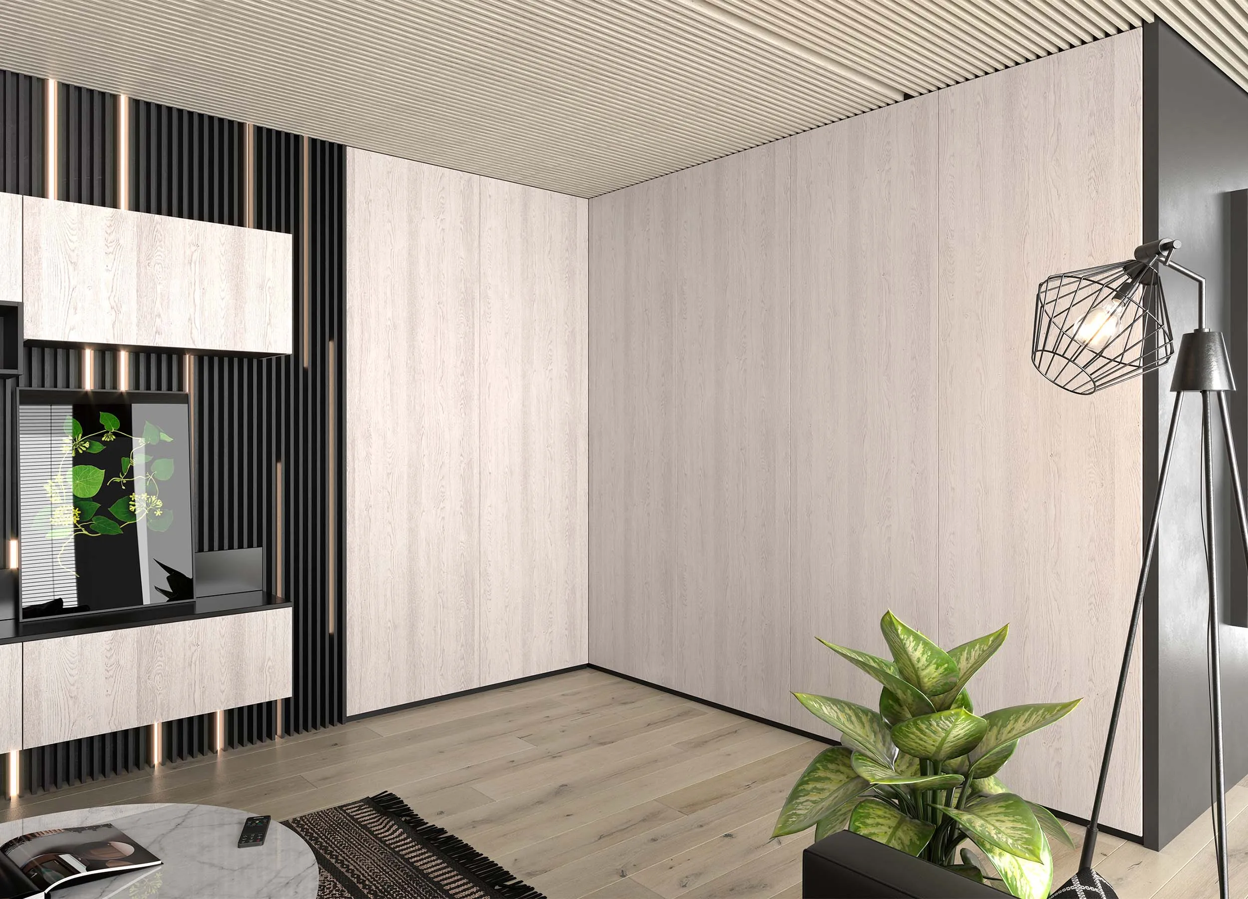 В настоящее время для производства используются и другие материалы – металл, стекло, пластик, плиты ДСП и МДФ. Для оформления применяются виниловые и акриловые пленки, витражные вставки, светодиодная подсветка. Наиболее востребованы стенки из ламинированных древесно-стружечных плит. Они могут приобретать разный внешний вид, идеально подходят для интерьера Лофт, минимализм или неоклассика.