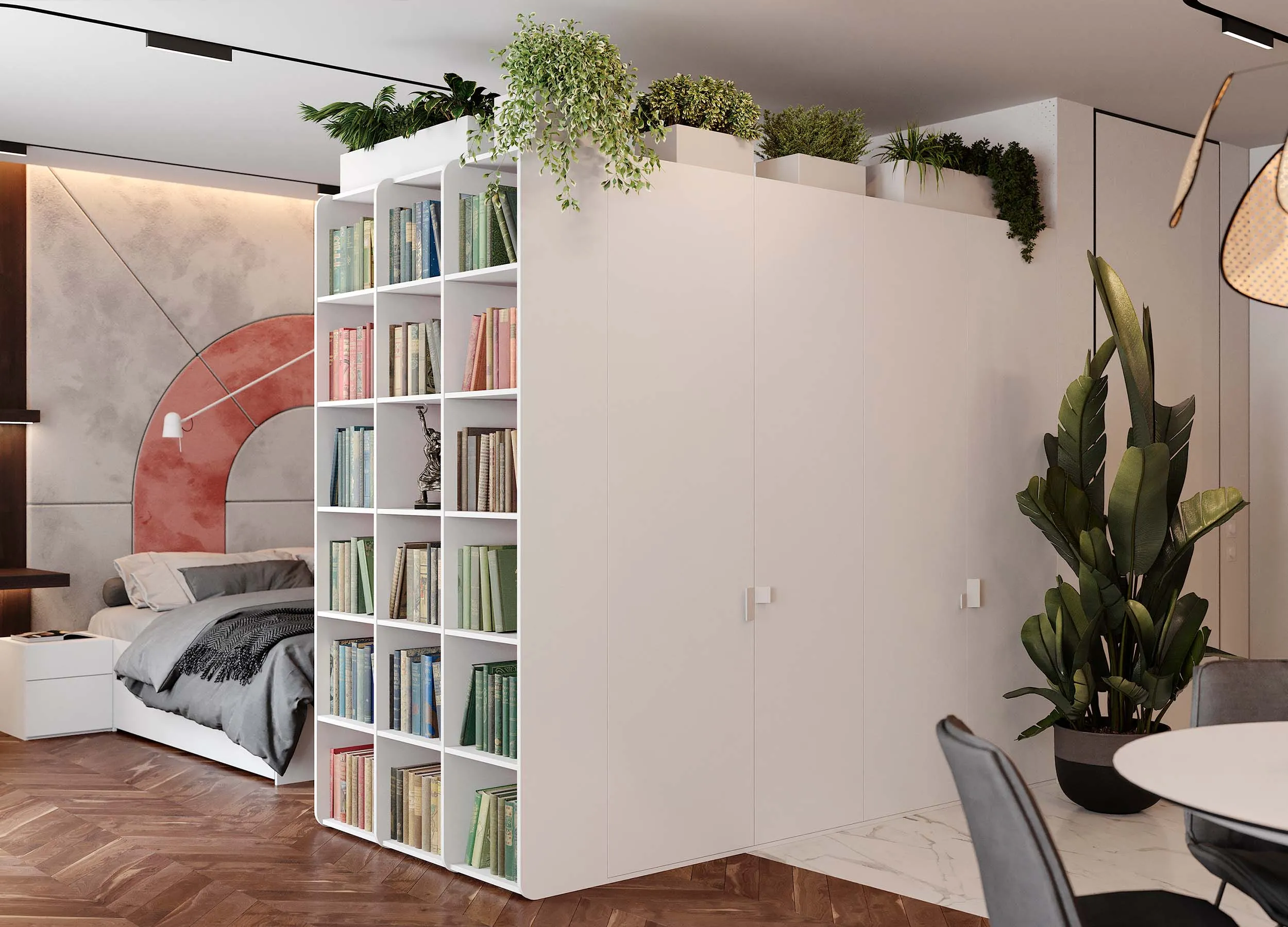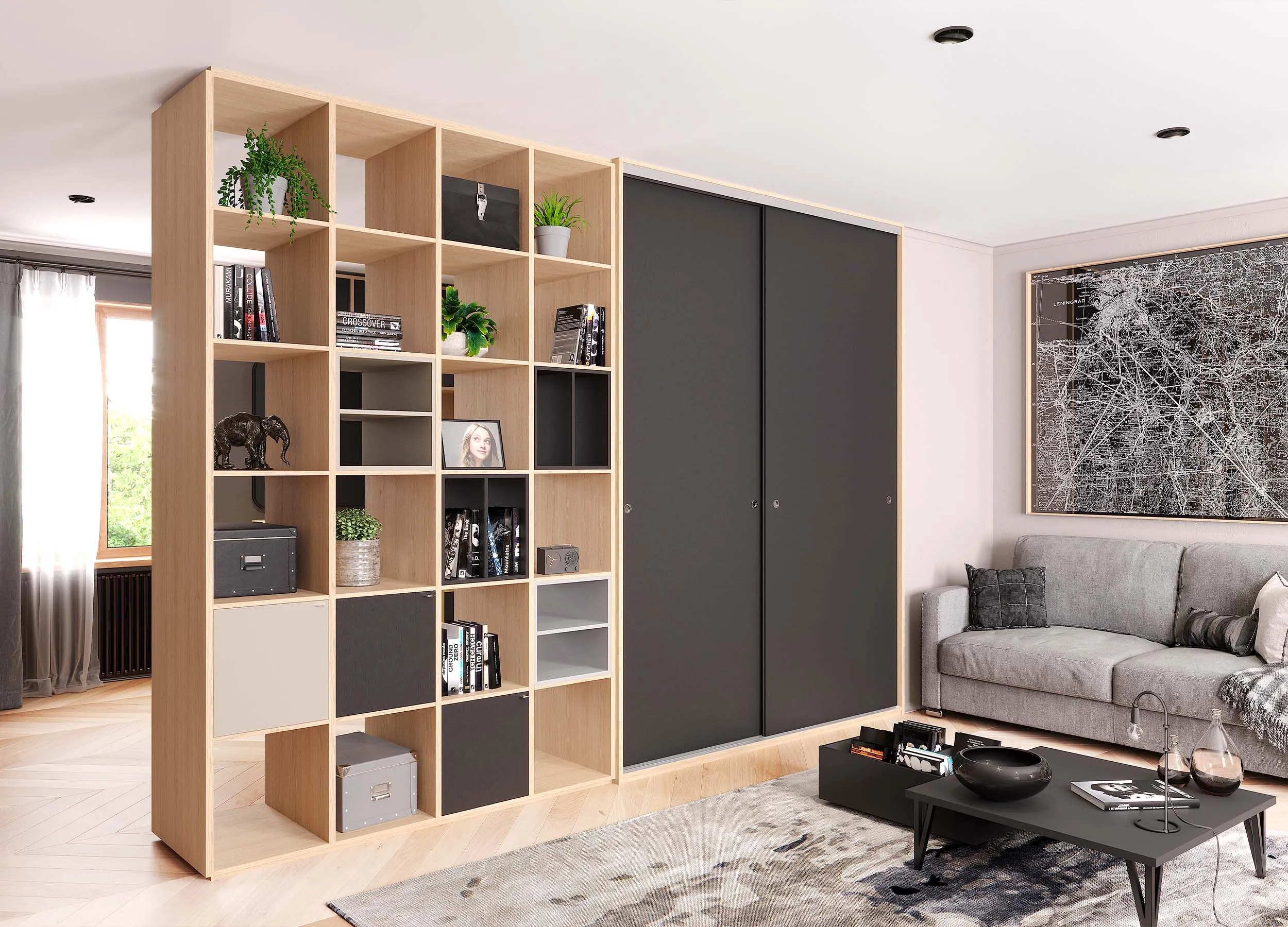 Обычно это варианты с многочисленными бельевыми и платяными шкафами, блоками в виде открытых полок или выдвижных ящиков. Такие системы используются только для хранения вещей, освобождая пространство комнаты и позволяя отдельно организовать места для отдыха.