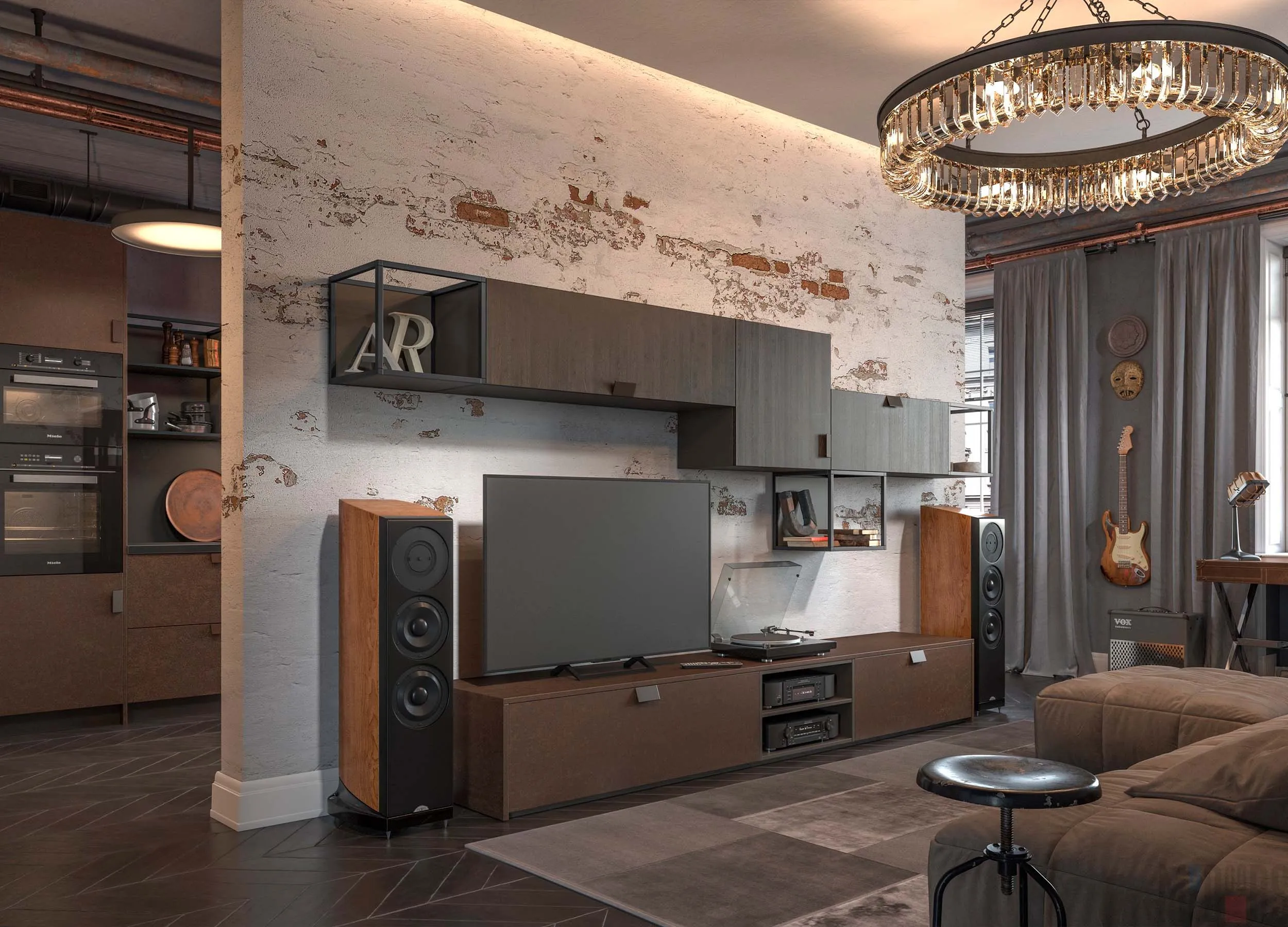 Одним из вариантов для стильного интерьера выступает обстановка Лофт. На фото стенок для зала в современном стиле представлены варианты гарнитуров, выделяющиеся строгим и функциональным оформлением.