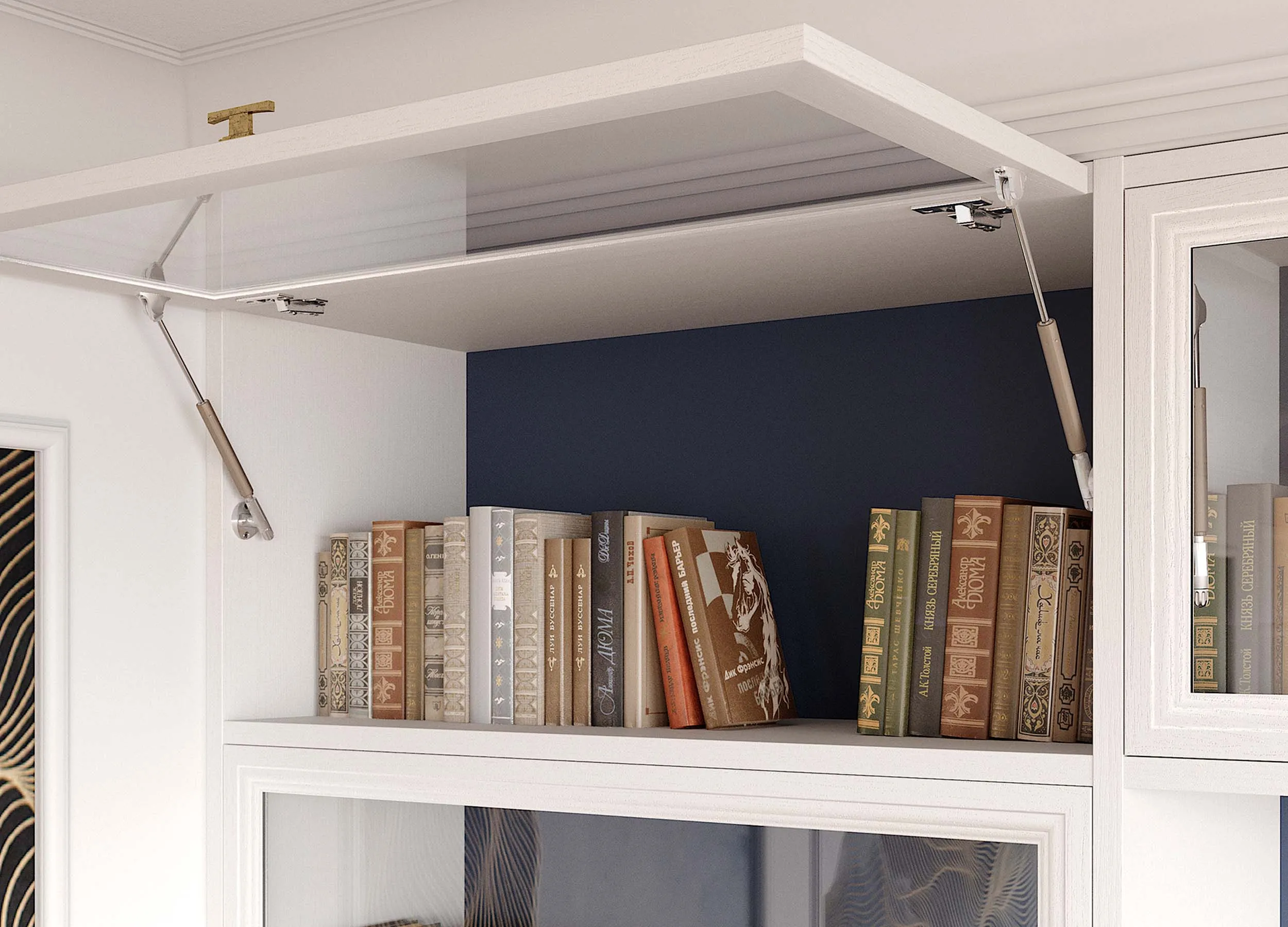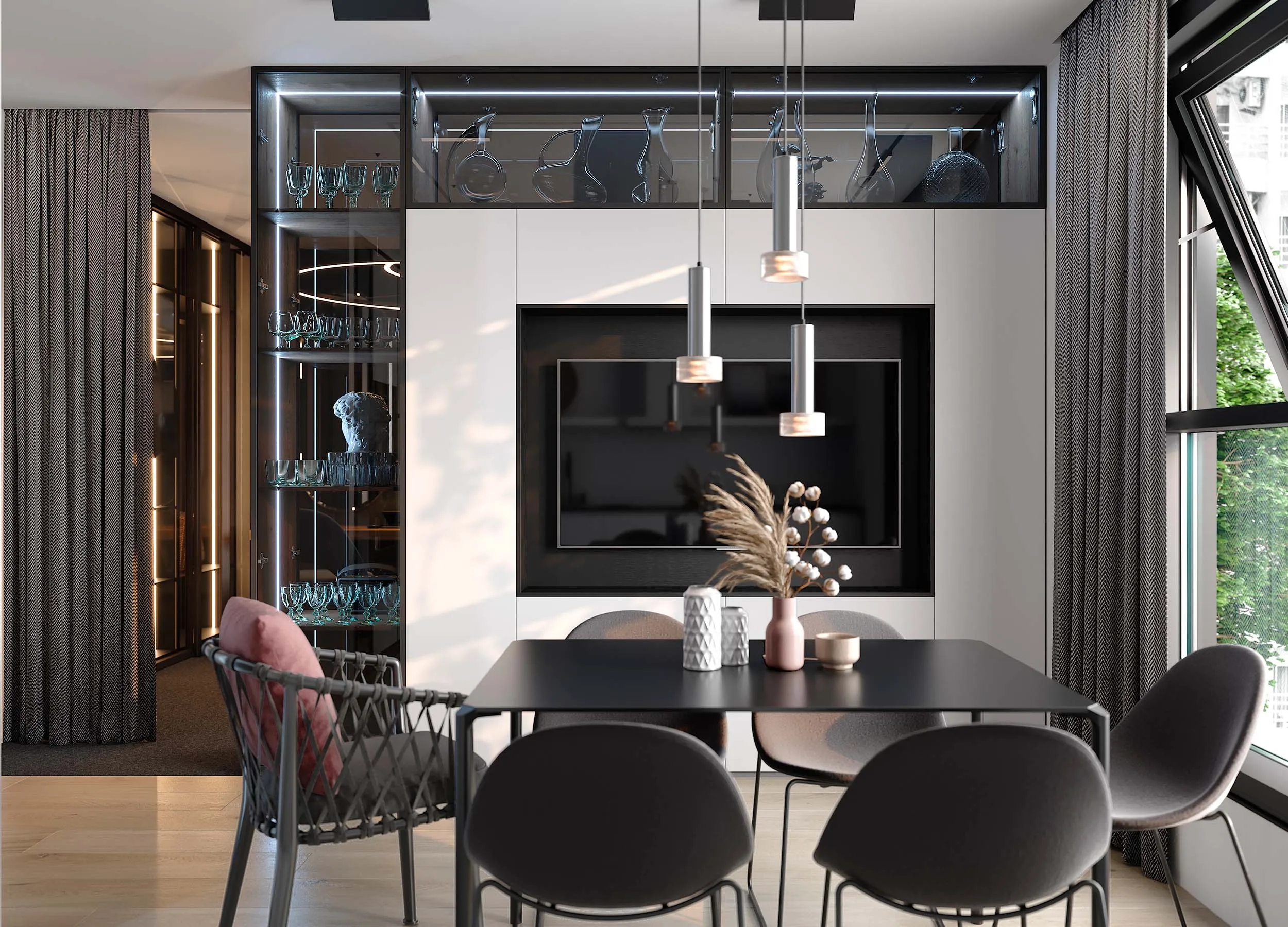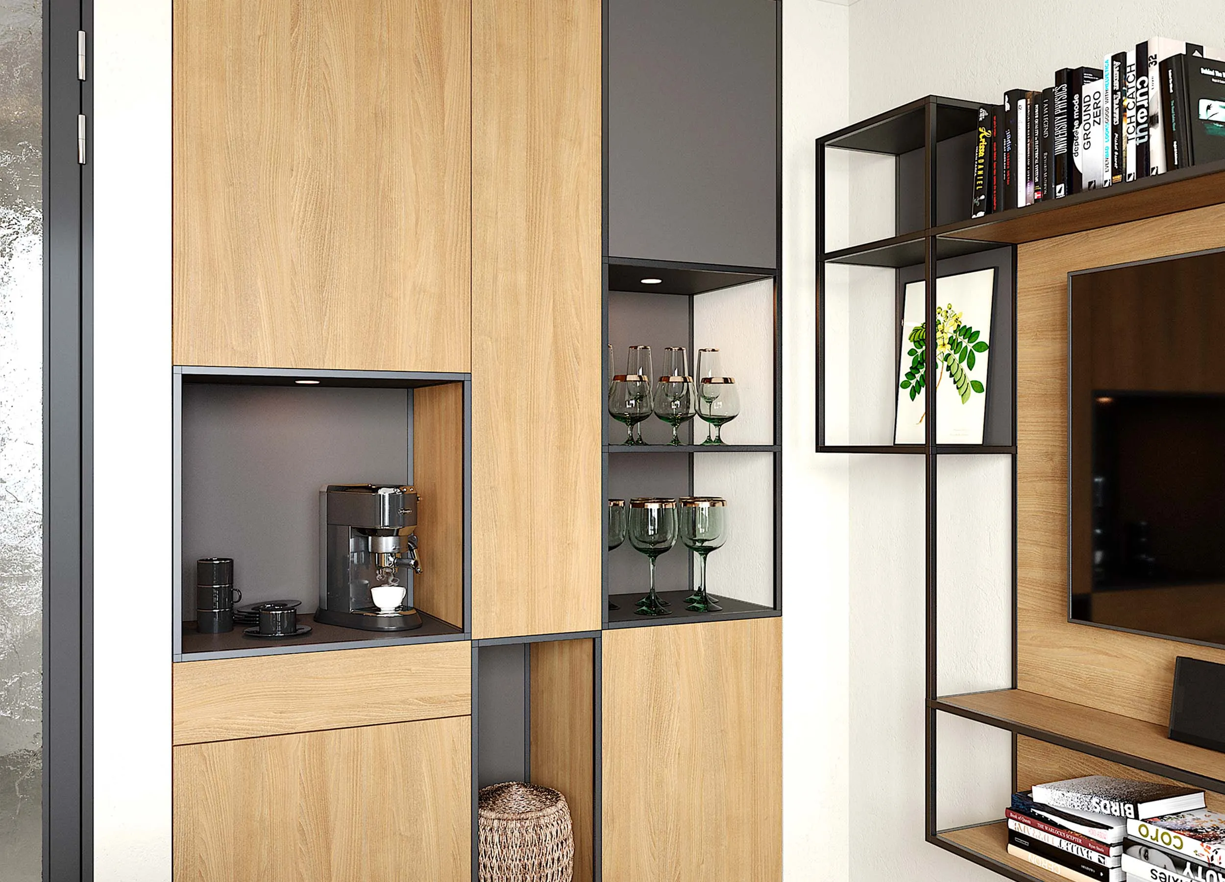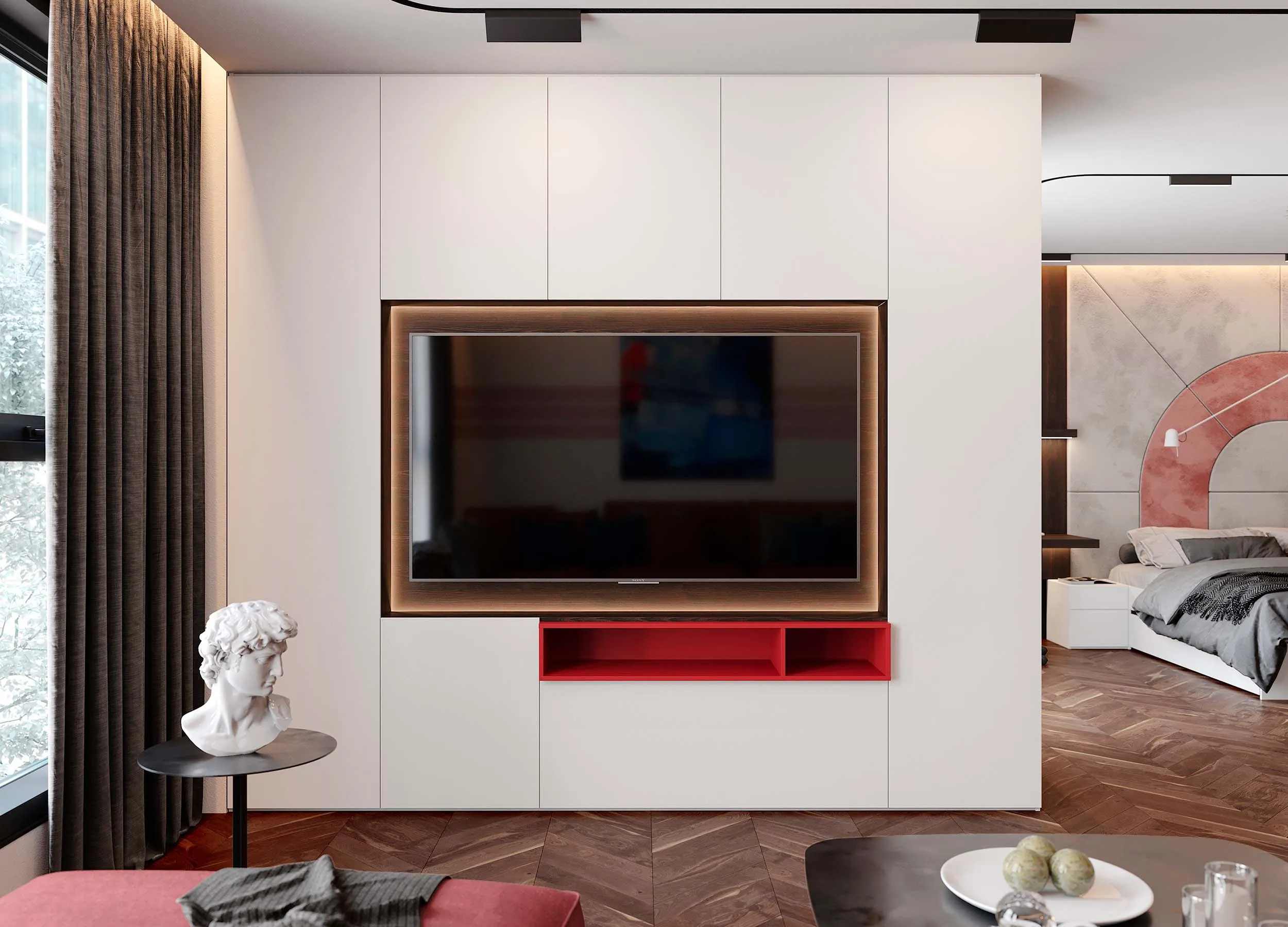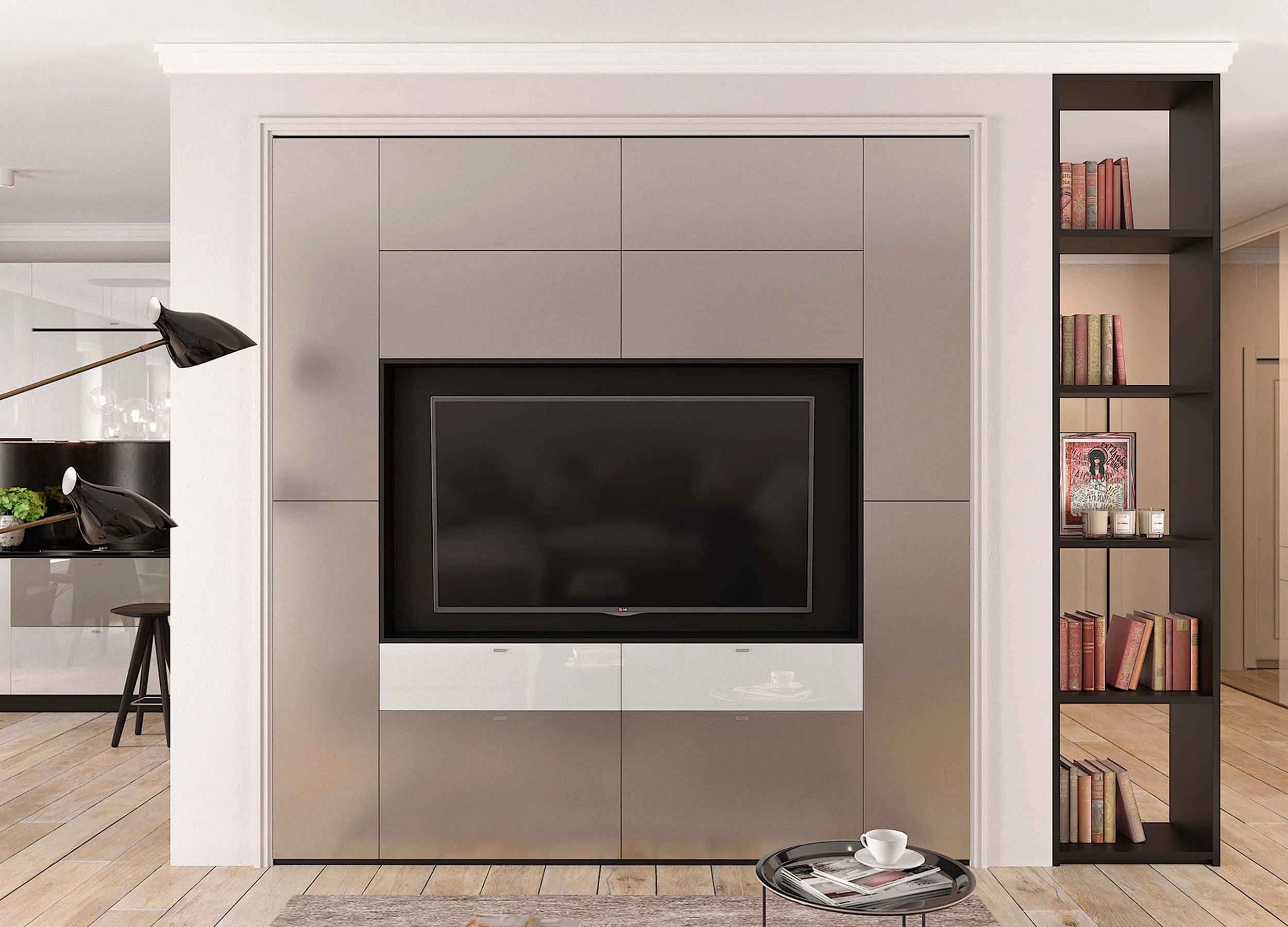 Некоторые модели предусматривают распашные отделения, используемые в качестве домашнего бара, для хранения личных вещей или посуды. Если мебель производится на заказ, можно выбрать вариант, где за такой дверью будет скрываться ниша с габаритами, достаточными под установку ТВ панели.