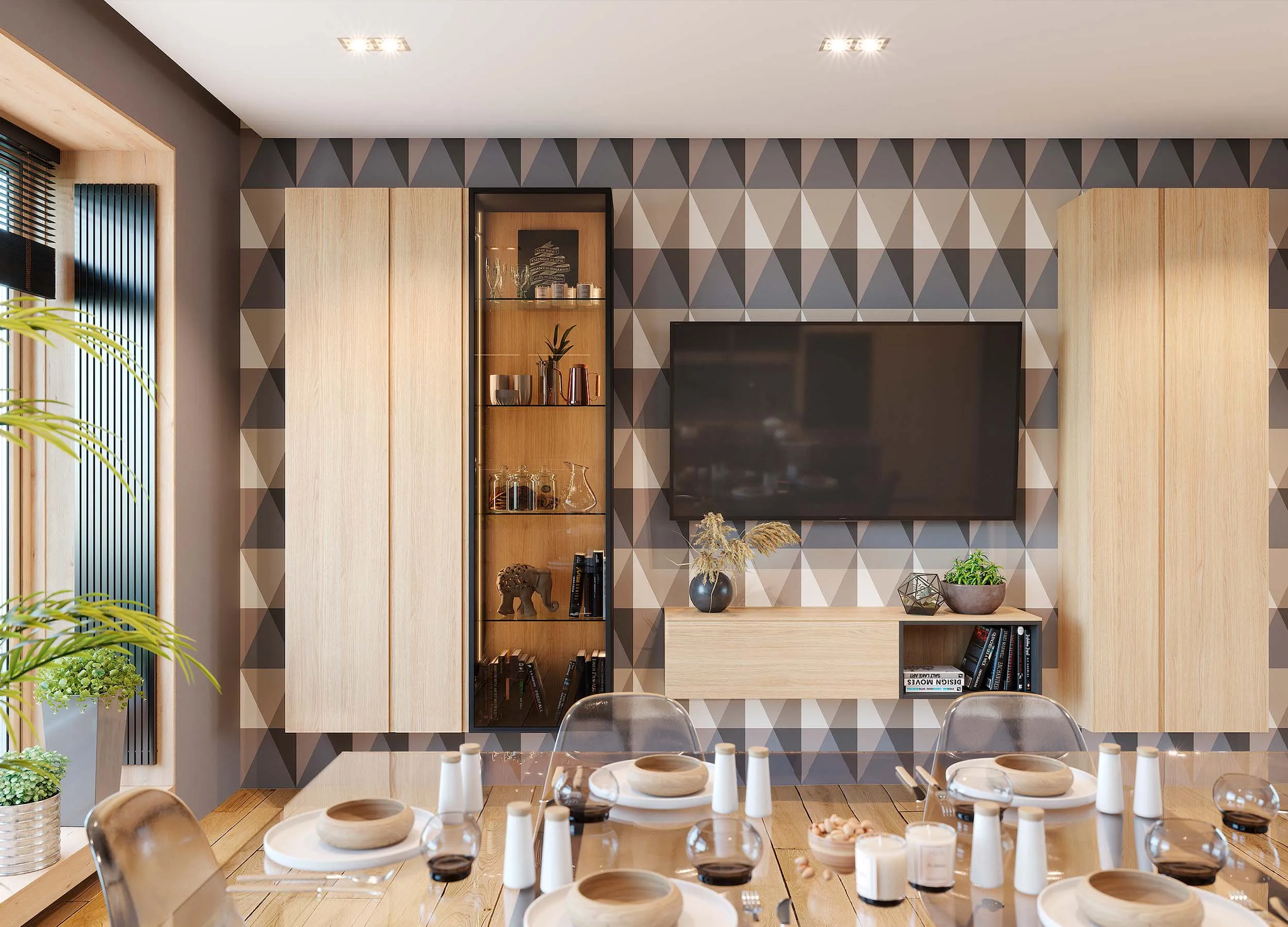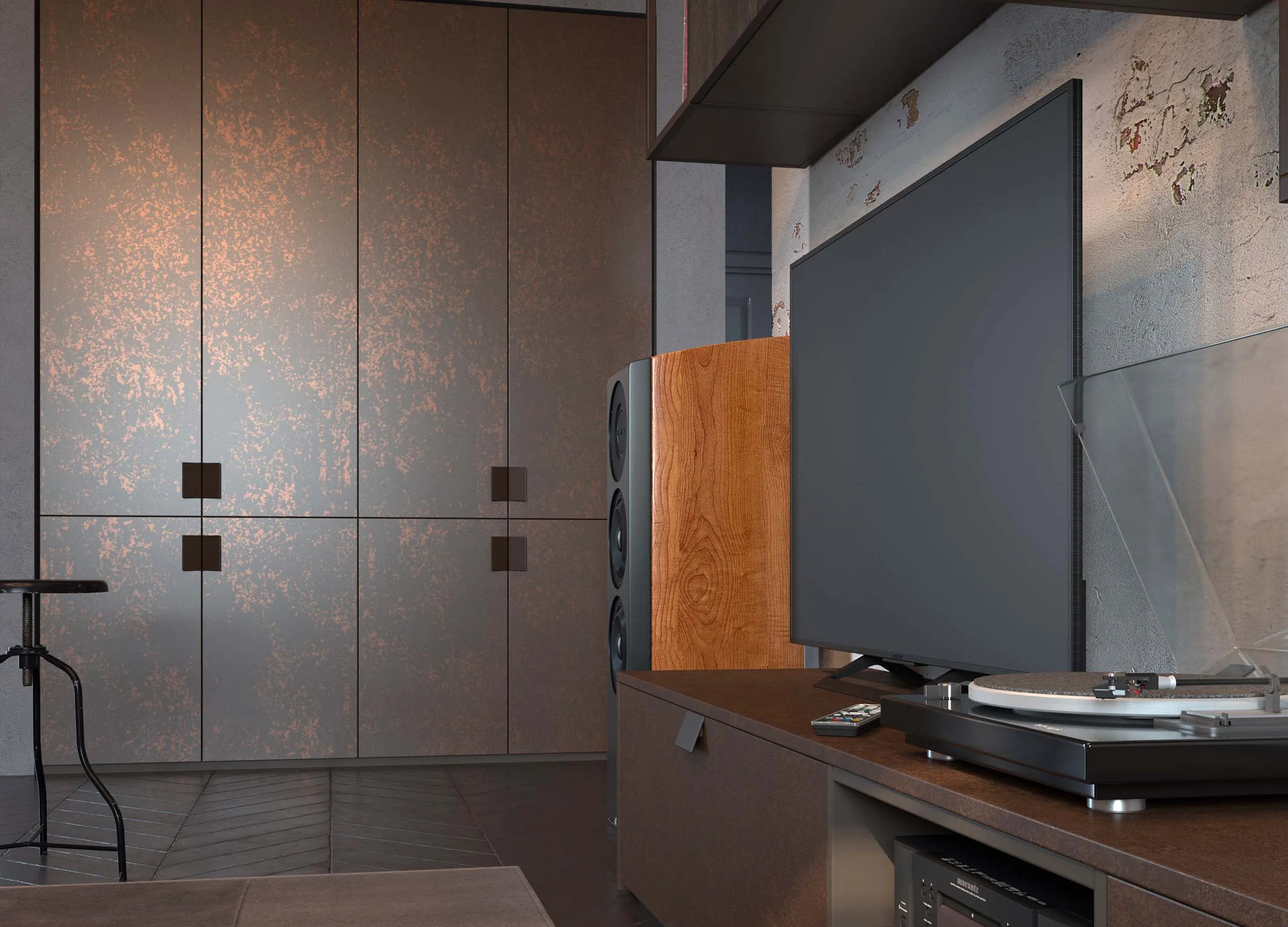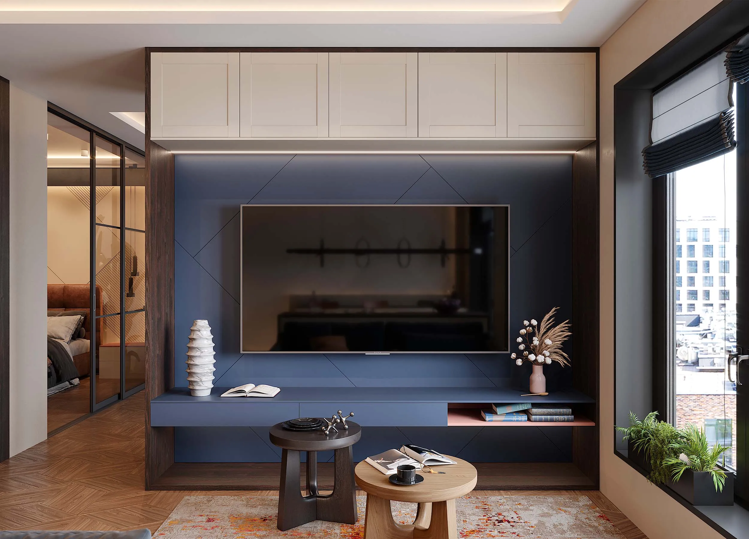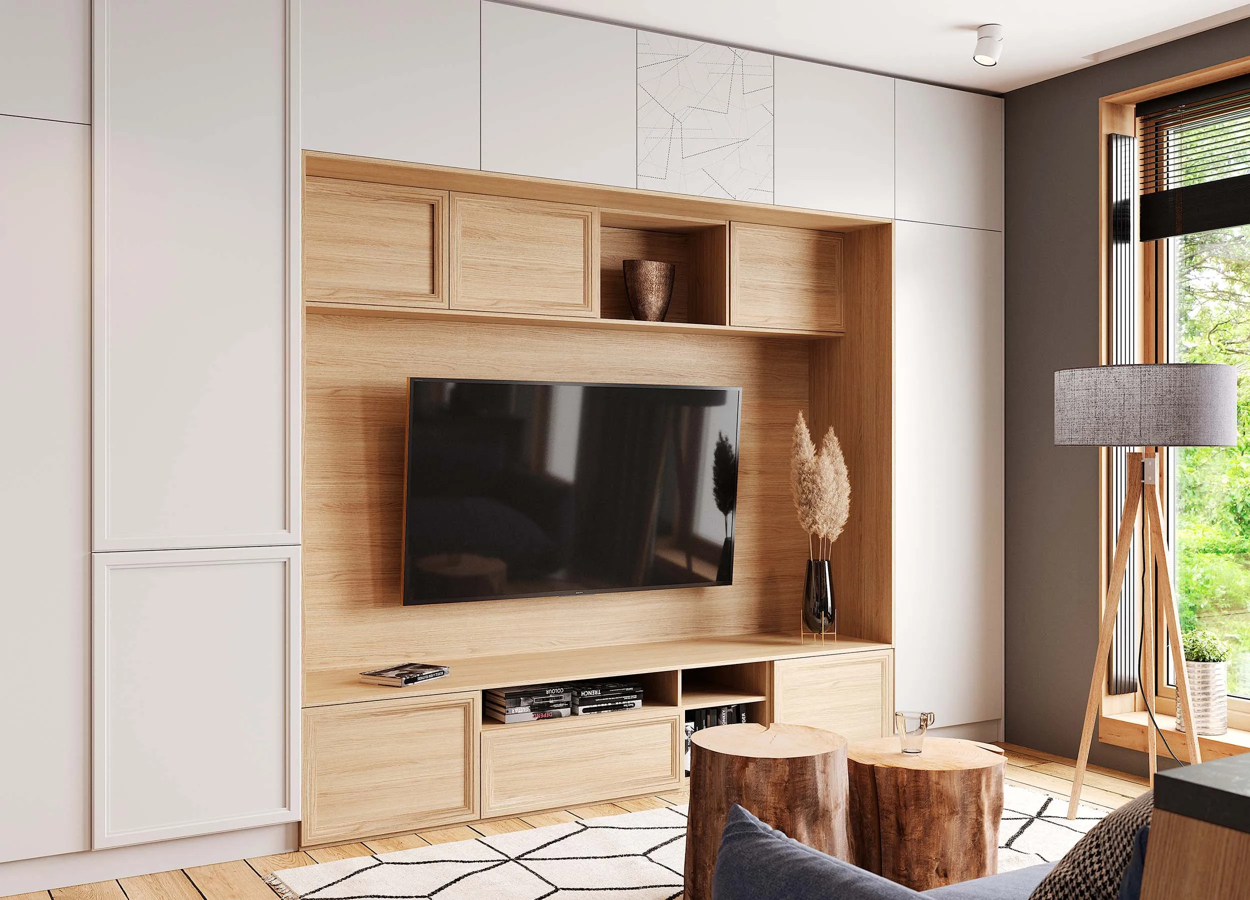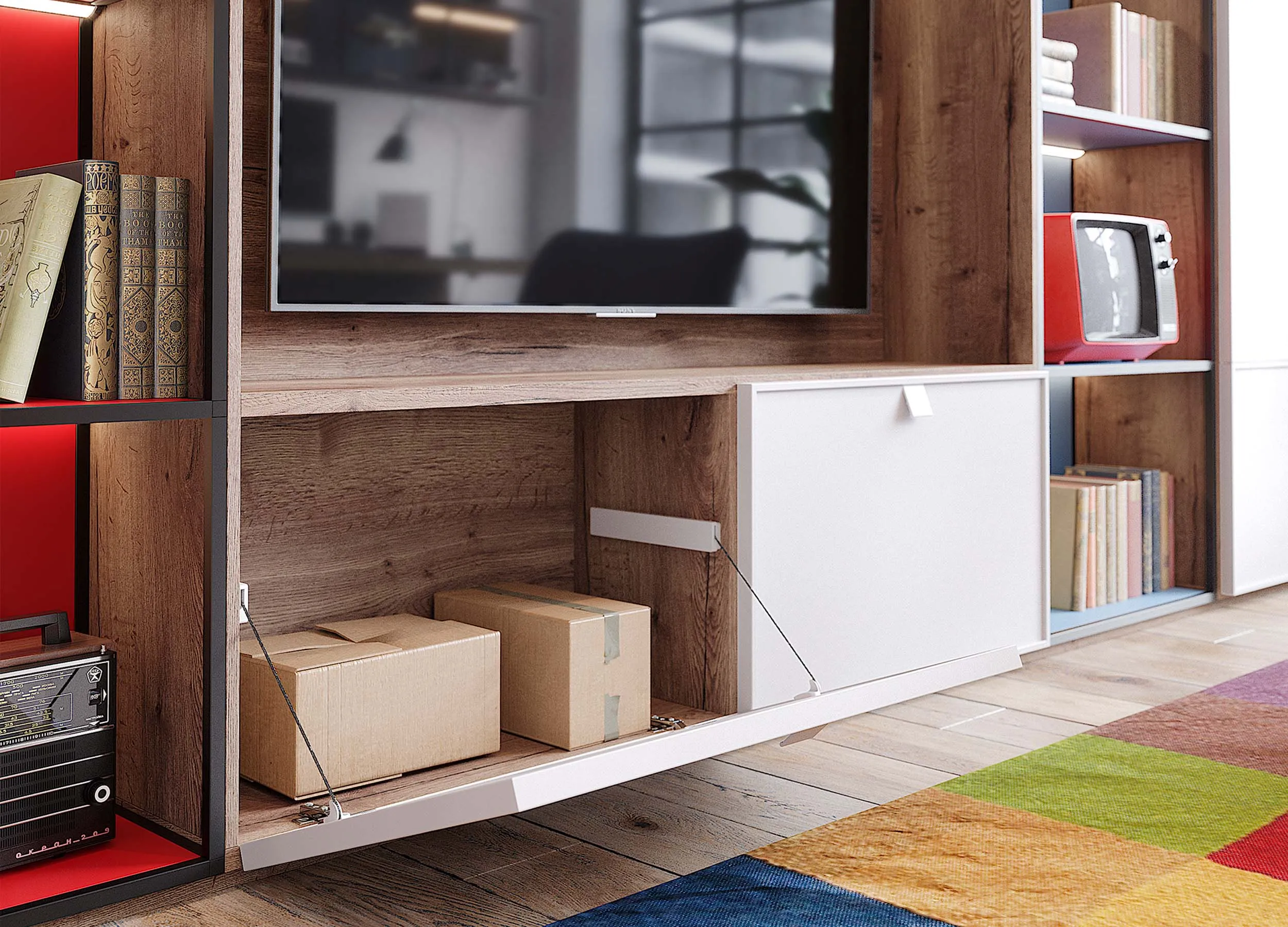 Некоторые модели предусматривают распашные отделения, используемые в качестве домашнего бара, для хранения личных вещей или посуды. Если мебель производится на заказ, можно выбрать вариант, где за такой дверью будет скрываться ниша с габаритами, достаточными под установку ТВ панели.