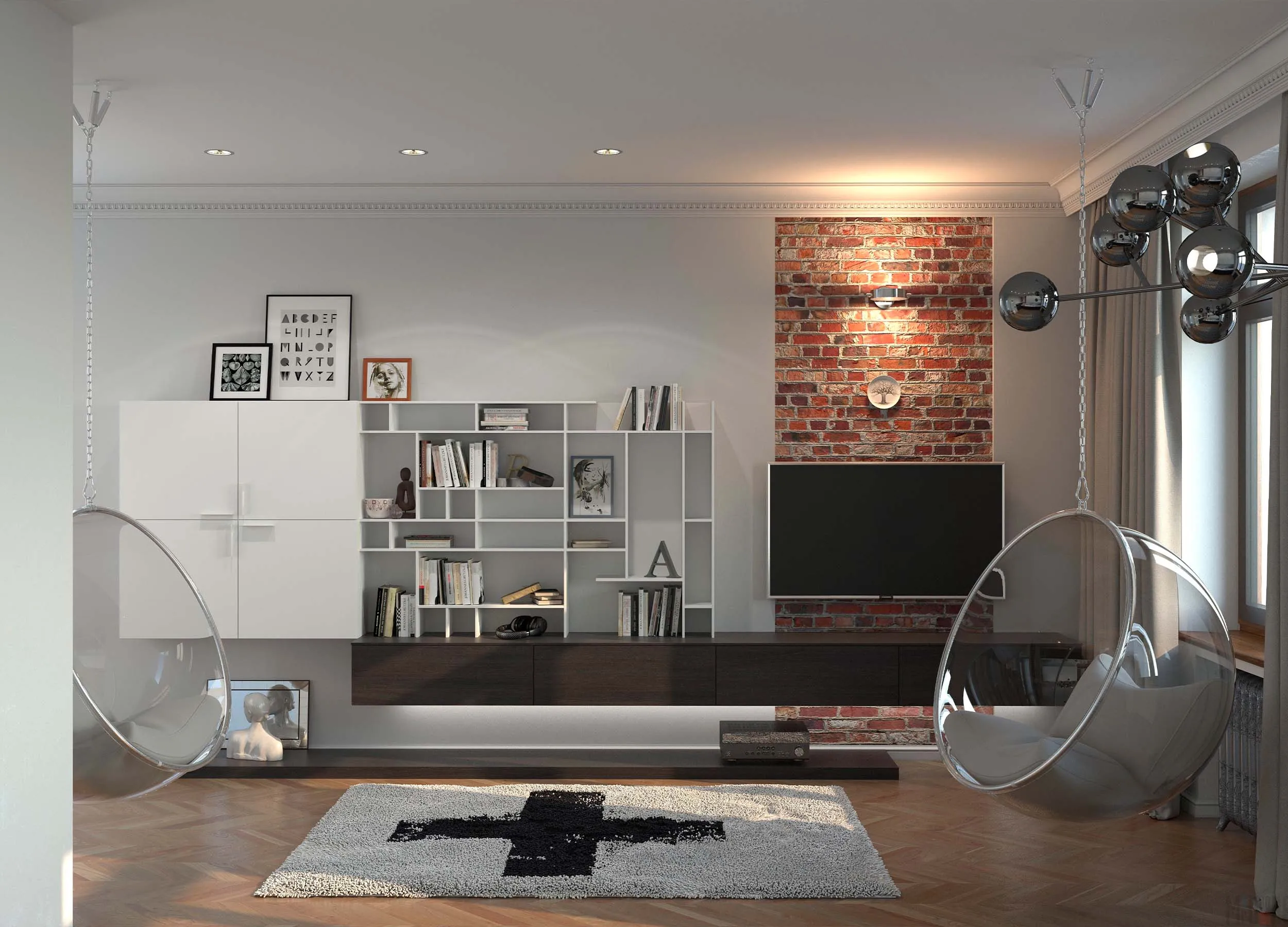Для каркаса используется облегченный алюминий, благодаря которому композиция получается визуально воздушной и легкой, совершенно не загромождающей окружающую обстановку. Преимуществом подобных систем заключается в том, что они подходят практически для любого современного интерьера, больших и малых гостиных.