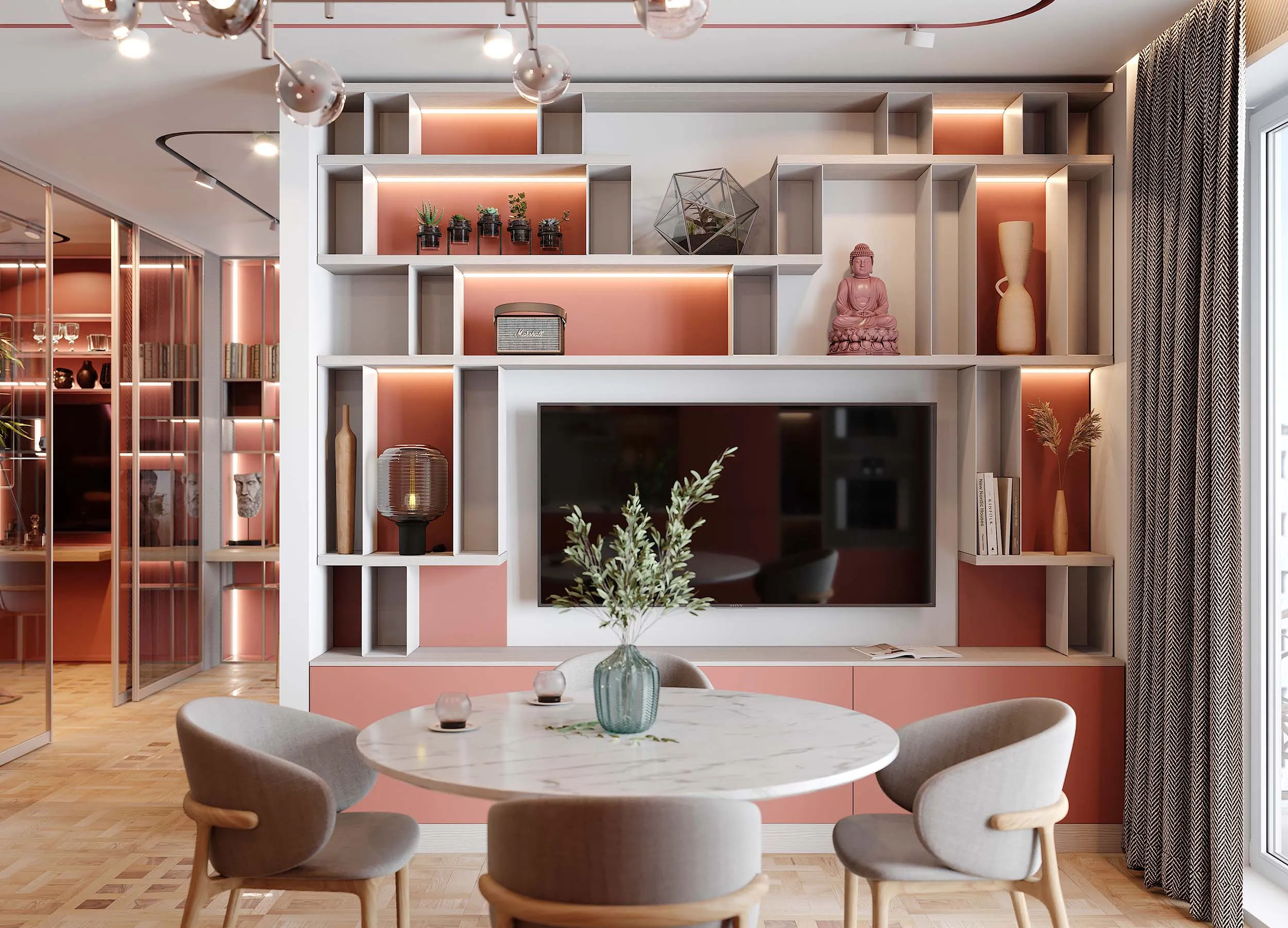 На фото стильных стенок в гостиную можно увидеть модели, предназначенные для распределения по всей комнате. Они выделяют отдельные функциональные зоны, например, для хранения посуды и других вещей, создания обеденного пространства, места для досуга.