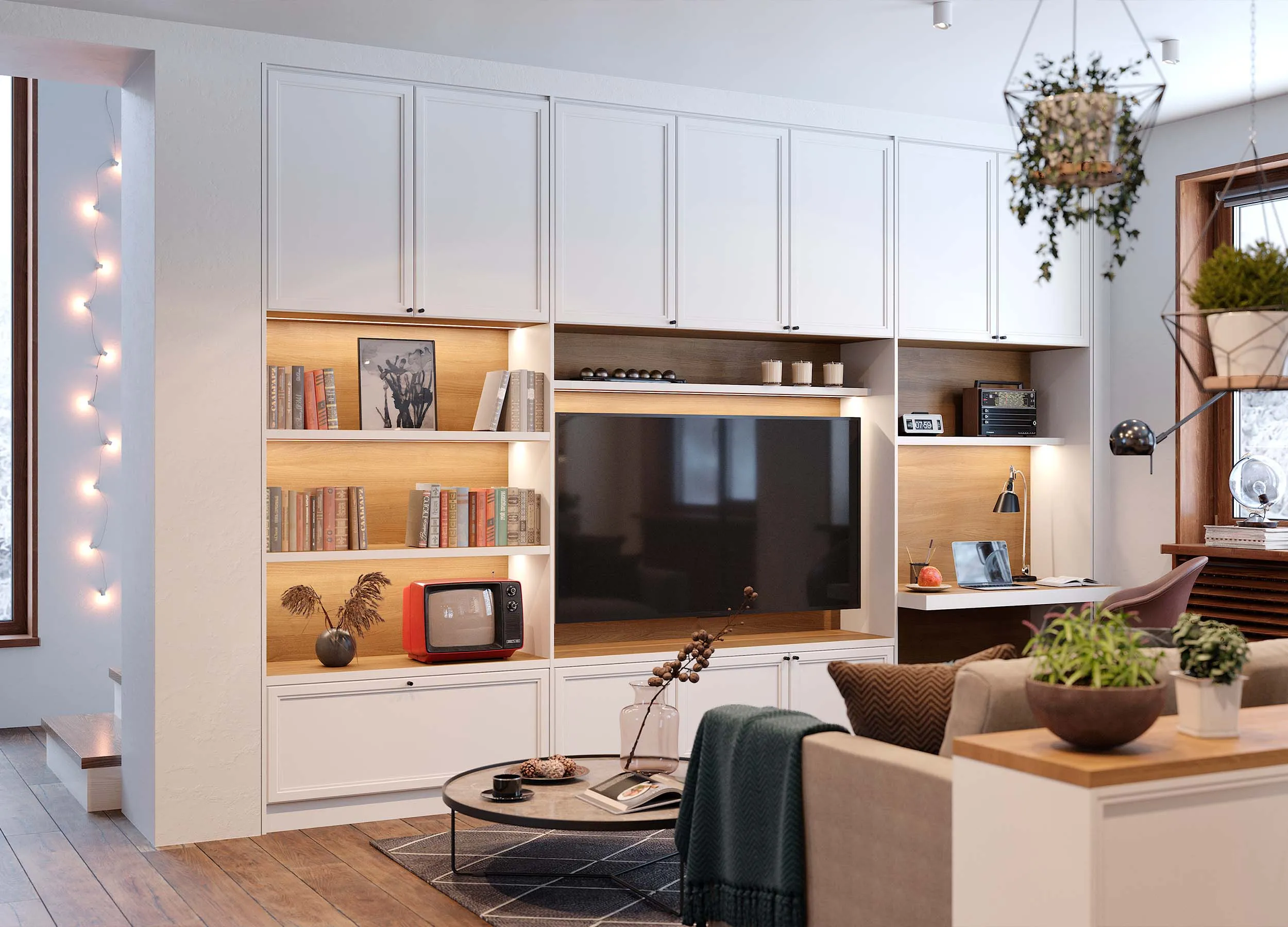 В состав гарнитура могут входить ниша для ТВ, открытые полки и закрытые антресольные шкафы, встроенный письменный стол и другие компоненты.