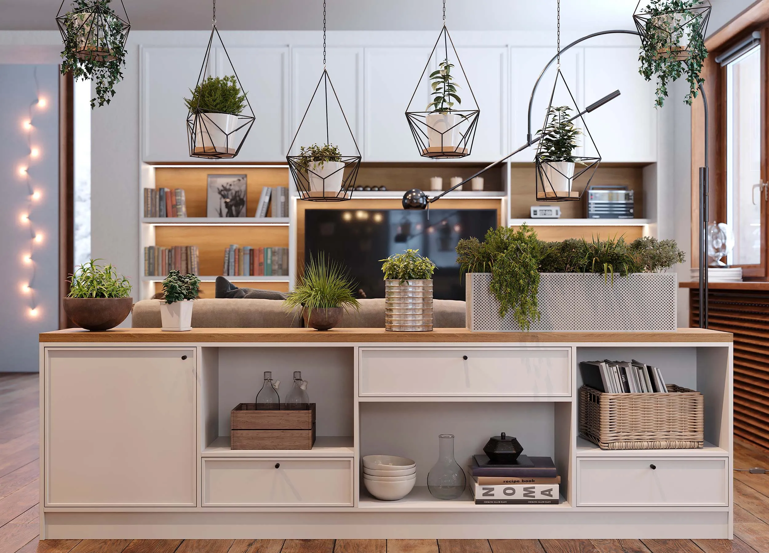 На предлагаемом фото современных стенок в зал, выполненных в стиле «Скандинавское бохо», видно эффективное сочетание классического гарнитура полной высоты вдоль одной из стен и прямая секция с широкой столешницей, установленная позади мягкого дивана в зале.