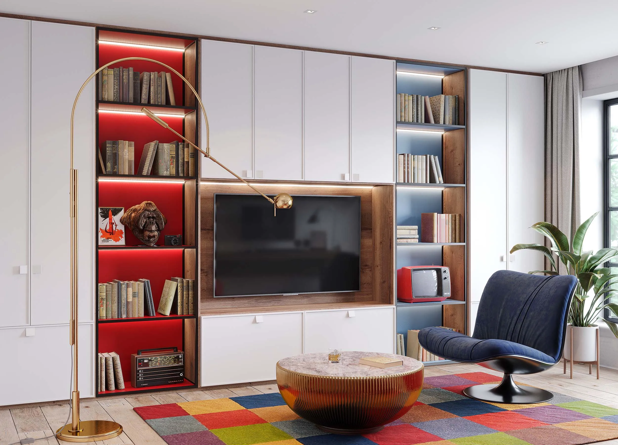 Преимуществом подобных систем является большое количество стеллажей и тумб, которые можно менять местами, ставить в различных частях комнаты. Наличие секции с полкой для телевизора дает возможность отдельно сформировать ТВ-уголок с мягкой мебелью, переставив остальные модули, правильно зонировав помещение.