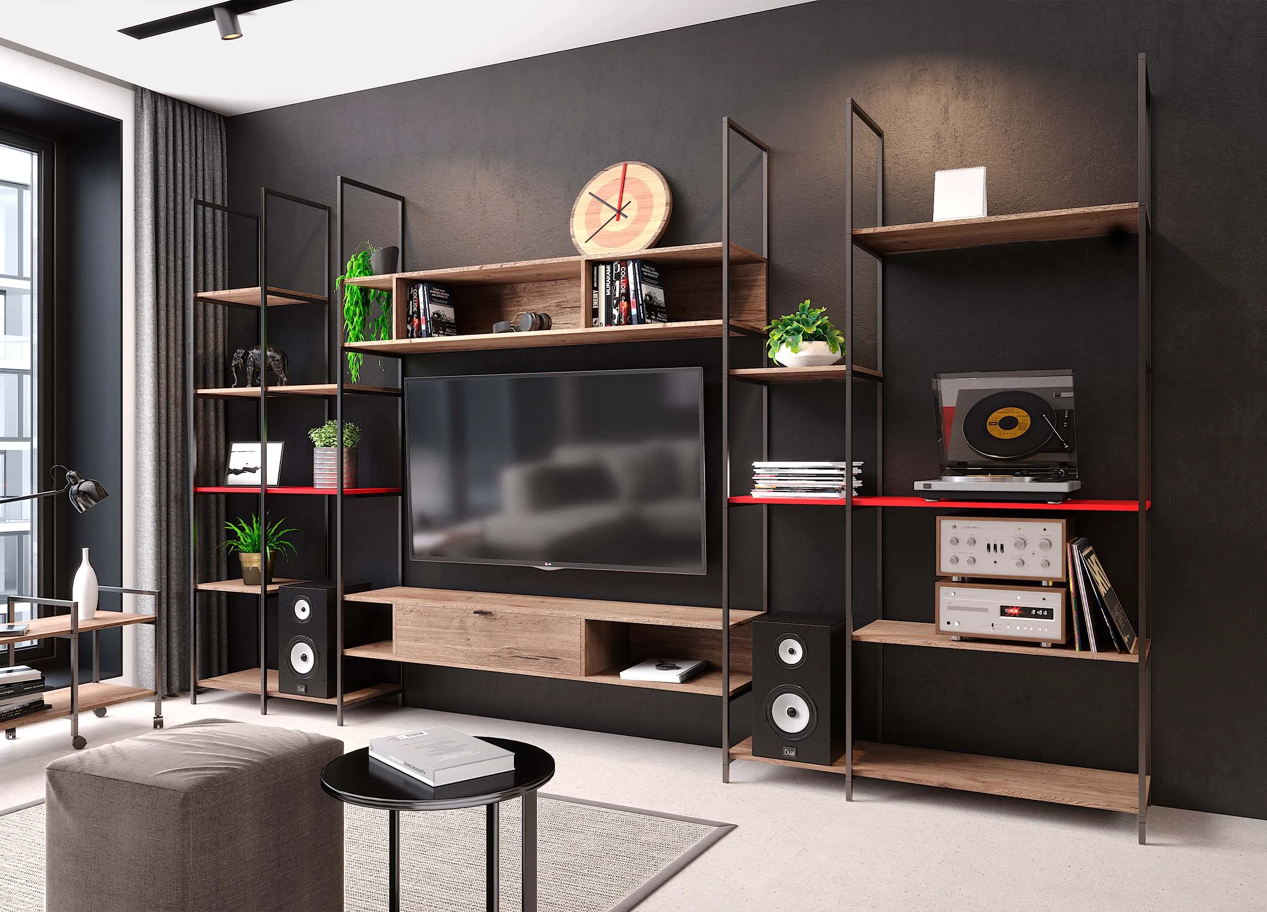Для современных интерьеров часто выбирают лаконичные и простые варианты с использованием каркасов из металла. Мебель в стиле Лофт смотрится красиво, отличается функциональностью. Стенка имеет открытые секции и полки, обеспечивая удобное размещение самых разнообразных предметов декора, книг и личных вещей.