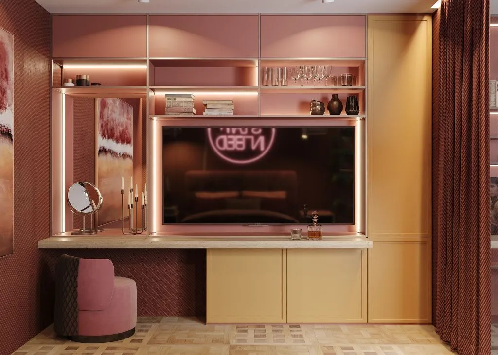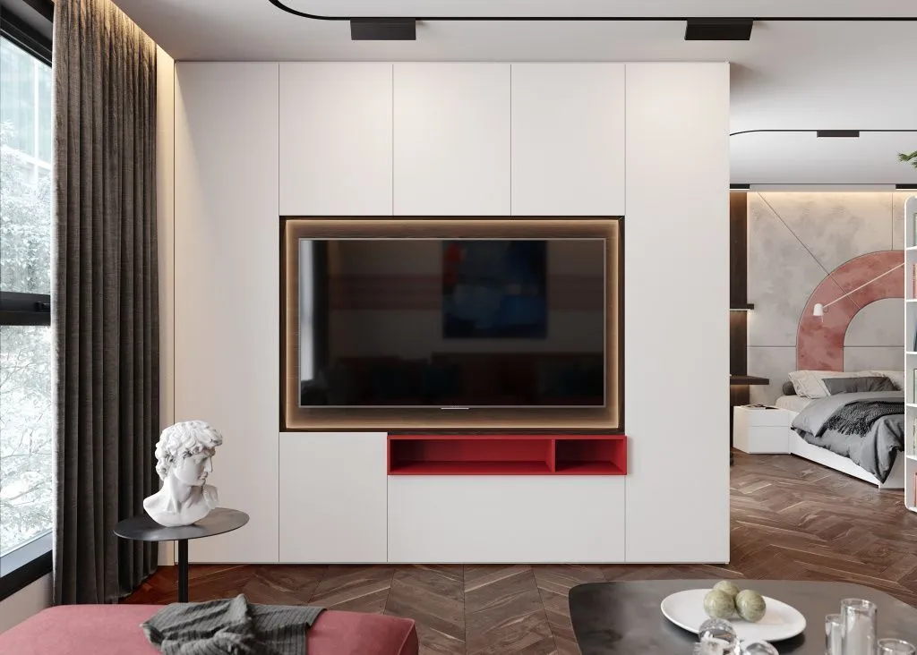 По фото спален со стенкой с нишей для телевизора бывает трудно на глаз определить размеры этого пространства – чтобы не ошибиться, обязательно уточните точные параметры перед покупкой.
