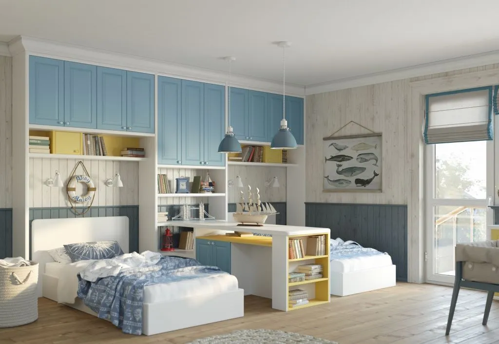 В морском стиле будет хорошо смотреться детская комната для мальчика 7-11 лет, который увлекается историями про приключения отважных героев. Выполнить такой интерьер можно по-разному. Это может быть отсылка к уточненной прогулке на ривьере, домик смотрителя маяки или кубрик пиратского брига с настоящим сундуком с сокровищами. Суть этого направления – вовлечь в игру все доступное пространство, разбудить воображение и жажду странствий.