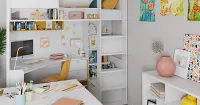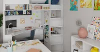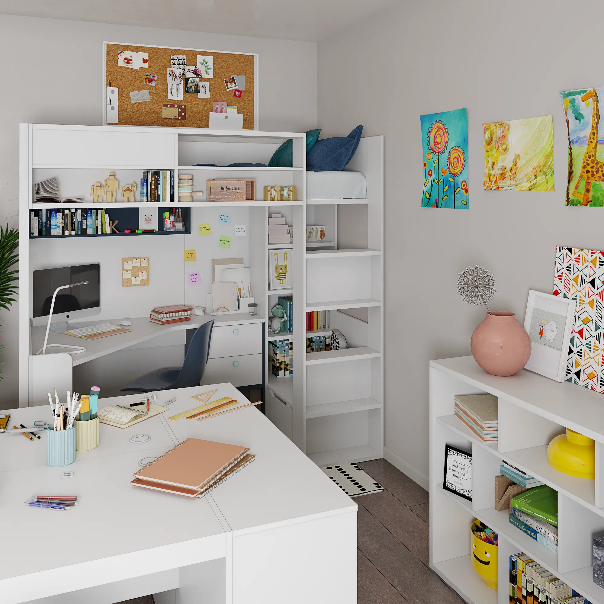 • кровать-чердак для сна Junior JSS10. На верхнем ярусе – спальное место и полки, куда удобно положить изнутри телефон или книгу. Под ним – угловой письменный стол с 2 тумбами и дополнительный стеллаж, который можно заменить на шкаф для одежды.