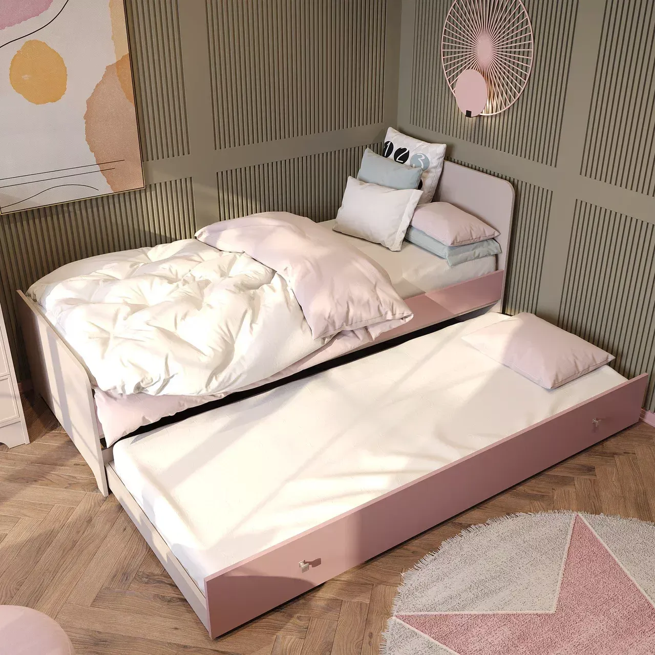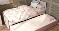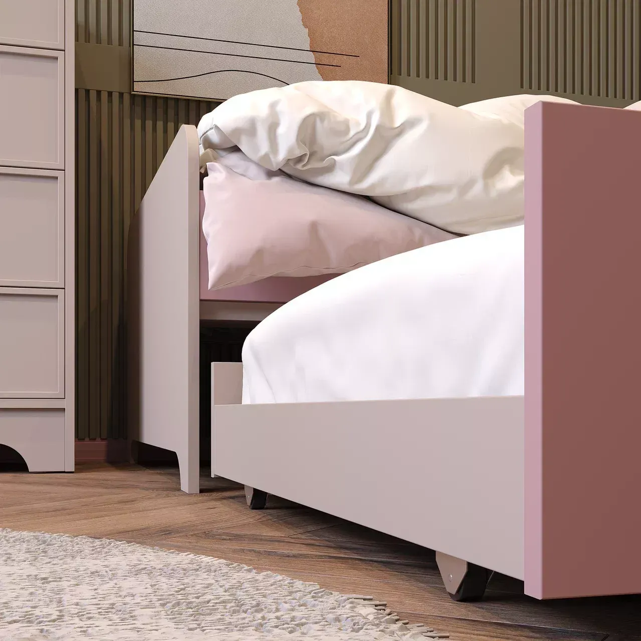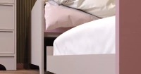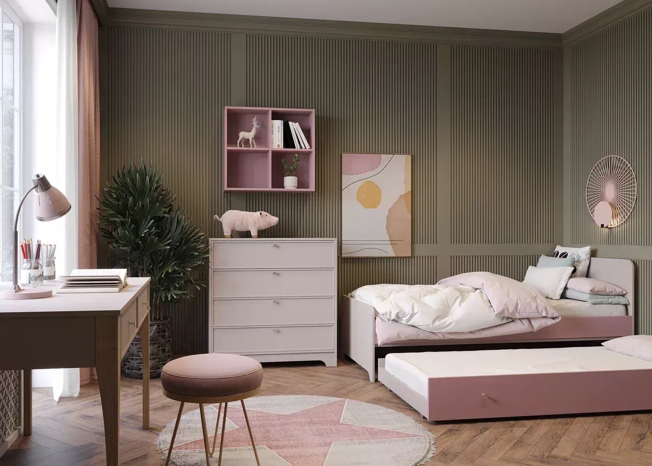 • Рамочные фасады Трей в декоре Кашемир, фасад ящика кровати, царги кровати и настенного стеллажа - ЛДСП Попурри, остальные корпусные детали комплекта - ЛДСП Кашемир, ножки стола - декор Дуб Винченца.
