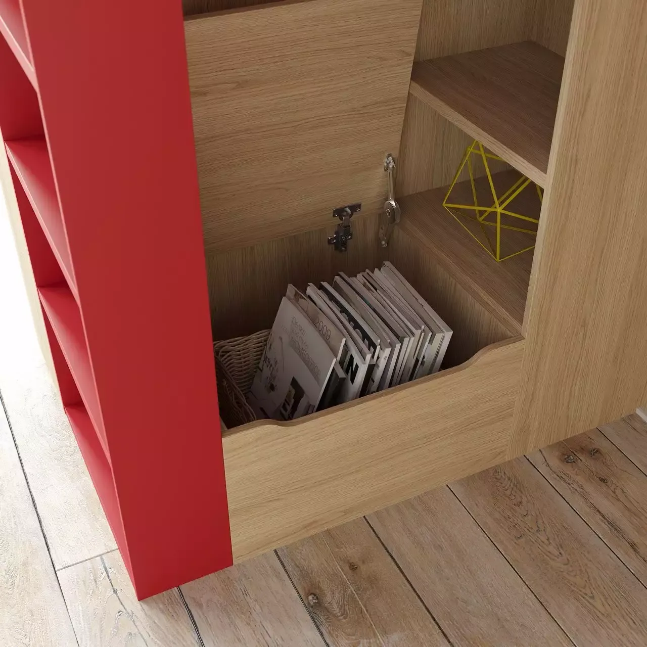 Использованы декоры "Маки" (красный), "Алебастр" (белый), "Дуб Винченца" (под дерево).
